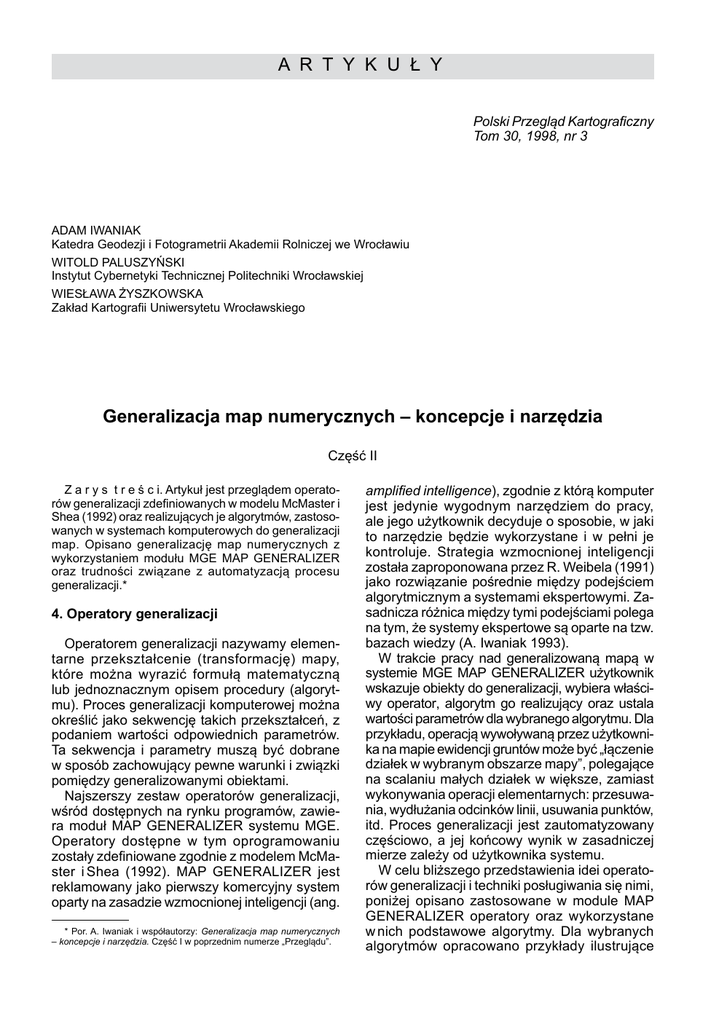 A R T Y K U Ł Y Polski Przegląd Kartograficzny Tom 30, 1998, nr 3 ADAM IWANIAK Katedra Geodezji i Fotogrametrii Akademii Rolniczej we Wrocławiu WITOLD PALUSZYŃSKI Instytut Cybernetyki Technicznej Politechniki Wrocławskiej WIESŁAWA ŻYSZKOWSKA Zakład Kartografii Uniwersytetu Wrocławskiego Generalizacja map numerycznych – koncepcje i narzędzia Część II Z a r y s t r e ś c i. Artykuł jest przeglądem operatorów generalizacji zdefiniowanych w modelu McMaster i Shea (1992) oraz realizujących je algorytmów, zastosowanych w systemach komputerowych do generalizacji map. Opisano generalizację map numerycznych z wykorzystaniem modułu MGE MAP GENERALIZER oraz trudności związane z automatyzacją procesu generalizacji.* 4. Operatory generalizacji Operatorem generalizacji nazywamy elementarne przekształcenie (transformację) mapy, które można wyrazić formułą matematyczną lub jednoznacznym opisem procedury (algorytmu). Proces generalizacji komputerowej można określić jako sekwencję takich przekształceń, z podaniem wartości odpowiednich parametrów. Ta sekwencja i parametry muszą być dobrane w sposób zachowujący pewne warunki i związki pomiędzy generalizowanymi obiektami. Najszerszy zestaw operatorów generalizacji, wśród dostępnych na rynku programów, zawiera moduł MAP GENERALIZER systemu MGE. Operatory dostępne w tym oprogramowaniu zostały zdefiniowane zgodnie z modelem McMaster i Shea (1992). MAP GENERALIZER jest reklamowany jako pierwszy komercyjny system oparty na zasadzie wzmocnionej inteligencji (ang. * Por. A. Iwaniak i współautorzy: Generalizacja map numerycznych – koncepcje i narzędzia. Część I w poprzednim numerze „Przeglądu”. amplified intelligence), zgodnie z którą komputer jest jedynie wygodnym narzędziem do pracy, ale jego użytkownik decyduje o sposobie, w jaki to narzędzie będzie wykorzystane i w pełni je kontroluje. Strategia wzmocnionej inteligencji została zaproponowana przez R. Weibela (1991) jako rozwiązanie pośrednie między podejściem algorytmicznym a systemami ekspertowymi. Zasadnicza różnica między tymi podejściami polega na tym, że systemy ekspertowe są oparte na tzw. bazach wiedzy (A. Iwaniak 1993). W trakcie pracy nad generalizowaną mapą w systemie MGE MAP GENERALIZER użytkownik wskazuje obiekty do generalizacji, wybiera właściwy operator, algorytm go realizujący oraz ustala wartości parametrów dla wybranego algorytmu. Dla przykładu, operacją wywoływaną przez użytkownika na mapie ewidencji gruntów może być „łączenie działek w wybranym obszarze mapy”, polegające na scalaniu małych działek w większe, zamiast wykonywania operacji elementarnych: przesuwania, wydłużania odcinków linii, usuwania punktów, itd. Proces generalizacji jest zautomatyzowany częściowo, a jej końcowy wynik w zasadniczej mierze zależy od użytkownika systemu. W celu bliższego przedstawienia idei operatorów generalizacji i techniki posługiwania się nimi, poniżej opisano zastosowane w module MAP GENERALIZER operatory oraz wykorzystane w nich podstawowe algorytmy. Dla wybranych algorytmów opracowano przykłady ilustrujące 164 Adam Iwaniak, Witold Paluszyński, Wiesława Żyszkowska zmianę stopnia generalizacji elementów mapy i jego zależność od wartości parametrów wymaganych przez opisywane algorytmy. Przykłady te zostały w większości zaczerpnięte z mapy zasadniczej w skali 1:1000. Należy tu zaznaczyć, że efekty funkcjonowania algorytmów nie zawsze odpowiadają oczekiwaniom kartografów, ale z tego właśnie wynika potrzeba analizowania ich działania i poszukiwania bardziej efektywnych rozwiązań. 4.1. Usuwanie elementów treści mapy Operator ten dokonuje selektywnego usuwania obiektów przez wskazanie obiektu, lub spełnienie określonego warunku, na przykład przynależności do danej klasy. Przykład na rycinie 1 ilustruje usunięcie budynków o powierzchni mniejszej niż 40 m2. 4.2. Redukcja wymiaru Ryc. 1. Eliminacja obiektów powierzchniowych – budynków o powierzchni mniejszej niż 40 m2 Fig. 1. Elimination of area objects – buildings smaller than 40 sq. m. W procesie redukcji skali wiele obiektów powierzchniowych zostaje w efekcie przedstawionych w postaci linii lub punktów. Na przykład rzeki, jeziora, lotniska, osiedla i budynki, które na mapach wielkoskalowych występują zwykle jako obiekty powierzchniowe, w mniejszych skalach mogą stać się obiektami liniowymi lub punktowymi. Redukcja powierzchni do punktu. Operator pozwala zmienić wymiar obiektu powierzchniowego 2D (użytkownik deklaruje próg wielkości powierzchni) do obiektu punktowego 0D. Realizacja tego operatora może polegać na zastąpieniu obiektu powierzchniowego znakiem punktowym, Ryc. 2. Redukcja wymiaru obiektów powierzchniowych do obiektów punktowych; a – dane początkowe; b, c – dane końcowe dla różnych wartości parametrów Fig. 2. Collapsing area objects to point objects: a – original map data, b,c – result data for different values of the algorithm’s parameters Generalizacja map numerycznych – koncepcje i narzędzia umieszczonym w środku obiektu powierzchniowego, np. zamianie obszarów zalesionych na symbol drzewa (ryc. 2). Redukcja powierzchni do linii. Ten operator zmienia obiekty powierzchniowe 2D na obiekty liniowe 1D. Przykładem jest zmiana przedstawienia rzeki z symbolu powierzchniowego na symbol liniowy. Możliwe jest zachowanie połączenia pomiędzy nowo otrzymaną linią a wcześniej wybranym obiektem liniowym. Redukcja linii do punktu pozwala zmienić wymiar jednostki obiektu liniowego 1D (o długości mniejszej od zadeklarowanej) do obiektu punktowego 0D. Do wyboru są dwa algorytmy umożliwiające wstawienie obiektu punktowego w środku linii lub w wierzchołku linii znajdującym się najbliżej punktu środkowego. Redukcja pary linii do linii pojedynczej. Działanie operatora uzależnione jest od wartości parametrów: minimalnego i maksymalnego ods