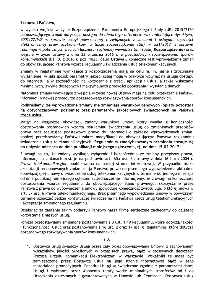 Szanowni Państwo, w wyniku wejścia w życie Rozporządzenia Parlamentu Europejskiego i Rady (UE) 2015/2120 ustanawiającego środki dotyczące dostępu do otwartego Internetu oraz zmieniające dyrektywę 2002/22/WE w sprawie usługi powszechnej i związanych z sieciami i usługami łączności elektronicznej praw użytkowników, a także rozporządzenie (UE) nr 531/2012 w sprawie roamingu w publicznych sieciach łączności ruchomej wewnątrz Unii (dalej Rozporządzenie) oraz wejścia w życie ustawy z dnia 23 września 2016 r. o pozasądowym rozwiązywaniu sporów konsumenckich (Dz. U. z 2016 r. poz. 1823; dalej Ustawa), konieczne jest wprowadzenie zmian do obowiązującego Państwa wzorca regulaminu świadczenia usług telekomunikacyjnych. Zmiany w regulaminie wynikające z Rozporządzenia mają na celu m. in. jasne i zrozumiałe wyjaśnienie, w jaki sposób parametry jakości usług mogą w praktyce wpłynąć na usługę dostępu do Internetu, a w szczególności na korzystanie z treści, aplikacji i usług, a także wskazanie minimalnych, zwykle dostępnych i maksymalnych prędkości pobierania i wysyłania danych. Natomiast zmiany wynikające z wejścia w życie nowej Ustawy mają na celu przekazanie Państwu informacji o nowej procedurze pozasądowego rozwiązywania sporów konsumenckich. Podkreślamy, że wprowadzone zmiany nie zmieniają warunków cenowych (opłaty pozostają na dotychczasowym poziomie) oraz parametrów jakościowych świadczonych na Państwa rzecz usług. Mając na względzie obowiązek zmiany warunków umów, który wynika z konieczności dostosowania postanowień wzorca regulaminu świadczenia usług do zmienionych przepisów prawa oraz realizując podstawowe prawo do informacji o zakresie wprowadzonych zmian, poniżej przedstawiamy Państwu zakres modyfikacji do obowiązującego Państwa regulaminu świadczenia usług telekomunikacyjnych. Regulamin w zmodyfikowanym brzmieniu stosuje się po upływie miesiąca od dnia publikacji niniejszego ogłoszenia, tj. od dnia 15.02.2017. Z uwagi na to, że zmiany wynikają wyłącznie i bezpośrednio ze zmiany przepisów prawa, informacja o zmianach zostaje na podstawie art. 60a ust. 3a ustawy z dnia 16 lipca 2004 r. Prawo telekomunikacyjne opublikowana na naszej stronie internetowej. W przypadku braku akceptacji proponowanych zmian, mają Państwo prawo do pisemnego wypowiedzenia aktualnie obowiązującej umowy o świadczenie usług telekomunikacyjnych w terminie do jednego miesiąca od dnia publikacji niniejszego ogłoszenia. Jednocześnie informujemy, że z uwagi na konieczność dostosowania wzorca regulaminu do obowiązującego stanu prawnego, skorzystanie przez Państwa z prawa do wypowiedzenia umowy spowoduje konieczność zwrotu ulgi, o której mowa w art. 57 ust. 6 Prawa telekomunikacyjnego. Brak pisemnego wypowiedzenia umowy w powyższym terminie oznaczać będzie kontynuację świadczenia na Państwa rzecz usług telekomunikacyjnych i akceptację zmienionego regulaminu. Dziękując za zaufanie jakim obdarzyli Państwo naszą firmę serdecznie zachęcamy do dalszego korzystania z naszych usług. Poniżej przedstawiamy zmienione postanowienia § 3 ust. 1-10 Regulaminu, które dotyczą jakości i funkcjonalności Usług oraz postanowienia § 16 ust. 2 oraz 17 ust. 8 Regulaminu, które dotyczą pozasądowego rozwiązywania sporów konsumenckich. § 3. 1. Dostawca usług świadczy Usługi przez cały okres obowiązywania Umowy, z zachowaniem wskaźników jakości określonych w przepisach prawa, bądź w stosownych decyzjach Prezesa Urzędu Komunikacji Elektronicznej w Warszawie. Wskaźniki te mogą być zamieszczone przez Dostawcę usług na jego stronie internetowej bądź w jego materiałach promocyjnych. Ponadto Usługi są świadczone zgodnie z parametrami danej Usługi i wybranej przez Abonenta taryfy wedle minimalnych transferów od i do Urządzenia określonych i gwarantowanych w Umowie lub Cennikach. Dostawca usług gwarantuje jakość parametrów przepustowości Usługi internetowej dla danych wysyłanych i odbieranych na minimalnym poziomie 50 %. deklarowanej w Umowie prędkości. Zwykle dostępna prędkość (przez co najmniej 80 % doby) stanowi 75 % prędkości deklarowanej. Deklarowana w Umowie prędkość pobierania i wysyłania danych stanowi prędkość maksymalną, której uzyskania Abonent może oczekiwać co najmniej raz na dobę. Niezachowanie powyższych parametrów przepustowości stanowi nienależyte wykonanie Umowy, za które Dostawca usług ponosi odpowiedzialność zgodnie z § 12. Prędkości pobierania danych i prędkości wysyłania danych, mierzone są za pomocą testów dostępnych na stronie internetowej pod adresem http://speedtest.3play.pl za pomocą urządzenia serwisowego Dostawcy usług podłączonego do Sprzętu w Lokalu Abonenta. Strona testowa zapewnia poprawną prędkość pomiaru do 100 Mbit/s. Z uwagi na to, że świadczenie Usług telewizji oparte jest na protokole IP (Usługi mają charakter telewizji IPTV) Dostawca usług gwarantuje ich jakość wedle parametrów przepustowości transmisji danych jak dla Usługi internetowej. 2. Zależnie od wybranej przez Abonenta oferty, prędkość pobierania i wysyłania danych różni się. Przykładowo, plik wideo o rozmiarze 1 GB zostanie pobrany w czasie: 1 min 22 s. dla Usługi, której prędkość pobierania wynosi 100 Mb/s lub 13 min 39 s. dla Usługi, której prędkość pobierania wynosi 10 Mb/s przy maksymalnej dostępnej prędkości pobierania danych. Przy przepustowości na poziomie minimalnym, czas pobierania będzie odpowiednio dłuższy, zgodnie parametrami wskazanymi w ust. 1. Prędkość wysyłania danych również różni się w zależności od wyboru oferty. Wybór Usługi o przepustowości pobierania niższej niż 10 Mb/s może uniemożliwić korzystanie z niektórych treści i aplikacji wymagających wyższych przepustowości, takich jak odtwarzanie on-line treści w jakości HD, korzystanie z komunikatorów