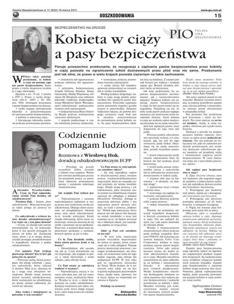 www.gu.com.pl Gazeta Ubezpieczeniowa nr 11 (622) 15 marca 2011 15 ODSZKODOWANIA BEZPIECZEŃSTWO NA DRODZE Kobieta w ciąży a pasy bezpieczeństwa Polsce także pokutuje przekonanie, że kobiety w ciąży nie powinny zapinać pasów bezpieczeństwa. Samo prawo o ruchu drogowym zwalnia je z tego obowiązku. Zgodnie z art. 39 ust. 2 ustawy z 1997 r. Prawo o ruchu drogowym (Dz.U. 2005 r. Nr 108, poz. 908) obowiązek korzystania z pasów bezpieczeństwa nie dotyczy: • osoby mającej zaświadczenie lekarskie o przeciwwskazaniu do używania pasów bezpieczeństwa, • kobiety o widocznej ciąży, • kierującego taksówką osobową podczas przewożenia pasażera, W Panuje powszechne przekonanie, że rezygnacja z zapinania pasów bezpieczeństwa przez kobiety w ciąży pozwala na ograniczenie szkód doznawanych przez płód oraz nie same. Przekonanie jest tak silne, że prawo w wielu krajach pozwala ciężarnym na takie zachowanie. • instruktora lub egzaminatora podczas szkolenia lub egzaminowania, • policjanta, funkcjonariusza Urzędu Ochrony Państwa, Straży Granicznej i Służby Więziennej, żołnierza Sił Zbrojnych oraz żołnierza jednostki wojskowej podporządkowanej Ministrowi Spraw Wewnętrznych i Administracji – podczas przewożenia osób zatrzymanych, • funkcjonariusza Biura Ochrony Rządu podczas wykonywania czynności służbowych, • zespołu medycznego w czasie udzielania pomocy medycznej, • konwojenta podczas przewożenia wartości pieniężnych, • osoby chorej lub niepełnosprawnej przewożonej na noszach lub w wózku inwalidzkim. Według kodeksu drogowego, kobiety w ciąży mogą jeździć samochodem bez zapiętych pasów bezpieczeństwa. Przeciwko zapinaniu pasów przemawia wygoda i groźba pożaru w samochodzie. Zdaniem większości lekarzy, do połowy drugiego trymestru ciąży brak jest w zasadzie przeciwwskazań do prowadzenia przez kobiety auta, bo pasy bezpieczeństwa ideal- Codziennie pomagam ludziom Rozmowa z Wiesławą Huk, doradcą odszkodowawczym ECPP – Przydają się przede wszystkim dobry kontakt z ludźmi oraz empatia. Ważne jest również perfekcyjne poznanie przepisów prawa, co umożliwia właściwe prowadzenie sprawy i uzyskanie należnego odszkodowania. leksandra Wysocka-Zańko: – Czym się Pani zajmowała, zanim została Pani doradcą odszkodowawczym? Wiesława Huk: – Jestem „dwuzawodowcem”. Moja pierwsza praca także polega na pomocy ludziom. A Co zadecydowało o wyborze kariery doradcy odszkodowawczego? Czy wiąże się z tym jakaś historia? – O tym, że istnieje taki zawód, dowiedziałam się od koleżanki, która w ten sposób pomagała ludziom od kilku lat. Zachęcała mnie, abym i ja w swojej okolicy zaczęła pomagać poszkodowanym w wypadkach, walczyć o godne odszkodowanie. Czy pamięta Pani swojego pierwszego klienta? Kto to był i jak potoczyła się sprawa? – Pierwszą osobą, której pomogłam, był młody człowiek – pasażer samochodu, który uderzył w drzewo. Miał m.in. złamaną rękę i nogę oraz obrażenie wewnętrzne. Dzięki mojej pomocy dostał wysokie odszkodowanie, które wystarczyło na rehabilitację, po której niemal całkowicie powrócił do zdrowia. Jaka wiedza i umiejętności są potrzebne w tym zawodzie? Jak wygląda Pani tydzień pracy? – Najważniejszym i zarazem najtrudniejszym zadaniem w mojej pracy jest znalezienie osoby poszkodowanej. Dlatego dzień zaczynam od przeglądnięcia lokalnej prasy oraz stron internetowych, m.in. kroniki policyjnej. Kiedy znajdę informację, która mnie zainteresuje, wówczas dzwonię do tej osoby i umawiam się na spotkanie. Poza tym, w każdym dniu mam zaplanowane spotkanie z osobami, których sprawy są już w toku. Co by Pani doradziła osobie, która stawia pierwsze kroki w tej branży? – Doradziłabym, aby zaczęła tak jak ja. Czyli dowiedziała się od znajomego, jak wygląda ta praca, a także skorzystała z wielu szkoleń, jakie oferuje firma. Co Pani uważa za największą trudność w tej pracy? – Najtrudniejszą rzeczą w naszym zawodzie jest, jak już wspomniałam wyżej, znalezienie klienta. Wynika to m.in. z dużej konkurencji na rynku odszkodowań. Kolejną trudnością jest także niewiedza osób, które uległy wypadkowi, jakie mają prawa do odszkodowania. Co Pani uważa za swój największy zawodowy sukces? – Za mój największy sukces w dotychczasowej pracy uważam pomoc trzydziestokilkuletniemu mężczyźnie, który po wypadku został przykuty do wózka inwalidzkiego. Dzięki mojej pomocy i odszkodowaniu, jakie otrzymał, może jeździć na rehabilitację i kolejne operacje do odległego o kilkaset kilometrów Otwocka. Zabiegi te przynoszą pierwsze efekty i ten mężczyzna powoli zaczyna chodzić, na razie z pomocą „balkonika”. Widok tego mężczyzny, który jeszcze nie tak dawno był skazany na wózek inwalidzki, a teraz jest nadzieja na to, że będzie poruszał się o własnych siłach, jest największą zapłatą za moją pracę. Jakie są Pani cele zawodowe na ten rok? – W tym roku zamierzam przede wszystkim doprowadzić do końca te sprawy, które rozpoczęły się w roku ubiegłym. Planuję jeszcze skuteczniej pracować i pomagać poszkodowanym, nie ukrywam, że motywować mnie do tego będzie nagroda, jaką oferuje dla najlepszych ECPP. W tym roku jest to tygodniowa wycieczka do Turcji. Może dodam, że w minionym roku udało mi się być w gronie najlepszych pracowników firmy, dzięki temu, pierwszy raz w życiu, byłam na wspaniałej wycieczce w Egipcie. Dziękuję za rozmowę! Aleksandra Wysocka-Zańko nie leżą na miednicy. Z czasem jednak brzuch jest większy i trudniej zapiąć pas. Brzuch utrudnia również ruchy za kierownicą. Jak więc podróżować, by zapewnić bezpieczeństwo zarówno mamie, jak i nienarodzonemu dziecku? Niektóre kobiety nie zapinają pasów bezpieczeństwa w ciąży, bo bez pasów jeździ się im wygodniej. Niepokoją się też, że silny ucisk pasów podczas nagłego ma