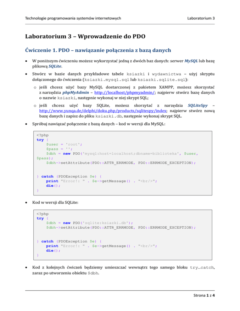 Ćwiczenie 1. PDO – nawiązanie połączenia z bazą danych
