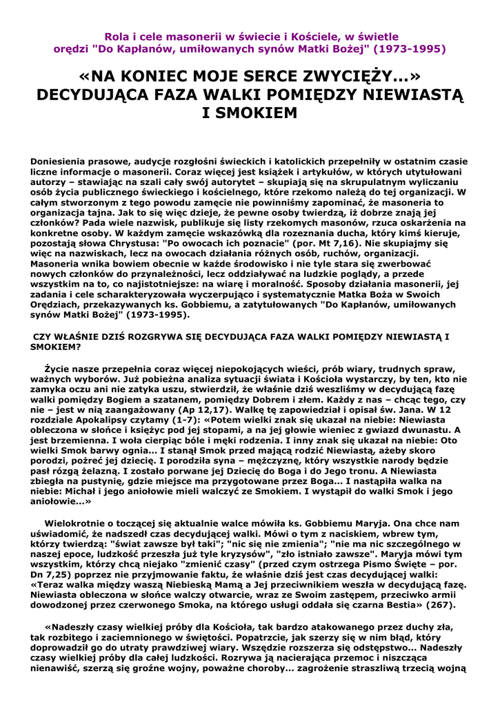 Rola i cele masonerii w świecie i Kościele, w świetle orędzi "Do Kapłanów, umiłowanych synów Matki Bożej" (1973-1995) «NA KONIEC MOJE SERCE ZWYCIĘŻY...» DECYDUJĄCA FAZA WALKI POMIĘDZY NIEWIASTĄ I SMOKIEM Doniesienia prasowe, audycje rozgłośni świeckich i katolickich przepełniły w ostatnim czasie liczne informacje o masonerii. Coraz więcej jest książek i artykułów, w których utytułowani autorzy – stawiając na szali cały swój autorytet – skupiają się na skrupulatnym wyliczaniu osób życia publicznego świeckiego i kościelnego, które rzekomo należą do tej organizacji. W całym stworzonym z tego powodu zamęcie nie powinniśmy zapominać, że masoneria to organizacja tajna. Jak to się więc dzieje, że pewne osoby twierdzą, iż dobrze znają jej członków? Pada wiele nazwisk, publikuje się listy rzekomych masonów, rzuca oskarżenia na konkretne osoby. W każdym zamęcie wskazówką dla rozeznania ducha, który kimś kieruje, pozostają słowa Chrystusa: "Po owocach ich poznacie" (por. Mt 7,16). Nie skupiajmy się więc na nazwiskach, lecz na owocach działania różnych osób, ruchów, organizacji. Masoneria wnika bowiem obecnie w każde środowisko i nie tyle stara się zwerbować nowych członków do przynależności, lecz oddziaływać na ludzkie poglądy, a przede wszystkim na to, co najistotniejsze: na wiarę i moralność. Sposoby działania masonerii, jej zadania i cele scharakteryzowała wyczerpująco i systematycznie Matka Boża w Swoich Orędziach, przekazywanych ks. Gobbiemu, a zatytułowanych "Do Kapłanów, umiłowanych synów Matki Bożej" (1973-1995). CZY WŁAŚNIE DZIŚ ROZGRYWA SIĘ DECYDUJĄCA FAZA WALKI POMIĘDZY NIEWIASTĄ I SMOKIEM? Życie nasze przepełnia coraz więcej niepokojących wieści, prób wiary, trudnych spraw, ważnych wyborów. Już pobieżna analiza sytuacji świata i Kościoła wystarczy, by ten, kto nie zamyka oczu ani nie zatyka uszu, stwierdził, że właśnie dziś weszliśmy w decydującą fazę walki pomiędzy Bogiem a szatanem, pomiędzy Dobrem i złem. Każdy z nas – chcąc tego, czy nie – jest w nią zaangażowany (Ap 12,17). Walkę tę zapowiedział i opisał św. Jana. W 12 rozdziale Apokalipsy czytamy (1-7): «Potem wielki znak się ukazał na niebie: Niewiasta obleczona w słońce i księżyc pod jej stopami, a na jej głowie wieniec z gwiazd dwunastu. A jest brzemienna. I woła cierpiąc bóle i męki rodzenia. I inny znak się ukazał na niebie: Oto wielki Smok barwy ognia... I stanął Smok przed mającą rodzić Niewiastą, ażeby skoro porodzi, pożreć jej dziecię. I porodziła syna – mężczyznę, który wszystkie narody będzie pasł rózgą żelazną. I zostało porwane jej Dziecię do Boga i do Jego tronu. A Niewiasta zbiegła na pustynię, gdzie miejsce ma przygotowane przez Boga... I nastąpiła walka na niebie: Michał i jego aniołowie mieli walczyć ze Smokiem. I wystąpił do walki Smok i jego aniołowie...» Wielokrotnie o toczącej się aktualnie walce mówiła ks. Gobbiemu Maryja. Ona chce nam uświadomić, że nadszedł czas decydującej walki. Mówi o tym z naciskiem, wbrew tym, którzy twierdzą: "świat zawsze był taki"; "nic się nie zmienia"; "nie ma nic szczególnego w naszej epoce, ludzkość przeszła już tyle kryzysów", "zło istniało zawsze". Maryja mówi tym wszystkim, którzy chcą niejako "zmienić czasy" (przed czym ostrzega Pismo Święte – por. Dn 7,25) poprzez nie przyjmowanie faktu, że właśnie dziś jest czas decydującej walki: «Teraz walka między waszą Niebieską Mamą a Jej przeciwnikiem weszła w decydującą fazę. Niewiasta obleczona w słońce walczy otwarcie, wraz ze Swoim zastępem, przeciwko armii dowodzonej przez czerwonego Smoka, na którego usługi oddała się czarna Bestia» (267). «Nadeszły czasy wielkiej próby dla Kościoła, tak bardzo atakowanego przez duchy zła, tak rozbitego i zaciemnionego w świętości. Popatrzcie, jak szerzy się w nim błąd, który doprowadził go do utraty prawdziwej wiary. Wszędzie rozszerza się odstępstwo... Nadeszły czasy wielkiej próby dla całej ludzkości. Rozrywa ją nacierająca przemoc i niszcząca nienawiść, szerzą się groźne wojny, poważne choroby... zagrożenie straszliwą trzecią wojną światową staje się coraz silniejsze i niepokojące. Iluż będzie musiało znieść plagę głodu, niedostatku, niezgody, walk bratobójczych, które rozleją wiele krwi na waszych drogach.» (486) [początek tej strony] KIM JEST PRZECIWNIK MARYI Z APOKALIPSY? Św. Jan pisze o trzech przeciwnikach przystępujących do walki. Symboliczny język Księgi Objawienia sprawia, że nie jest ona w pełni zrozumiała ani dla małych, ani dla wielkich. Bez pomocy Ducha Świętego jej analiza zawsze będzie niedoskonała. Maryja, chcąc nam udzielić pomocy, niejako odpieczętowuje tę Księgę Pisma Świętego i wyjaśnia, kim jest w naszej rzeczywistości: Smok (Ap 12); Bestia wychodząca z morza, podobna do pantery (Ap 13,110) oraz Bestia wychodząca z ziemi, podobna do baranka (Ap 13,11-18). Matka Boża powiedziała 5 sierpnia 1995: «Poprzez Moje Orędzia prowadzę was do zrozumienia tego, co zostało napisane w Księdze jeszcze zapieczętowanej. Wyjaśniłam wam już treść licznych stronic Apokalipsy świętego Jana. Przede wszystkim ukazałam wam wielką walkę, jaka toczy się pomiędzy Niewiastą obleczoną w słońce i czerwonym smokiem, wspomaganym przez czarną bestię, to znaczy przez masonerię. Ujawniłam wam podstępne i diabelskie zasadzki, zastawiane na was przez masonerię, która weszła do wnętrza Kościoła i ustanowiła już ośrodek swej władzy tam, gdzie Jezus ustanowił centrum i fundament jego jedności. Nie niepokójcie się, bowiem stanowi to część Tajemnicy Bezbożności, którą Kościół zna od chwili narodzin. Istotnie, szatan wdarł się już do kolegium Apostołów i nakłonił do zdrady Judasza, jednego z dwunastu. W waszych czasach Tajemnica Bezboż