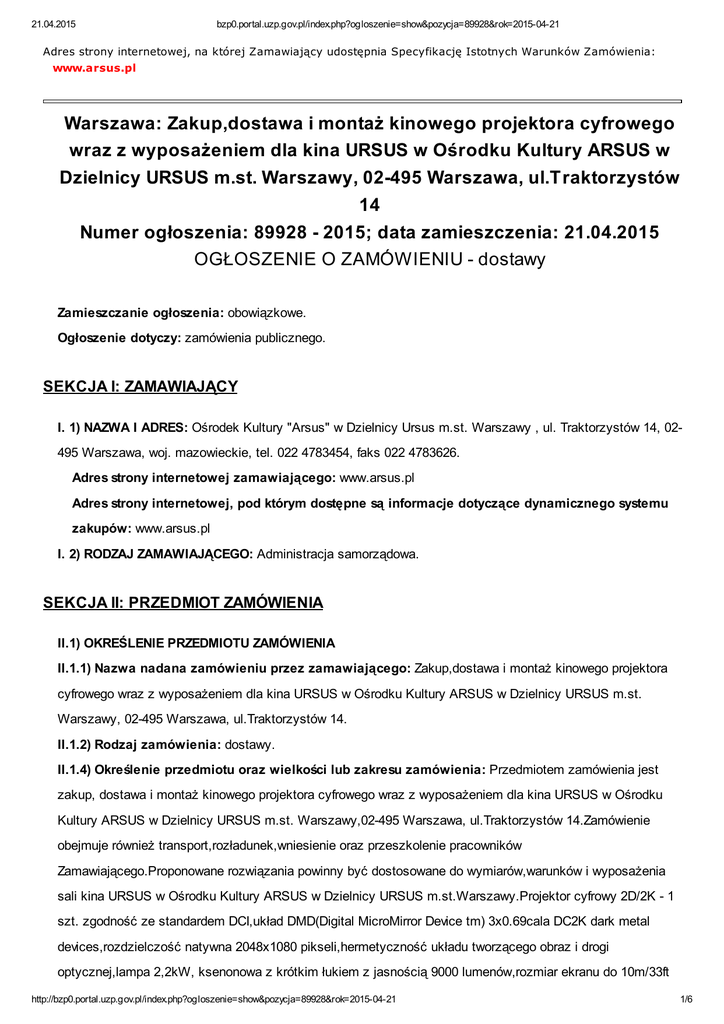 21.04.2015 bzp0.portal.uzp.gov.pl/index.php?ogloszenie=show&pozycja=89928&rok=2015-04-21 Adres strony internetowej, na której Zamawiający udostępnia Specyfikację Istotnych Warunków Zamówienia: www.arsus.pl Warszawa: Zakup,dostawa i montaż kinowego projektora cyfrowego wraz z wyposażeniem dla kina URSUS w Ośrodku Kultury ARSUS w Dzielnicy URSUS m.st. Warszawy, 02-495 Warszawa, ul.Traktorzystów 14 Numer ogłoszenia: 89928 - 2015; data zamieszczenia: 21.04.2015 OGŁOSZENIE O ZAMÓWIENIU - dostawy Zamieszczanie ogłoszenia: obowiązkowe. Ogłoszenie dotyczy: zamówienia publicznego. SEKCJA I: ZAMAWIAJĄCY I. 1) NAZWA I ADRES: Ośrodek Kultury "Arsus" w Dzielnicy Ursus m.st. Warszawy , ul. Traktorzystów 14, 02495 Warszawa, woj. mazowieckie, tel. 022 4783454, faks 022 4783626. Adres strony internetowej zamawiającego: www.arsus.pl Adres strony internetowej, pod którym dostępne są informacje dotyczące dynamicznego systemu zakupów: www.arsus.pl I. 2) RODZAJ ZAMAWIAJĄCEGO: Administracja samorządowa. SEKCJA II: PRZEDMIOT ZAMÓWIENIA II.1) OKREŚLENIE PRZEDMIOTU ZAMÓWIENIA II.1.1) Nazwa nadana zamówieniu przez zamawiającego: Zakup,dostawa i montaż kinowego projektora cyfrowego wraz z wyposażeniem dla kina URSUS w Ośrodku Kultury ARSUS w Dzielnicy URSUS m.st. Warszawy, 02-495 Warszawa, ul.Traktorzystów 14. II.1.2) Rodzaj zamówienia: dostawy. II.1.4) Określenie przedmiotu oraz wielkości lub zakresu zamówienia: Przedmiotem zamówienia jest zakup, dostawa i montaż kinowego projektora cyfrowego wraz z wyposażeniem dla kina URSUS w Ośrodku Kultury ARSUS w Dzielnicy URSUS m.st. Warszawy,02-495 Warszawa, ul.Traktorzystów 14.Zamówienie obejmuje również transport,rozładunek,wniesienie oraz przeszkolenie pracowników Zamawiającego.Proponowane rozwiązania powinny być dostosowane do wymiarów,warunków i wyposażenia sali kina URSUS w Ośrodku Kultury ARSUS w Dzielnicy URSUS m.st.Warszawy.Projektor cyfrowy 2D/2K - 1 szt. zgodność ze standardem DCI,układ DMD(Digital MicroMirror Device tm) 3x0.69cala DC2K dark metal devices,rozdzielczość natywna 2048x1080 pikseli,hermetyczność układu tworzącego obraz i drogi optycznej,lampa 2,2kW, ksenonowa z krótkim łukiem z jasnością 9000 lumenów,rozmiar ekranu do 10m/33ft http://bzp0.portal.uzp.gov.pl/index.php?ogloszenie=show&pozycja=89928&rok=2015-04-21 1/6 21.04.2015 bzp0.portal.uzp.gov.pl/index.php?ogloszenie=show&pozycja=89928&rok=2015-04-21 szerokości(zysk ekranu 1,2@14ftl),współczynnik kontratsu >1,850:1,min.jasność 14fL dla ekranu dla projekcji 2D,min.jasność 4.5fL dla ekranu dla projekcji 3D,modułowa konstrukcja projektora umożliwiająca szybki serwis,niezależny moduł mocowania lampy (lamphouse) umożliwiający jej szybką wymianę,układ automatyki i pamięci ustawień ostrości i wielkości ogniskowej obiektywu,możliwość projekcji ze zwiększoną ilością klatek HFR do 120kl/s,możliwość zdalnej diagnostyki z komputera,moduł stałej jasności projektora w czasie (CLO),filtry powietrza wielokrotnego użycia,zasilanie z sieci elektrycznej 230V,możliwość sterowania projektorem przez touch panel lub notebook.Serwer kinowy - 1 szt, zgodność ze standardami DCI, wyposażony w moduł IMB - Integrated Media Block instalowany w projektorze DC, pełna współpraca z projektorem bazującym na rozwiązaniu DLP, bezpośredni dostęp do dysków twardych serwera, odtwarzany system kompresji JPEG2000,MPEG2 oraz H.264,odtwarzanie materiału HFR 2K 3D@60fps,typ wyjścia audio:8xAES/EBU 16-kanałów,24 bity,96KHz, wsparcie dla systemu dźwięku Dolby ATMOS,złącza wejściowe dla treści alternatywnych: 1 x HDMI 1.3 ( z wsparciem dla HDCP), 2 x 3G-SDI (3GSMPTE 424M),ilość miejsca na dyskach: 5,4TB użytecznej pamięci RAID5,transfer danych do pamięci serwera przez złącza: Ethernet (1GBit/s), USB 2.0, DVD-ROM oraz kieszeń CRU,GPIO złącza: 4 in,8 out,licencja do otwarzania plików w systemie 3D pasywnym.Obiektyw projekcyjny - 1 szt, w pełni zmotoryzowany obiektyw do projektora 2K (jeden obiektyw dla obu formatów FLAT/SCOPE).Lampa ksenonowa - 1 szt,odpowiednia dla układu matrycy 0,69cala, ksenonowa odpowiednia dla projekcji 2D,moc 2200W.Podstawa projektora - 1 szt, podstawa uniwersalna do projektora z regulowanym kątem nachylenia. Panel sterujący- laptop - 1 szt, ekran 15,6cala, rozdzielczość 1366x768,procesor Intel Celeron 2.16GHz,RAM DDR3 4Gb,dysk 500Gb,akumulator,wifi,zasilacz,preinstalowany system Widows 8.1PL,złącze HDMI,USB,LAN,VGA.Procesor obrazu - skaler - 1 szt,zgodność z HDTV,zgodność z HDCP,wejścia sygnału 1x kompozyt video, 1 x s-video, 2 x komponent video, 1x RGBHV (15-pinowe HD) i 2 x HDMI,jedno wyjście jednocześnie dostępne w 3 formatach: 1 HDMI, 2RGBHV (5BNC,15-pin HD,rozdzielczość wyjściowa HDTV do 1080p,wejścia audio - 7 niesymetrycznych, wyjście audio - 1 S/PDIF,sygnał z wejść audio transkodowany jednocześnie do formatu stereo i S/PDIF, audio wbudowywane także do wyjścia HDMI, z główną regulacją głośności, opóźnienie audio. Wbudowany procesor obrazu umożliwiający regulację parametrów - kolor,barwa,ostrość,szum,kontrast i jasność.Sterowanie z panelu przedniego - wyciszenie (audio mute), odłączanie (blank) i zatrzymywanie (freeze) sygnału wideo.Sterowanie za pomocą: przyciski na panelu przednim, Ethernet,pilot IR z menu OSD i RS-232.Ekran kinowy- 1 szt, o wymiarach 9,8 mx4,3m, matowy,perforowany, zaoczkowany, współczynnik odbicia światła minimum 1,0.Dostawa,montaż i szkolenie pracowników Zamawiającego.-1 kpl.Podstawoe parametry wymiarowe sali kina URSUS w Ośrodku Kultury ARSUS w dzielnicy URSUS m.st.Warszawy : liczba miejsc: 484,szerokość ekranu: 9,80m, wysokość ekranu:4,30m,długość sali:27,0m,szerokość sali:20,50m,wysokość sali: max7,50m,min.- 3,50 m, odległość projekcyjna: 26,0m, wymiar kabiny: 8,20mx4,40m. II.1.6) Wspólny Słownik Zamówień (CPV): 38.65.20.00-0, 48.90.00.00-7, 38.60.00.00-1, 31.51.70.00-3, 30.20.