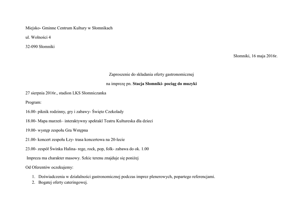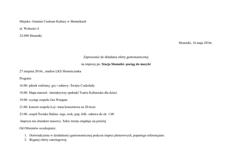 Miejsko- Gminne Centrum Kultury w Słomnikach ul. Wolności 4 32-090 Słomniki Słomniki, 16 maja 2016r. Zaproszenie do składania oferty gastronomicznej na imprezę pn. Stacja Słomniki- pociąg do muzyki 27 sierpnia 2016r., stadion LKS Słomniczanka Program: 16.00- piknik rodzinny, gry i zabawy- Święto Czekolady 18.00- Mapa marzeń– interaktywny spektakl Teatru Kultureska dla dzieci 19.00- występ zespołu Gra Wstępna 21.00- koncert zespołu Łzy- trasa koncertowa na 20-lecie 23.00- zespół Świnka Halina- rege, rock, pop, folk- zabawa do ok. 1.00 Impreza ma charakter masowy. Szkic terenu znajduje się poniżej Od Oferentów oczekujemy: 1. Doświadczenia w działalności gastronomicznej podczas imprez plenerowych, popartego referencjami. 2. Bogatej oferty cateringowej. 3. Uprawnień do sprzedaży piwa. 4. Własnego agregatu prądotwórczego. 5. Co najmniej 50 kompletów ławostołów pod parasolami. Oferty podpisane imieniem i nazwiskiem oraz poświadczone pieczęcią firmową, zawierające: 1. 2. 3. 4. Dane firmy: nazwa, adres, NIP, nr KRS lub wpis do ewidencji gospodarczej, Referencje, Informację o menu, Informację o wyposażeniu; w tym ilość punktów sprzedaży, ilość parasoli i ławostołów, kosze/worki na śmieci itp.- mile widziane zdjęcia stoisk, 5. Oferowaną kwotę za wynajem terenu, przy czym nie niższą niż 5000,00 zł, prosimy nadsyłać do dnia 15 czerwca 2016r. pocztą tradycyjną na adres: Miejsko- Gminne Centrum Kultury w Słomnikach ul. Wolności 4 32-090 Słomniki Lub mailowo: [email protected] Wybór najkorzystniejszej oferty nastąpi wg kryteriów: 60%- oferta menu oraz wyposażenie 40%- oferowana cena do dnia 30 czerwca, o czym poinformujemy na stronie internetowej www.mgckslomniki.pl 2 1 droga ewakuacyjna 5 SCENA 3 4 droga ewakuacyjna PARKING 6 6 1 - agregat prądotwórczy 2 - WC VIP 3 - samochody obsługi / zespołów 4 - garderoba 5 - brama wjazdowa na boisko 6 - bramka wejściowa na boiska Catering- miejsce do konsumpcji 30 x 7m Catering stoiska 28 x 5m PLAC ZABAW 17 x 48m Catering- miejsce do konsumpcji 22 x 23m Wszelkich dodatkowych informacji udziela dyrektor Centrum Kultury mailowo ([email protected]) lub telefonicznie: 12 3881149. Alicja Biczysko dyr. MGCK w Słomnikach