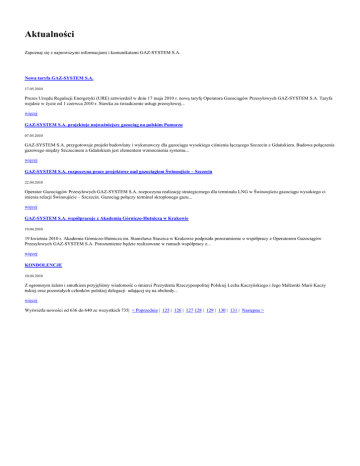 Aktualności Zapoznaj się z najnowszymi informacjami i komunikatami GAZ-SYSTEM S.A. Nowa taryfa GAZ-SYSTEM S.A. 17.05.2010 Prezes Urzędu Regulacji Energetyki (URE) zatwierdził w dniu 17 maja 2010 r. nową taryfę Operatora Gazociągów Przesyłowych GAZ-SYSTEM S.A. Taryfa wejdzie w życie od 1 czerwca 2010 r. Stawka za świadczenie usługi przesyłowej... więcej GAZ-SYSTEM S.A. projektuje najważniejszy gazociąg na polskim Pomorzu 07.05.2010 GAZ-SYSTEM S.A. przygotowuje projekt budowlany i wykonawczy dla gazociągu wysokiego ciśnienia łączącego Szczecin z Gdańskiem. Budowa połączenia gazowego między Szczecinem a Gdańskiem jest elementem wzmocnienia systemu... więcej GAZ-SYSTEM S.A. rozpoczyna prace projektowe nad gazociągiem Świnoujście – Szczecin 22.04.2010 Operator Gazociągów Przesyłowych GAZ-SYSTEM S.A. rozpoczyna realizację strategicznego dla terminalu LNG w Świnoujściu gazociągu wysokiego ci śnienia relacji Świnoujście – Szczecin. Gazociąg połączy terminal skroplonego gazu... więcej GAZ-SYSTEM S.A. współpracuje z Akademią Górniczo-Hutniczą w Krakowie 19.04.2010 19 kwietnia 2010 r. Akademia Górniczo-Hutnicza im. Stanisława Staszica w Krakowie podpisała porozumienie o współpracy z Operatorem Gazociągów Przesyłowych GAZ-SYSTEM S.A. Porozumienie będzie realizowane w ramach współpracy z... więcej KONDOLENCJE 10.04.2010 Z ogromnym żalem i smutkiem przyjęliśmy wiadomość o śmierci Prezydenta Rzeczypospolitej Polskiej Lecha Kaczyńskiego i Jego Małżonki Marii Kaczy ńskiej oraz pozostałych członków polskiej delegacji udającej się na obchody... więcej Wyświetla nowości od 636 do 640 ze wszystkich 735| < Poprzednia | 125 | 126 | 127 128 | 129 | 130 | 131 | Następna >