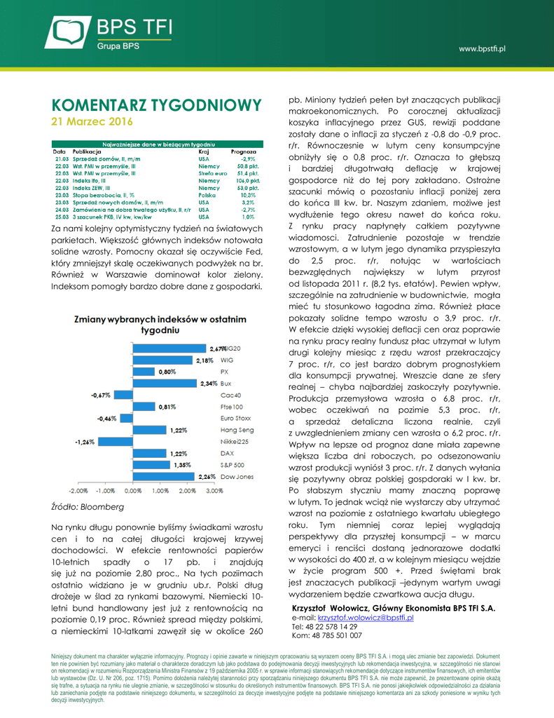 KOMENTARZ TYGODNIOWY 21 Marzec 2016 Za nami kolejny optymistyczny tydzień na światowych parkietach. Większość głównych indeksów notowała solidne wzrosty. Pomocny okazał się oczywiście Fed, który zmniejszył skalę oczekiwanych podwyżek na br. Również w Warszawie dominował kolor zielony. Indeksom pomogły bardzo dobre dane z gospodarki. Źródło: Bloomberg Na rynku długu ponownie byliśmy świadkami wzrostu cen i to na całej długości krajowej krzywej dochodowści. W efekcie rentowności papierów 10-letnich spadły o 17 pb. i znajdują się już na poziomie 2,80 proc., Na tych poziimach ostatnio widziano je w grudniu ub.r. Polski dług drożeje w ślad za rynkami bazowymi. Niemiecki 10letni bund handlowany jest już z rentownością na poziomie 0,19 proc. Również spread między polskimi, a niemieckimi 10-latkami zawęził się w okolice 260 pb. Miniony tydzień pełen był znaczących publikacji makroekonomicznych. Po corocznej aktualizacji koszyka inflacyjnego przez GUS, rewizji poddane zostały dane o inflacji za styczeń z -0,8 do -0,9 proc. r/r. Równoczesnie w lutym ceny konsumpcyjne obniżyły się o 0,8 proc. r/r. Oznacza to głębszą i bardziej długotrwałą deflację w krajowej gospodorce niż do tej pory zakładano. Ostrożne szacunki mówią o pozostaniu inflacji poniżej zera do końca III kw. br. Naszym zdaniem, możiwe jest wydłużenie tego okresu nawet do końca roku. Z rynku pracy napłynęły całkiem pozytywne wiadomosci. Zatrudnienie pozostaje w trendzie wzrostowym, a w lutym jego dynamika przyspieszyła do 2,5 proc. r/r, notując w wartościach bezwzględnych największy w lutym przyrost od listopada 2011 r. (8,2 tys. etatów). Pewien wpływ, szczególnie na zatrudnienie w budownictwie, mogła mieć tu stosunkowo łagodna zima. Również płace pokazały solidne tempo wzrostu o 3,9 proc. r/r. W efekcie dzięki wysokiej deflacji cen oraz poprawie na rynku pracy realny fundusz płac utrzymał w lutym drugi kolejny miesiąc z rzędu wzrost przekraczajcy 7 proc. r/r, co jest bardzo dobrym prognostykiem dla konsumpcji prywatnej. Wreszcie dane ze sfery realnej – chyba najbardziej zaskoczyły pozytywnie. Produkcja przemysłowa wzrosła o 6,8 proc. r/r, wobec oczekiwań na pozimie 5,3 proc. r/r, a sprzedaż detaliczna liczona realnie, czyli z uwzglednieniem zmiany cen wzrosła o 6,2 proc. r/r. Wpływ na lepsze od prognoz dane miała zapewne większa liczba dni roboczych, po odsezonowaniu wzrost produkcji wyniósł 3 proc. r/r. Z danych wyłania się pozytywny obraz polskiej gospdoraki w I kw. br. Po słabszym styczniu mamy znaczną poprawę w lutym. To jednak wciąż nie wystarczy aby utrzymać wzrost na poziomie z ostatniego kwartału ubiegłego roku. Tym niemniej coraz lepiej wyglądają perspektywy dla przyszłej konsumpcji – w marcu emeryci i renciści dostaną jednorazowe dodatki w wysokości do 400 zł, a w kolejnym miesiącu wejdzie w życie program 500 +. Przed świętami brak jest znaczacych publikacji –jedynym wartym uwagi wydarzeniem będzie czwartkowa aucja długu. Krzysztof Wołowicz, Główny Ekonomista BPS TFI S.A. e-mail: [email protected] Tel: 48 22 578 14 29 Kom: 48 785 501 007 Niniejszy dokument ma charakter wyłącznie informacyjny. Prognozy i opinie zawarte w niniejszym opracowaniu są wyrazem oceny BPS TFI S.A. i mogą ulec zmianie bez zapowiedzi. Dokument ten nie powinien być rozumiany jako materiał o charakterze doradczym lub jako podstawa do podejmowania decyzji inwestycyjnych lub rekomendacja inwestycyjna, w szczególności nie stanowi on rekomendacji w rozumieniu Rozporządzenia Ministra Finansów z 19 października 2005 r. w sprawie informacji stanowiących rekomendacje dotyczące instrumentów finansowych, ich emitentów lub wystawców (Dz. U. Nr 206, poz. 1715). Pomimo dołożenia należytej staranności przy sporządzaniu niniejszego dokumentu BPS TFI S.A. nie może zapewnić, że prezentowane opinie okażą się trafne, a sytuacja na rynku nie ulegnie zmianie, w szczególności w stosunku do określonych instrumentów finansowych. BPS TFI S.A. nie ponosi jakiejkolwiek odpowiedzialności za działania lub zaniechania podjęte na podstawie niniejszego dokumentu, w szczególności za decyzje inwestycyjne podjęte na podstawie niniejszego komentarza ani za szkody poniesione w wyniku tych decyzji inwestycyjnych.
