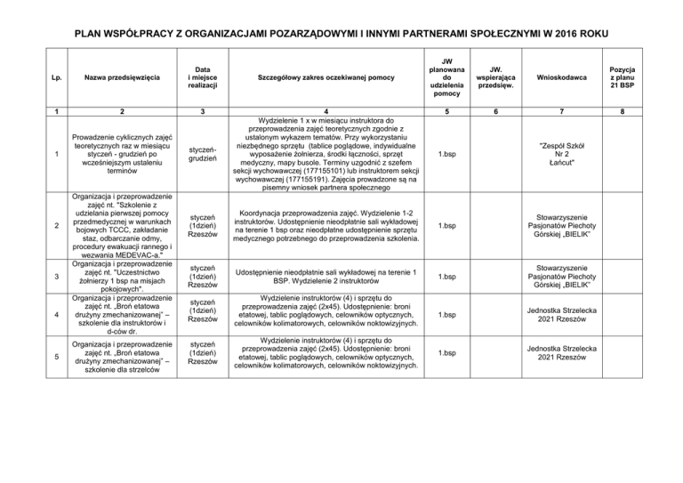 PLAN WSPÓŁPRACY Z ORGANIZACJAMI POZARZĄDOWYMI I INNYMI PARTNERAMI SPOŁECZNYMI W 2016 ROKU Lp. Nazwa przedsięwzięcia Data i miejsce realizacji 1 2 3 1 Prowadzenie cyklicznych zajęć teoretycznych raz w miesiącu styczeń - grudzień po wcześniejszym ustaleniu terminów styczeńgrudzień 2 3 4 5 Organizacja i przeprowadzenie zajęć nt. "Szkolenie z udzielania pierwszej pomocy przedmedycznej w warunkach bojowych TCCC, zakładanie staz, odbarczanie odmy, procedury ewakuacji rannego i wezwania MEDEVAC-a." Organizacja i przeprowadzenie zajęć nt. "Uczestnictwo żołnierzy 1 bsp na misjach pokojowych". Organizacja i przeprowadzenie zajęć nt. „Broń etatowa drużyny zmechanizowanej” – szkolenie dla instruktorów i d-ców dr. Organizacja i przeprowadzenie zajęć nt. „Broń etatowa drużyny zmechanizowanej” – szkolenie dla strzelców Szczegółowy zakres oczekiwanej pomocy 4 Wydzielenie 1 x w miesiącu instruktora do przeprowadzenia zajęć teoretycznych zgodnie z ustalonym wykazem tematów. Przy wykorzystaniu niezbędnego sprzętu (tablice poglądowe, indywidualne wyposażenie żołnierza, środki łączności, sprzęt medyczny, mapy busole. Terminy uzgodnić z szefem sekcji wychowawczej (177155101) lub instruktorem sekcji wychowawczej (177155191). Zajęcia prowadzone są na pisemny wniosek partnera społecznego JW planowana do udzielenia pomocy JW. wspierająca przedsięw. Wnioskodawca Pozycja z planu 21 BSP 5 6 7 8 1.bsp "Zespół Szkół Nr 2 Łańcut" styczeń (1dzień) Rzeszów Koordynacja przeprowadzenia zajęć. Wydzielenie 1-2 instruktorów. Udostępnienie nieodpłatnie sali wykładowej na terenie 1 bsp oraz nieodpłatne udostępnienie sprzętu medycznego potrzebnego do przeprowadzenia szkolenia. 1.bsp Stowarzyszenie Pasjonatów Piechoty Górskiej „BIELIK” styczeń (1dzień) Rzeszów Udostępnienie nieodpłatnie sali wykładowej na terenie 1 BSP. Wydzielenie 2 instruktorów 1.bsp Stowarzyszenie Pasjonatów Piechoty Górskiej „BIELIK” styczeń (1dzień) Rzeszów Wydzielenie instruktorów (4) i sprzętu do przeprowadzenia zajęć (2x45). Udostępnienie: broni etatowej, tablic poglądowych, celowników optycznych, celowników kolimatorowych, celowników noktowizyjnych. 1.bsp Jednostka Strzelecka 2021 Rzeszów styczeń (1dzień) Rzeszów Wydzielenie instruktorów (4) i sprzętu do przeprowadzenia zajęć (2x45). Udostępnienie: broni etatowej, tablic poglądowych, celowników optycznych, celowników kolimatorowych, celowników noktowizyjnych. 1.bsp Jednostka Strzelecka 2021 Rzeszów PLAN WSPÓŁPRACY Z ORGANIZACJAMI POZARZĄDOWYMI I INNYMI PARTNERAMI SPOŁECZNYMI W 2016 ROKU 6 7 8 9 10 11 12 Organizacja i przeprowadzenie zajęć nt." Działalności żołnierzy Wojska Polskiego podczas misji poza granicami państwa", "Zagadnienia etyki żołnierskiej". styczeń (1dzień) Rzeszów Wydzielenie instruktorów(2) do przeprowadzenia zajęć teoretycznych, przy wykorzystaniu niezbędnego sprzętu ( tablice poglądowe, mapy, zdjęcia), (2x 45) 22.01. Rzeszów Wystawienie wojskowej asysty honorowej i posterunków honorowych, przeprowadzenie apelu pamięci oraz wydzielenie amunicji ślepej do oddania salwy honorowej: 5,56 - mm nb. „ślepy” – 216 szt. Prowadzenie działań promocyjnych. Autokar do przewiezienia wojskowej asysty honorowej. 1.bsp Luty Rzeszów Wydzielenie instruktorów(2) do przeprowadzenia zajęć teoretycznych, przy wykorzystaniu niezbędnego sprzętu ( tablice poglądowe, zdjęcia) (2x45) 1.bsp "Zespół Szkół Nr 2 Rzeszów" luty (1dzień) Rzeszów Koordynacja przeprowadzenia zajęć .Szczegółowa, statyczna prezentacja pojazdów wojskowych na terenie 1 bsp. Udostępnienie nieodpłatnie sali wykładowej na potrzeby szkolenia. Zapewnienie 3-4 instruktorów. 1.bsp Stowarzyszenie Pasjonatów Piechoty Górskiej „BIELIK” Organizacja i prowadzenie zajęć nt. "Udział żołnierzy 1 bsp na misjach pokojowych". luty (1dzień) Rzeszów Koordynacja przeprowadzenia zajęć Udostępnienie sali wykładowej na terenie 1 bsp. Zapewnienie 1-2 instruktorów 1.bsp Stowarzyszenie Pasjonatów Piechoty Górskiej „BIELIK” Organizacja i prowadzenie zajęć nt. "Obrona przed bronią masowego rażenia, powszechna obrona przeciwlotnicza, szkolenie inżsap." – szkolenie dla instruktorów i d-ców dr luty (1dzień) Rzeszów Wydzielenie instruktorów (2) i sprzętu do przeprowadzenia zajęć (2x45). Udostępnienie: FOO1x10szt. ,MP-5x20 szt. , IZAS-05x2 szt., PCHW-04x2szt., PCHR-54Mx1 szt., DP-75x1szt. 1.bsp Jednostka Strzelecka 2021 Rzeszów Organizacja i prowadzenie zajęć ze wspinaczki na marzec (1dzień) Koordynacja przeprowadzenia zajęć. Udostępnienie nieodpłatnie hali sportowej w celu przeprowadzenia szkolenia. Zapewnienie 2-4 1.bsp Obchody 153. Rocznicy wybuchu Powstania Styczniowego. Organizacja i przeprowadzenie zajęć nt. "Normy prawne regulujące problematykę wojenną, ogólnych zasad prowadzenia działań, prawa do samoobrony, ochronę ludności cywilnej, dóbr kultury, miejsc kultu religijnego podczas działań wojennych" Organizacja i prowadzenie zajęć nt. "Wykorzystanie pojazdów wojskowych w działaniach bojowych" Zespół Szkół Nr 2 Rzeszów 1.bsp Orkiestra Wojskowa wg decyzji DGW Podkarpacka Rada ds. Kombatantów i Osób Represjonowanych Stowarzyszenie Pasjonatów Piechoty 1995 PLAN WSPÓŁPRACY Z ORGANIZACJAMI POZARZĄDOWYMI I INNYMI PARTNERAMI SPOŁECZNYMI W 2016 ROKU ściance wspinaczkowej. marzec (1dzień) Rzeszów Wydzielenie instruktorów (4) i sprzętu do przeprowadzenia zajęć (3x45). Udostępnienie: busola AKx10szt., odbiornik GPSx1szt., mapy UTM x10szt. 1.bsp Jednostka Strzelecka 2021 Rzeszów Marzec Rzeszów Wydzielenie instruktorów (2) do przeprowadzenia zajęć teoretycznych, przy wykorzystaniu niezbędnego sprzętu (tablice poglądowe)(1x45) 1.bsp Zespół Szkół Nr 2 Rzeszów (organizacja i przeprowadzenie obozu szkoleniowego) Szkolenie z zakresu taktyki zdobywania budynków, taktyki poruszania się w terenie miejskim,