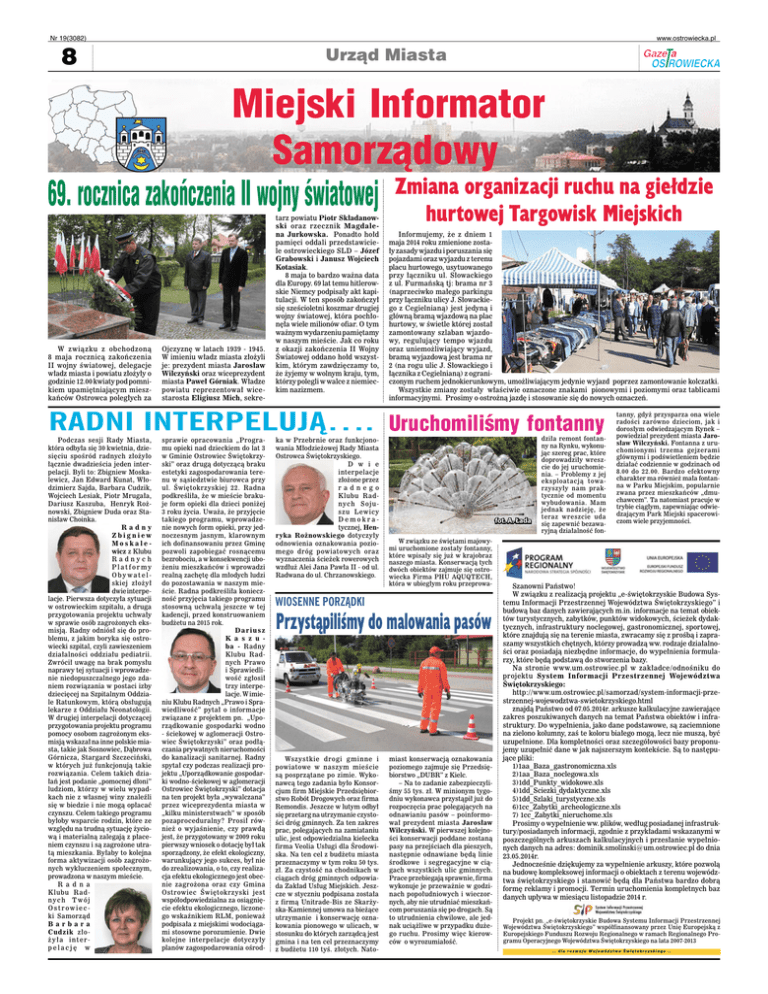 Nr 19(3082) www.ostrowiecka.pl 8 Urząd Miasta Miejski Informator Samorządowy 69. rocznica zakończenia II wojny światowej W związku z obchodzoną 8 maja rocznicą zakończenia II wojny światowej, delegacje władz miasta i powiatu złożyły o godzinie 12.00 kwiaty pod pomnikiem upamiętniającym mieszkańców Ostrowca poległych za Ojczyznę w latach 1939 - 1945. W imieniu władz miasta złożyli je: prezydent miasta Jarosław Wilczyński oraz wiceprezydent miasta Paweł Górniak. Władze powiatu reprezentował wicestarosta Eligiusz Mich, sekre- tarz powiatu Piotr Składanowski oraz rzecznik Magdalena Jurkowska. Ponadto hołd pamięci oddali przedstawiciele ostrowieckiego SLD – Józef Grabowski i Janusz Wojciech Kotasiak. 8 maja to bardzo ważna data dla Europy. 69 lat temu hitlerowskie Niemcy podpisały akt kapitulacji. W ten sposób zakończył się sześcioletni koszmar drugiej wojny światowej, która pochłonęła wiele milionów ofiar. O tym ważnym wydarzeniu pamiętamy w naszym mieście. Jak co roku z okazji zakończenia II Wojny Światowej oddano hołd wszystkim, którym zawdzięczamy to, że żyjemy w wolnym kraju, tym, którzy polegli w walce z niemieckim nazizmem. Zmiana organizacji ruchu na giełdzie hurtowej Targowisk Miejskich Informujemy, że z dniem 1 maja 2014 roku zmienione zostały zasady wjazdu i poruszania się pojazdami oraz wyjazdu z terenu placu hurtowego, usytuowanego przy łączniku ul. Słowackiego z ul. Furmańską tj: brama nr 3 (naprzeciwko małego parkingu przy łączniku ulicy J. Słowackiego z Cegielnianą) jest jedyną i główną bramą wjazdową na plac hurtowy, w świetle której został zamontowany szlaban wjazdowy, regulujący tempo wjazdu oraz uniemożliwiający wyjazd, bramą wyjazdową jest brama nr 2 (na rogu ulic J. Słowackiego i łącznika z Cegielnianą) z ograniczonym ruchem jednokierunkowym, umożliwiającym jedynie wyjazd poprzez zamontowanie kolczatki. Wszystkie zmiany zostały właściwie oznaczone znakami pionowymi i poziomymi oraz tablicami informacyjnymi. Prosimy o ostrożną jazdę i stosowanie się do nowych oznaczeń. Radni interpelują…. Uruchomiliśmy fontanny Podczas sesji Rady Miasta, która odbyła się 30 kwietnia, dziesięciu spośród radnych złożyło łącznie dwadzieścia jeden interpelacji. Byli to: Zbigniew Moskalewicz, Jan Edward Kunat, Włodzimierz Sajda, Barbara Cudzik, Wojciech Lesiak, Piotr Mrugała, Dariusz Kaszuba, Henryk Rożnowski, Zbigniew Duda oraz Stanisław Choinka. Radny Zbigniew Moskalewicz z Klubu Radnych Platformy Oby watelsk iej złoży ł dwie interpelacje. Pierwsza dotyczyła sytuacji w ostrowieckim szpitalu, a druga przygotowania projektu uchwały w sprawie osób zagrożonych eksmisją. Radny odniósł się do problemu, z jakim boryka się ostrowiecki szpital, czyli zawieszeniem działalności oddziału pediatrii. Zwrócił uwagę na brak pomysłu naprawy tej sytuacji i wprowadzenie niedopuszczalnego jego zdaniem rozwiązania w postaci izby dziecięcej na Szpitalnym Oddziale Ratunkowym, którą obsługują lekarze z Oddziału Neonatologii. W drugiej interpelacji dotyczącej przygotowania projektu programu pomocy osobom zagrożonym eksmisją wskazał na inne polskie miasta, takie jak Sosnowiec, Dąbrowa Górnicza, Stargard Szczeciński, w których już funkcjonują takie rozwiązania. Celem takich działań jest podanie „pomocnej dłoni” ludziom, którzy w wielu wypadkach nie z własnej winy znaleźli się w biedzie i nie mogą opłacać czynszu. Celem takiego programu byłoby wsparcie rodzin, które ze względu na trudną sytuację życiową i materialną zalegają z płaceniem czynszu i są zagrożone utratą mieszkania. Byłaby to kolejna forma aktywizacji osób zagrożonych wykluczeniem społecznym, prowadzona w naszym mieście. R a d n a K lubu R ad nych Twój Ostrowiecki Samorząd Barbara Cudzik zło ż y ła i nter pelację w sprawie opracowania „Programu opieki nad dzieckiem do lat 3 w Gminie Ostrowiec Świętokrzyski” oraz drugą dotyczącą braku estetyki zagospodarowania terenu w sąsiedztwie biurowca przy ul. Świętokrzyskiej 22. Radna podkreśliła, że w mieście brakuje form opieki dla dzieci poniżej 3 roku życia. Uważa, że przyjęcie takiego programu, wprowadzenie nowych form opieki, przy jednoczesnym jasnym, klarownym ich dofinansowaniu przez Gminę pozwoli zapobiegać rosnącemu bezrobociu, a w konsekwencji ubożeniu mieszkańców i wprowadzi realną zachętę dla młodych ludzi do pozostawania w naszym mieście. Radna podkreśliła konieczność przyjęcia takiego programu stosowną uchwałą jeszcze w tej kadencji, przed konstruowaniem budżetu na 2015 rok. Dariusz K a s z u ba - Radny K lubu R adnych Prawo i Sprawiedliwość zgłosił trzy interpelacje. W imieniu Klubu Radnych „Prawo i Sprawiedliwość” pytał o informacje związane z projektem pn. „Uporządkowanie gospodarki wodno - ściekowej w aglomeracji Ostrowiec Świętokrzyski” oraz podłączania prywatnych nieruchomości do kanalizacji sanitarnej. Radny spytał czy podczas realizacji projektu „Uporządkowanie gospodarki wodno-ściekowej w aglomeracji Ostrowiec Świętokrzyski” dotacja na ten projekt była „wywalczana” przez wiceprezydenta miasta w „kilku ministerstwach” w sposób pozaproceduralny? Prosił również o wyjaśnienie, czy prawdą jest, że przygotowany w 2009 roku pierwszy wniosek o dotację był tak sporządzony, że efekt ekologiczny, warunkujący jego sukces, był nie do zrealizowania, o to, czy realizacja efektu ekologicznego jest obecnie zagrożona oraz czy Gmina Ostrow iec Św iętok rzysk i jest współodpowiedzialna za osiągnięcie efektu ekologicznego, liczonego wskaźnikiem RLM, ponieważ podpisała z miejskimi wodociągami stosowne porozumienie. Dwie kolejne interpelacje dotyczy ły planów zagospodarowania ośrod- ka w Przebrnie oraz funkcjonowania Młodzieżowej Rady Miasta Ostrowca Świętokrzyskiego. D w i e inter pelacje złożone przez r a d ne g