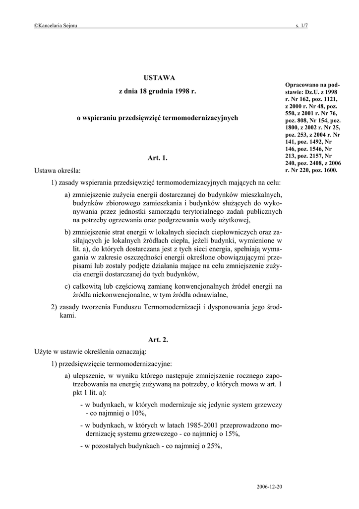 ©Kancelaria Sejmu s. 1/7 USTAWA Opracowano na podstawie: Dz.U. z 1998 r. Nr 162, poz. 1121, z 2000 r. Nr 48, poz. 550, z 2001 r. Nr 76, poz. 808, Nr 154, poz. 1800, z 2002 r. Nr 25, poz. 253, z 2004 r. Nr 141, poz. 1492, Nr 146, poz. 1546, Nr 213, poz. 2157, Nr 240, poz. 2408, z 2006 r. Nr 220, poz. 1600. z dnia 18 grudnia 1998 r. o wspieraniu przedsięwzięć termomodernizacyjnych Art. 1. Ustawa określa: 1) zasady wspierania przedsięwzięć termomodernizacyjnych mających na celu: a) zmniejszenie zużycia energii dostarczanej do budynków mieszkalnych, budynków zbiorowego zamieszkania i budynków służących do wykonywania przez jednostki samorządu terytorialnego zadań publicznych na potrzeby ogrzewania oraz podgrzewania wody użytkowej, b) zmniejszenie strat energii w lokalnych sieciach ciepłowniczych oraz zasilających je lokalnych źródłach ciepła, jeżeli budynki, wymienione w lit. a), do których dostarczana jest z tych sieci energia, spełniają wymagania w zakresie oszczędności energii określone obowiązującymi przepisami lub zostały podjęte działania mające na celu zmniejszenie zużycia energii dostarczanej do tych budynków, c) całkowitą lub częściową zamianę konwencjonalnych źródeł energii na źródła niekonwencjonalne, w tym źródła odnawialne, 2) zasady tworzenia Funduszu Termomodernizacji i dysponowania jego środkami. Art. 2. Użyte w ustawie określenia oznaczają: 1) przedsięwzięcie termomodernizacyjne: a) ulepszenie, w wyniku którego następuje zmniejszenie rocznego zapotrzebowania na energię zużywaną na potrzeby, o których mowa w art. 1 pkt 1 lit. a): - w budynkach, w których modernizuje się jedynie system grzewczy - co najmniej o 10%, - w budynkach, w których w latach 1985-2001 przeprowadzono modernizację systemu grzewczego - co najmniej o 15%, - w pozostałych budynkach - co najmniej o 25%, 2006-12-20 ©Kancelaria Sejmu s. 2/7 b) ulepszenie, w wyniku którego następuje zmniejszenie rocznych strat energii pierwotnej w lokalnym źródle ciepła i w lokalnej sieci ciepłowniczej - co najmniej o 25%, c) wykonanie przyłączy technicznych do scentralizowanego źródła ciepła, w związku z likwidacją lokalnego źródła ciepła, w celu zmniejszenia kosztów zakupu ciepła dostarczanego do budynków - co najmniej 20% w stosunku rocznym, d) zamianę konwencjonalnych źródeł energii na źródła niekonwencjonalne, 2) budynek: a) budynek mieszkalny, b) budynek zbiorowego zamieszkania, przez który rozumie się dom opieki społecznej, hotel robotniczy, internat i bursę szkolną, dom studencki, dom dziecka, dom emeryta i rencisty, dom dla bezdomnych oraz budynki o podobnym przeznaczeniu, c) budynek wykorzystywany przez jednostki samorządu terytorialnego do wykonywania zadań publicznych, stanowiący ich własność, 3) lokalna sieć ciepłownicza - sieć ciepłowniczą dostarczającą ciepło do budynków z lokalnych źródeł ciepła, 4) lokalne źródło ciepła: a) kotłownię lub węzeł cieplny, z których nośnik ciepła jest dostarczany bezpośrednio do instalacji ogrzewania i ciepłej wody w budynku, b) ciepłownię osiedlową lub grupowy wymiennik ciepła wraz z siecią ciepłowniczą o mocy nominalnej do 11,6 MW, dostarczającą ciepło do budynków, 5) audyt energetyczny - opracowanie określające zakres i parametry techniczne oraz ekonomiczne przedsięwzięcia termomodernizacyjnego, ze wskazaniem rozwiązania optymalnego, w szczególności z punktu widzenia kosztów realizacji tego przedsięwzięcia oraz oszczędności energii, stanowiące jednocześnie założenia do projektu budowlanego, 6) premia termomodernizacyjna - spłatę przez Bank Gospodarstwa Krajowego kwoty 25 % wykorzystanego kredytu na realizację przedsięwzięcia termomodernizacyjnego przez inwestora, 7) inwestor - właściciela lub zarządcę budynku, lokalnej sieci ciepłowniczej lub lokalnego źródła ciepła, realizującego przedsięwzięcie termomodernizacyjne, z wyłączeniem jednostek budżetowych i zakładów budżetowych, 8) bank kredytujący - bank udzielający kredytu na przedsięwzięcie termomodernizacyjne. Art. 3. Audyt energetyczny powinien zawierać w szczególności: 1) dane identyfikacyjne budynku, lokalnego źródła ciepła, lokalnej sieci ciepłowniczej oraz ich właściciela, 2006-12-20 ©Kancelaria Sejmu s. 3/7 2) ocenę stanu technicznego budynku, lokalnego źródła ciepła, lokalnej sieci ciepłowniczej, 3) opis możliwych wariantów realizacji przedsięwzięcia termomodernizacyjnego, 4) wskazanie optymalnego wariantu przedsięwzięcia termomodernizacyjnego. Art. 4. Premia termomodernizacyjna przysługuje inwestorowi, jeżeli ze zweryfikowanego, zgodnie z art. 5 ust. 3, audytu energetycznego wynika, że: 1) kredyt udzielony na realizację przedsięwzięcia termomodernizacyjnego nie przekroczy 80% jego kosztów, a okres spłaty kredytu pomniejszonego o premię termomodernizacyjną nie przekroczy 10 lat, 2) miesięczne raty spłaty kredytu wraz z odsetkami nie są mniejsze od raty kapitałowej powiększonej o należne odsetki i nie są większe od równowartości 1/12 kwoty rocznych oszczędności kosztów energii, uzyskanych w wyniku realizacji przedsięwzięcia termomodernizacyjnego; na wniosek inwestora bank kredytujący może ustalić wyższe raty spłaty kredytu. Art. 4a. 1. Bank Gospodarstwa Krajowego przyznaje premie termomodernizacyjne w granicach wolnych środków Funduszu. 2. Bank Gospodarstwa Krajowego okresowo informuje banki kredytujące o stanie wolnych środków Funduszu. Art. 5. 1. Inwestor składa do Banku Gospodarstwa Krajowego, za pośrednictwem banku kredytującego, wniosek o przyznanie premii termomodernizacyjnej, do którego dołącza audyt energetyczny. 2. Bank kredytujący, przekazując Bankowi Gospodarstwa Krajowego dokumenty, o których mowa w ust. 1, dołącza do nich umowę kredytu zawartą pod warunkiem przyznania premii termomodernizacyjnej. 2a. W przypadku okresowego braku wolnych środków Fundu