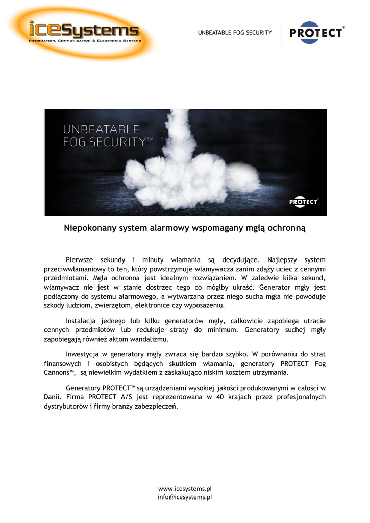 Niepokonany system alarmowy wspomagany mgłą ochronną Pierwsze sekundy i minuty włamania są decydujące. Najlepszy system przeciwwłamaniowy to ten, który powstrzymuje włamywacza zanim zdąży uciec z cennymi przedmiotami. Mgła ochronna jest idealnym rozwiązaniem. W zaledwie kilka sekund, włamywacz nie jest w stanie dostrzec tego co mógłby ukraść. Generator mgły jest podłączony do systemu alarmowego, a wytwarzana przez niego sucha mgła nie powoduje szkody ludziom, zwierzętom, elektronice czy wyposażeniu. Instalacja jednego lub kilku generatorów mgły, całkowicie zapobiega utracie cennych przedmiotów lub redukuje straty do minimum. Generatory suchej mgły zapobiegają również aktom wandalizmu. Inwestycja w generatory mgły zwraca się bardzo szybko. W porównaniu do strat finansowych i osobistych będących skutkiem włamania, generatory PROTECT Fog Cannons™, są niewielkim wydatkiem z zaskakująco niskim kosztem utrzymania. Generatory PROTECT™ są urządzeniami wysokiej jakości produkowanymi w całości w Danii. Firma PROTECT A/S jest reprezentowana w 40 krajach przez profesjonalnych dystrybutorów i firmy branży zabezpieczeń. www.icesystems.pl [email protected] Powstrzymaj złodzieja w kilka sekund za pomocą mgły Ochrona mgłą jest najbardziej efektywną metodą chroniącą przed skutkami włamań, napadami rabunkowymi i wandalizmem. Intruz, który nie zostanie odstraszony znakami znajdującymi się w oknach, ucieknie natychmiast po uruchomieniu generatora suchej mgły. Włamywacz, który podejmie ryzyko zostanie skutecznie powstrzymany, gdyż nie mogąc odnaleźć wyjścia spanikuje i nie będzie mógł kontynuować skutecznej kradzieży. Mgła może powstrzymać złodzieja nawet przez 1 godzinę, do czasu przybycia policji lub agentów ochrony. Generatory PROTECT™ Fog Cannon nie tylko chronią w trakcie włamań w czasie gdy upoważnione osoby opuściły już budynek, ale także jako urządzenia antynapadowe. Kioski, kantory, stacje benzynowe, sklepy jubilerskie i banki skutecznie używają generatorów Fog Cannon™ do spłoszenia potencjalnych napastników poprzez uruchomienie po naciśnięciu przycisku napadowego. www.icesystems.pl [email protected]