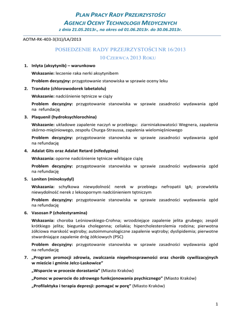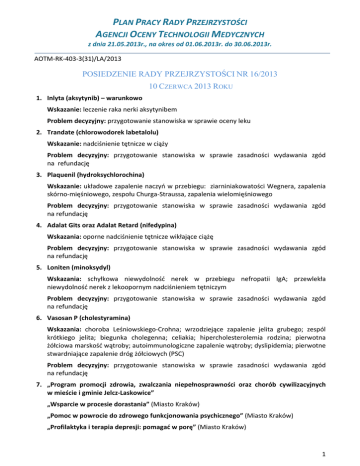 PLAN PRACY RADY PRZEJRZYSTOŚCI AGENCJI OCENY TECHNOLOGII MEDYCZNYCH z dnia 21.05.2013r., na okres od 01.06.2013r. do 30.06.2013r. AOTM‐RK‐403‐3(31)/LA/2013 POSIEDZENIE RADY PRZEJRZYSTOŚCI NR 16/2013 10 CZERWCA 2013 ROKU 1. Inlyta (aksytynib) – warunkowo Wskazanie: leczenie raka nerki aksytynibem Problem decyzyjny: przygotowanie stanowiska w sprawie oceny leku 2. Trandate (chlorowodorek labetalolu) Wskazanie: nadciśnienie tętnicze w ciąży Problem decyzyjny: przygotowanie stanowiska w sprawie zasadności wydawania zgód na refundację 3. Plaquenil (hydroksychlorochina) Wskazanie: układowe zapalenie naczyń w przebiegu: ziarniniakowatości Wegnera, zapalenia skórno‐mięśniowego, zespołu Churga‐Straussa, zapalenia wielomięśniowego Problem decyzyjny: przygotowanie stanowiska w sprawie zasadności wydawania zgód na refundację 4. Adalat Gits oraz Adalat Retard (nifedypina) Wskazania: oporne nadciśnienie tętnicze wikłające ciążę Problem decyzyjny: przygotowanie stanowiska w sprawie zasadności wydawania zgód na refundację 5. Loniten (minoksydyl) Wskazania: schyłkowa niewydolność nerek w przebiegu nefropatii IgA; przewlekła niewydolność nerek z lekoopornym nadciśnieniem tętniczym Problem decyzyjny: przygotowanie stanowiska w sprawie zasadności wydawania zgód na refundację 6. Vasosan P (cholestyramina) Wskazania: choroba Leśniowskiego‐Crohna; wrzodziejące zapalenie jelita grubego; zespól krótkiego jelita; biegunka cholegenna; celiakia; hipercholesterolemia rodzina; pierwotna żółciowa marskość wątroby; autoimmunologiczne zapalenie wątroby; dyslipidemia; pierwotne stwardniające zapalenie dróg żółciowych (PSC) Problem decyzyjny: przygotowanie stanowiska w sprawie zasadności wydawania zgód na refundację 7. „Program promocji zdrowia, zwalczania niepełnosprawności oraz chorób cywilizacyjnych w mieście i gminie Jelcz‐Laskowice” „Wsparcie w procesie dorastania” (Miasto Kraków) „Pomoc w powrocie do zdrowego funkcjonowania psychicznego” (Miasto Kraków) „Profilaktyka i terapia depresji: pomagać w porę” (Miasto Kraków) 1 Problem decyzyjny: przygotowanie opinii o projektach programów zdrowotnych jednostek samorządu terytorialnego 8. „Zdrowa Gmina” (Miasto Konstancin‐Jeziorna) „Szczepienia mieszkańców przeciwko grypie” (Gmina Mielno) „Program szczepień ochronnych przeciw grypie dla osób po 65 roku życia” (Miasto Kraków) „Program szczepień przeciwko grypie dla mieszkańców Chorzowa powyżej 60 roku życia na lata 2013‐2014” „Program profilaktyczny w zakresie szczepień przeciw grypie osób starszych” (Gmina Kamieniec Ząbkowicki) „Program profilaktycznych szczepień przeciwko grypie dla mieszkańców miasta Turku powyżej 65 roku życia na lata 2013‐2014” „Program zdrowotny w zakresie profilaktyki ‐ szczepienie profilaktyczne osób po 65 roku życia, przeciwko grypie” (Miasto Bierutów) „Program szczepień przeciw grypie dla mieszkańców Miasta Kielce na lata 2013‐2016” Problem decyzyjny: przygotowanie opinii o projektach programów zdrowotnych jednostek samorządu terytorialnego POSIEDZENIE RADY PRZEJRZYSTOŚCI NR 17/2013 17 CZERWCA 2013 ROKU 1. Pylera 140 mg +125 mg + 125 mg (bizmut potasu cytrynianu zasadowego + metronidazol + chlorowodorek tetracykliny) Wskazania: eradykacja Helicobacter pylori, zapobieganie nawrotowi wrzodów żołądka u pacjentów z wrzodami żołądka związanymi z czynnym lub przebytym zakażeniem Helicobacter pylori Problem decyzyjny: przygotowanie stanowiska w sprawie oceny leku 2. Esbriet (pirfenidon) – warunkowo Wskazanie: leczenie idiopatycznego włóknienia płuc (ICD‐10 J 84.1) Problem decyzyjny: przygotowanie stanowiska w sprawie oceny leku 3. Lamprene (klofazymina) Wskazania: mykobakterioza płuc Problem decyzyjny: przygotowanie stanowiska w sprawie zasadności wydawania zgód na refundację 4. Tript‐(OH) (oxitriptanum) Wskazania: fenyloketonuria – defekt syntezy biopteryn Problem decyzyjny: przygotowanie stanowiska w sprawie zasadności wydawania zgód na refundację 5. Winstrol (stanozolol) Wskazania: wrodzony obrzęk naczynioruchowy Problem decyzyjny: przygotowanie stanowiska w sprawie zasadności wydawania zgód na refundację 6. „Program profilaktyki próchnicy na lata 2013‐2015 u dzieci” (Miasto Kraków) 2 „Program profilaktyki próchnicy na lata 2013‐2015 u dzieci niepełnosprawnych” (Miasto Kraków) „Program profilaktyki próchnicy u dzieci i młodzieży szkolnej” (Miasto Sosnowiec) „Program edukacyjny dla dzieci z przedszkoli na terenie miasta Płocka w zakresie zapobiegania próchnicy, chorobom dziąseł i wadom zgryzu” „Program zapobiegania próchnicy i chorobom dziąseł u dzieci w wieku przedszkolnym gminy Brusy pn. „Zdrowy ząbek” na lata 2014‐2019” „Program profilaktyki stomatologicznej dla dzieci zamieszkałych w krośnie, uczęszczających do przedszkoli i II klas szkół podstawowych” „Program profilaktyczno‐leczniczy próchnicy zębów dla dzieci 12‐letnich ze szkół Miasta Lębork” „Gminny program profilaktyki stomatologicznej dla uczniów szkół podstawowych i gimnazjalnych z terenu Gminy Baranowo na rok 2013” „Program zdrowotny w zakresie profilaktyki próchnicy zębów u dzieci i młodzieży od 7 do 16 roku życia z terenu Gminy Otwock w 2013 roku” Problem decyzyjny: przygotowanie opinii o projektach programów zdrowotnych jednostek samorządu terytorialnego 7. „Po radosne macierzyństwo” (Powiat Raciborski) Problem decyzyjny: przygotowanie opinii o projekcie programu zdrowotnego jednostki samorządu terytorialnego 8. „Program profilaktyczno ‐ edukacyjny przeciwdziałania cukrzycy dla mieszkańców Gminy Pilchowice” (Gmina Pilchowice) „Program profilaktyki cukrzycy i promocji zdrowia w cukrzycy w gminie Boguchwała – w ramach „Gminnego Ochrony i Profilaktyki Zdrowia Mieszkańców Gminy Boguchwała na lata 2013‐2014”” „Dni walki 