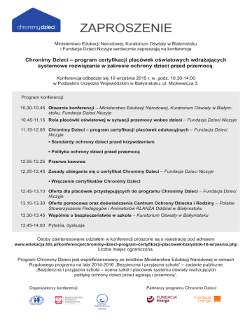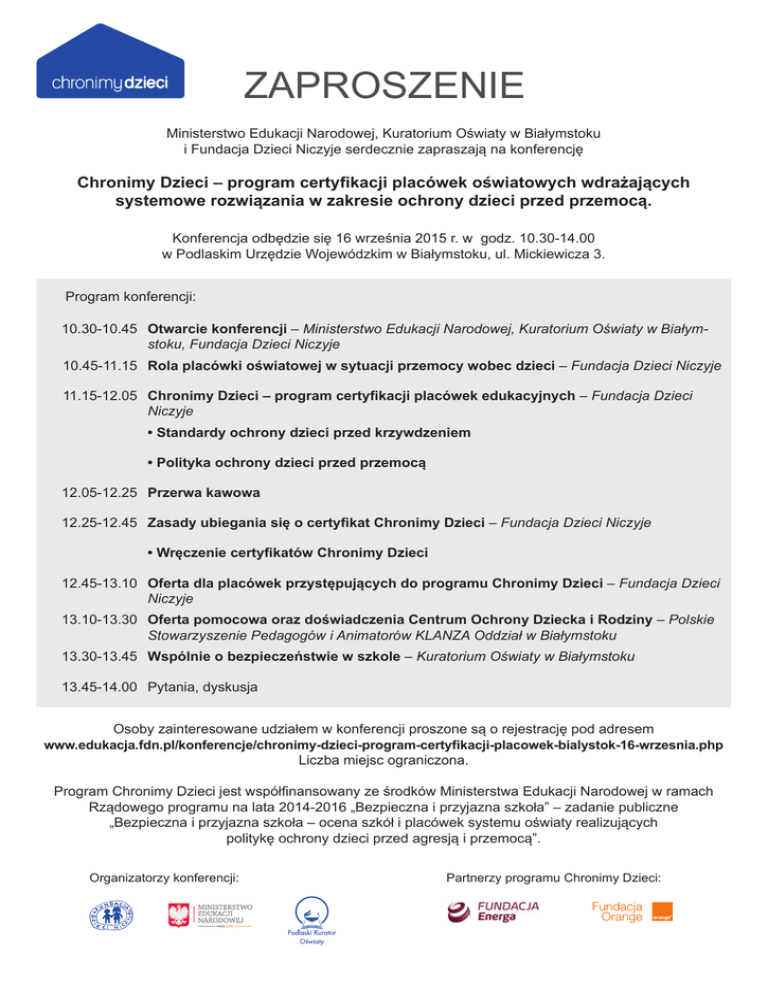 ZAPROSZENIE Ministerstwo Edukacji Narodowej, Kuratorium Oświaty w Białymstoku i Fundacja Dzieci Niczyje serdecznie zapraszają na konferencję Chronimy Dzieci – program certyfikacji placówek oświatowych wdrażających systemowe rozwiązania w zakresie ochrony dzieci przed przemocą. Konferencja odbędzie się 16 września 2015 r. w godz. 10.30-14.00 w Podlaskim Urzędzie Wojewódzkim w Białymstoku, ul. Mickiewicza 3. Program konferencji: 10.30-10.45 Otwarcie konferencji – Ministerstwo Edukacji Narodowej, Kuratorium Oświaty w Białymstoku, Fundacja Dzieci Niczyje 10.45-11.15 Rola placówki oświatowej w sytuacji przemocy wobec dzieci – Fundacja Dzieci Niczyje 11.15-12.05 Chronimy Dzieci – program certyfikacji placówek edukacyjnych – Fundacja Dzieci Niczyje • Standardy ochrony dzieci przed krzywdzeniem • Polityka ochrony dzieci przed przemocą 12.05-12.25 Przerwa kawowa 12.25-12.45 Zasady ubiegania się o certyfikat Chronimy Dzieci – Fundacja Dzieci Niczyje • Wręczenie certyfikatów Chronimy Dzieci 12.45-13.10 Oferta dla placówek przystępujących do programu Chronimy Dzieci – Fundacja Dzieci Niczyje 13.10-13.30 Oferta pomocowa oraz doświadczenia Centrum Ochrony Dziecka i Rodziny – Polskie Stowarzyszenie Pedagogów i Animatorów KLANZA Oddział w Białymstoku 13.30-13.45 Wspólnie o bezpieczeństwie w szkole – Kuratorium Oświaty w Białymstoku 13.45-14.00 Pytania, dyskusja Osoby zainteresowane udziałem w konferencji proszone są o rejestrację pod adresem www.edukacja.fdn.pl/konferencje/chronimy-dzieci-program-certyfikacji-placowek-bialystok-16-wrzesnia.php Liczba miejsc ograniczona. Program Chronimy Dzieci jest współfinansowany ze środków Ministerstwa Edukacji Narodowej w ramach Rządowego programu na lata 2014-2016 „Bezpieczna i przyjazna szkoła” – zadanie publiczne „Bezpieczna i przyjazna szkoła – ocena szkół i placówek systemu oświaty realizujących politykę ochrony dzieci przed agresją i przemocą”. Organizatorzy konferencji: Partnerzy programu Chronimy Dzieci: