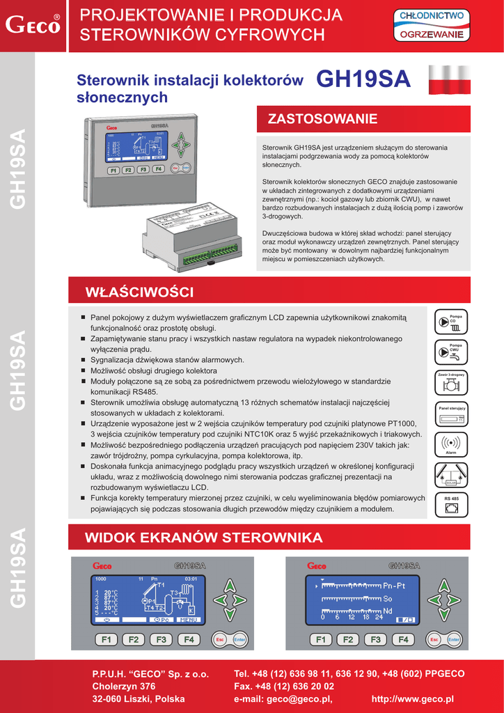 R PROJEKTOWANIE I PRODUKCJA STEROWNIKÓW CYFROWYCH Sterownik instalacji kolektorów słonecznych CHŁODNICTWO OGRZEWANIE GH19SA GH19SA ZASTOSOWANIE Sterownik GH19SA jest urządzeniem służącym do sterowania instalacjami podgrzewania wody za pomocą kolektorów słonecznych. Sterownik kolektorów słonecznych GECO znajduje zastosowanie w układach zintegrowanych z dodatkowymi urządzeniami zewnętrznymi (np.: kocioł gazowy lub zbiornik CWU), w nawet bardzo rozbudowanych instalacjach z dużą ilością pomp i zaworów 3-drogowych. Dwuczęściowa budowa w której skład wchodzi: panel sterujący oraz moduł wykonawczy urządzeń zewnętrznych. Panel sterujący może być montowany w dowolnym najbardziej funkcjonalnym miejscu w pomieszczeniach użytkowych. GH19SA GH19SA WŁAŚCIWOŚCI Panel pokojowy z dużym wyświetlaczem graficznym LCD zapewnia użytkownikowi znakomitą funkcjonalność oraz prostotę obsługi. Zapamiętywanie stanu pracy i wszystkich nastaw regulatora na wypadek niekontrolowanego wyłączenia prądu. Sygnalizacja dźwiękowa stanów alarmowych. Możliwość obsługi drugiego kolektora Moduły połączone są ze sobą za pośrednictwem przewodu wielożyłowego w standardzie komunikacji RS485. Sterownik umożliwia obsługę automatyczną 13 różnych schematów instalacji najczęściej stosowanych w układach z kolektorami. Urządzenie wyposażone jest w 2 wejścia czujników temperatury pod czujniki platynowe PT1000, 3 wejścia czujników temperatury pod czujniki NTC10K oraz 5 wyjść przekaźnikowych i triakowych. Możliwość bezpośredniego podłączenia urządzeń pracujących pod napięciem 230V takich jak: zawór trójdrożny, pompa cyrkulacyjna, pompa kolektorowa, itp. Doskonała funkcja animacyjnego podglądu pracy wszystkich urządzeń w określonej konfiguracji układu, wraz z możliwością dowolnego nimi sterowania podczas graficznej prezentacji na rozbudowanym wyświetlaczu LCD. Funkcja korekty temperatury mierzonej przez czujniki, w celu wyeliminowania błędów pomiarowych pojawiających się podczas stosowania długich przewodów między czujnikiem a modułem. Pompa CO Pompa CWU Zawór 3-drogowy Panel sterujący A Alarm RS 485 WIDOK EKRANÓW STEROWNIKA P.P.U.H. “GECO” Sp. z o.o. Cholerzyn 376 32-060 Liszki, Polska Tel. +48 (12) 636 98 11, 636 12 90, +48 (602) PPGECO Fax. +48 (12) 636 20 02 e-mail: [email protected], http://www.geco.pl SCHEMAT POŁĄCZEŃ Schemat połączeń elektrycznych Un O1 N O2 N O3 N O4 N L O5 O5 O5 N Wyjścia 01 L Wyjście triaka, (0 - 230V) 02 L Wyjście triaka, (0 - 230V) 03 L Wyjście przekaźnika: 0/230 V 04 L Wyjście przekaźnika: 0/230V PPUH GECO Sp. Z o.o. 32-060 Liszki, Cholerzyn 376 tel. +48 (12) 6369811 fax 6362002 www.geco.pl e-mail:[email protected] 05 L Wyjście przekaźnika przełączę bez napięciowe, L Podłączenie zasilania sterownika: ~ 230VAC, N Obciążenie prądowe: Imax=10A Wejścia Wejścia T1 Wejście czujników temp. - czujnik platynowy PT1000 Un RS 485 RS+ RS- +12V I1 I1 I2 I2 I3 I3 I4 I4 I5 I5 I6 I6 T2 Wejście czujników temp. - czujnik NTC10K T3 Wejście czujników temp. - czujnik NTC10K T4 Wejście czujników temp. - czujnik platynowy PT1000 T5 Wejście czujników temp. - czujnik NTC10K GH19SA Model: MGH19SA-AA-50A1 Ns.: 00000 Data Prod: 01-10 SCHEMAT INSTALACJI R T1 T4 Pc P2 T3 G G Pk T2 Rys.2 Schemat instalacji z dodatkowym podgrzewaczem sprzężonym pompą cyrkulacyjną oraz dodatkową grzałką elektryczną. Rys.2 Schemat instalacji kotłowej z dwoma kolektorami,dodatkowym podgrzewaczem kotłowym, oraz dodatkową pompa cyrkulacyjną GH19SA P1 T5 DANE TECHNICZNE Napięcie pracy 230V +10%/ -15% Temperatura pracy od +5°C do + 40°C Czujnik temp. (NTC) 10 kW Czujnik temp. (PT1000) Wilgotność 20% ÷ 80% RH °C W °C NTC - zakres:od -40°C do 120°C -40 73 061 -40 842,7 Typy czujników Maksymalne obciążenie ciągłe -30 38 544 -30 882,2 -20 21 199 -20 921,6 -10 12 110 -10 0 1000,00 960,9 Triak 1A 200W 0 7 162 Triak 1A 200W 10 4 372 50 1194,00 1385,10 1573,30 Przekaźnik napięciowe 2A 400W 20 2 747 100 Przekaźnik napięciowe 2A 400W 30 1 773 150 400W 1 173 1758,60 2A 40 200 Przekaźnik bez napięć. 50 793,2 250 1941,00 60 547,8 300 2120,50 70 385,7 350 2297,20 80 276,4 400 2470,90 90 201,4 100 149,0 110 120 111,8 85,05 Standardowe: 1) 2) 3) 4) 5) 6) moduł wykonawczy panel sterujący. przewód wielożyłowy RS 485 czujnik do pomiaru temp. kolektora - T1 czujnik do pomiaru temp. w zbiorniku - T2 czujnik do pomiaru dodatkowej temp. zależnie od konfiguracji - T3 (T5) 7) przewód zasilający Dodatkowe: 1) czujnik do obliczania mocy chwilowej kolektora lub w układzie z 2 kolektorami -T4 2) czujnik do pomiaru dodatkowej temp. zależnie od konfiguracji - T5 Sterowane urządzenia: 1) 2) 3) 4) 5) 6) pompa kolektorowa pompa cyrkulacyjna grzałka elektryczna pompa kotłowa kocioł gazowy zawór 3-drogowy GH19SA Wyjście Pt1000 - zak.:od -40°C do 400°C W Wyposażenie sterownika GH19SA