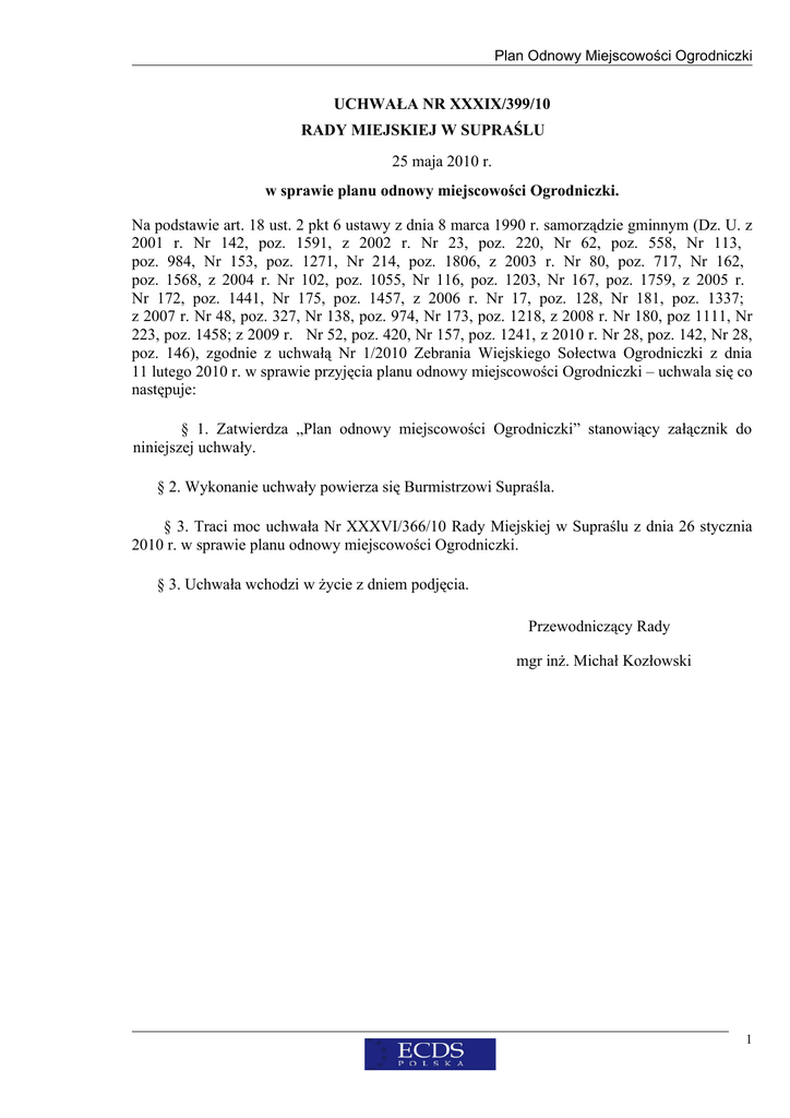 Plan Odnowy Miejscowości Ogrodniczki UCHWAŁA NR XXXIX/399/10 RADY MIEJSKIEJ W SUPRAŚLU 25 maja 2010 r. w sprawie planu odnowy miejscowości Ogrodniczki. Na podstawie art. 18 ust. 2 pkt 6 ustawy z dnia 8 marca 1990 r. samorządzie gminnym (Dz. U. z 2001 r. Nr 142, poz. 1591, z 2002 r. Nr 23, poz. 220, Nr 62, poz. 558, Nr 113, poz. 984, Nr 153, poz. 1271, Nr 214, poz. 1806, z 2003 r. Nr 80, poz. 717, Nr 162, poz. 1568, z 2004 r. Nr 102, poz. 1055, Nr 116, poz. 1203, Nr 167, poz. 1759, z 2005 r. Nr 172, poz. 1441, Nr 175, poz. 1457, z 2006 r. Nr 17, poz. 128, Nr 181, poz. 1337; z 2007 r. Nr 48, poz. 327, Nr 138, poz. 974, Nr 173, poz. 1218, z 2008 r. Nr 180, poz 1111, Nr 223, poz. 1458; z 2009 r. Nr 52, poz. 420, Nr 157, poz. 1241, z 2010 r. Nr 28, poz. 142, Nr 28, poz. 146), zgodnie z uchwałą Nr 1/2010 Zebrania Wiejskiego Sołectwa Ogrodniczki z dnia 11 lutego 2010 r. w sprawie przyjęcia planu odnowy miejscowości Ogrodniczki – uchwala się co następuje: § 1. Zatwierdza „Plan odnowy miejscowości Ogrodniczki” stanowiący załącznik do niniejszej uchwały. § 2. Wykonanie uchwały powierza się Burmistrzowi Supraśla. § 3. Traci moc uchwała Nr XXXVI/366/10 Rady Miejskiej w Supraślu z dnia 26 stycznia 2010 r. w sprawie planu odnowy miejscowości Ogrodniczki. § 3. Uchwała wchodzi w życie z dniem podjęcia. Przewodniczący Rady mgr inż. Michał Kozłowski 1 Plan Odnowy Miejscowości Ogrodniczki do uchwały Nr XXXIX/399/10 Rady Miejskiej w Supraślu z dnia 25 maja 2010 r. Plan Odnowy Miejscowości Ogrodniczki Białystok 2010 2 Plan Odnowy Miejscowości Ogrodniczki Spis treści do uchwały Nr XXXIX/399/10 Rady Miejskiej w Supraślu z dnia 25 maja 2010 r.......................................................................................................................................................................... 2 WSTĘP 4 1. CHARAKTERYSTYKA MIEJSCOWOŚCI OGRODNICZKI........................................................................................................... 5 1.1. Podstawowe informacje....................................................................................................................................... 5 1.2. Położenie i przynależność administracyjna......................................................................................................... 6 1.3. Demografia i ludność...........................................................................................................................................7 1.4. Rys historyczny....................................................................................................................................................8 1.5. Określenie przestrzennej struktury miejscowości..............................................................................................11 2. INWENTARYZACJA ZASOBÓW SŁUŻĄCYCH ODNOWIE MIEJSCOWOŚCI............................................................................ 12 2.1. Zasoby przyrodnicze..........................................................................................................................................12 2.2. Kapitał społeczny...............................................................................................................................................13 2.3. Dziedzictwo kulturowe...................................................................................................................................... 13 2.4. Infrastruktura społeczno – kulturalna................................................................................................................ 14 2.4.1. Oświata i wychowanie ............................................................................................................................... 14 2.4.2. Ochrona zdrowotna i opieka socjalna......................................................................................................... 15 2.4.3. Baza sportowa.............................................................................................................................................16 2.4.4. Kultura ....................................................................................................................................................... 17 2.5. Infrastruktura techniczna................................................................................................................................... 17 2.5.1. Komunikacja .............................................................................................................................................. 17 2.5.2. Zaopatrzenie w wodę i odprowadzanie ścieków oraz gospodarka odpadami............................................ 18 2.5.3. Zaopatrzenie w energię cieplną i gaz..........................................................................................................18 2.6. Gospodarka i rolnictwo......................................................................................................................................19 3. WSTĘP DO PLANU ODNOWY ..................................................................................................................................................... 23 3.1 Jaka jest miejscowość Ogrodniczki?.................................................................................................................. 23 3.2. Inwentaryzacja zasobów miejscowości Ogrodniczki służąca ujęciu stanu rzeczywistego - zestawienie tabelaryczne.............................................................................................................................................................. 24 3.3. Ocena silnych i słabych stron oraz szanse i zagrożenia (analiza SWOT)......................................................... 25 4. PLANOWANE KIERUNKI ROZWOJU MIEJSCOWOŚCI OGRODNICZKI – PLAN ODNOWY MIEJSCOWOŚCI....................... 28 4.1. Jaka powinna być miejscowość Ogrodniczki?....................