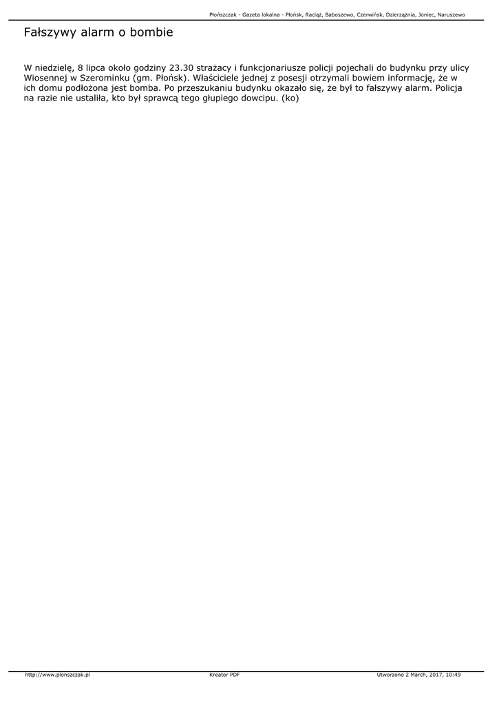 Płońszczak - Gazeta lokalna - Płońsk, Raciąż, Baboszewo, Czerwińsk, Dzierzążnia, Joniec, Naruszewo Fałszywy alarm o bombie W niedzielę, 8 lipca około godziny 23.30 strażacy i funkcjonariusze policji pojechali do budynku przy ulicy Wiosennej w Szerominku (gm. Płońsk). Właściciele jednej z posesji otrzymali bowiem informację, że w ich domu podłożona jest bomba. Po przeszukaniu budynku okazało się, że był to fałszywy alarm. Policja na razie nie ustaliła, kto był sprawcą tego głupiego dowcipu. (ko) http://www.plonszczak.pl Kreator PDF Utworzono 2 March, 2017, 10:49