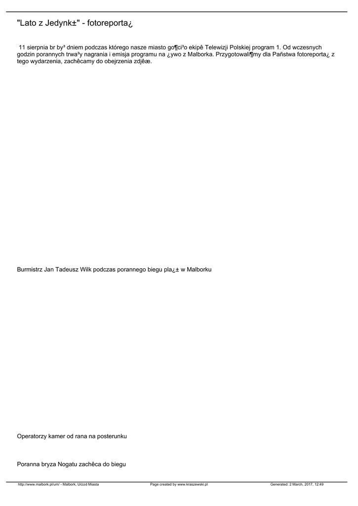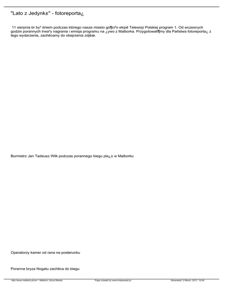 "Lato z Jedynk±" - fotoreporta¿ 11 sierpnia br by³ dniem podczas którego nasze miasto go¶ci³o ekipê Telewizji Polskiej program 1. Od wczesnych godzin porannych trwa³y nagrania i emisja programu na ¿ywo z Malborka. Przygotowali¶my dla Pañstwa fotoreporta¿ z tego wydarzenia, zachêcamy do obejrzenia zdjêæ. Burmistrz Jan Tadeusz Wilk podczas porannego biegu pla¿± w Malborku Operatorzy kamer od rana na posterunku Poranna bryza Nogatu zachêca do biegu http://www.malbork.pl/um/ - Malbork, Urz±d Miasta Page created by www.kraszewski.pl Generated: 2 March, 2017, 12:49 Burmistrz opowiada³ o kapielisku, ¯u³awach i atrakcjach dla aktywnych turystów Ekipa telewizyjna na lotnisku Królewie Malborskim Prowadz±cy Lato z Jedynk± podczas przygotowañ do nagrania Agnieszka Szulim z TVP1 przed wej¶ciem na ¿ywo Malborska m³odzie¿ tworzy logo Lata z Jedynk± w trakcie programu Mincerz z Malborka podczas wybijania szelongów Wioletta Jasiñska - demonstruje podnoszenie ciê¿arów Arkadiusz Dzikowski, opowiada³ o ¶redniowiecznej modzie Efekt koñcowy m³odych artystów - malborskie logo Lata z Jedynk± Przegl±d prasy dla widzów jedynki poprowadzi³a Anna Szade z Dziennika Ba³tyckiego Jaros³aw Dymek podczas rozmowy z Agnieszk± Szulim i Marzen± S³upkowsk± Pokaz mody ¶redniowiecznej Fryzjerzy z Malborka na antenie tworz± wspó³czesn± fryzurê Juranda ze Spychowa Pokaz mody ¶redniowiecznej odby³ siê w Szkole £aciñskiej http://www.malbork.pl/um/ - Malbork, Urz±d Miasta Page created by www.kraszewski.pl Generated: 2 March, 2017, 12:49 Jolanta Marzec podczas prezentacji kolekcji bursztynu Pani Magdalena Marsza³kowska prezentuje bazê noclegow± w Malborku oraz opowiada o g³ównych imprezach Zespó³ Bursztynki zatañczy³ dla widzów w rytm bêbnów taniec afrykañski Agnieszka Szulim i Marzena S³upkowska w ¶redniowiecznych strojach Pawe³ Pochwa³a rozmawia z Pani± Jolant± Leszczyñsk± dyrektor MDK w Malborku oraz z Katarzyn± Fabiañsk± Rozmowa z Panem Jerzym Frycem, który opowiada³ o Szpitalu Jerozolimskim Burmistrz Przemys³aw Guzow opowiada o zrealizowanych projektach, które maj± przyci±gn±æ turystów oraz o planach utworzenia strefy wysokiej jako¶ci us³ug turystycznych Opracowa³ Przemys³aw Zbróg http://www.malbork.pl/um/ - Malbork, Urz±d Miasta Page created by www.kraszewski.pl Generated: 2 March, 2017, 12:49