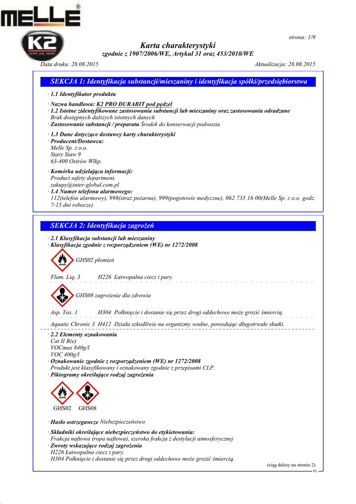 41.1.9 strona: 1/9 Karta charakterystyki zgodnie z 1907/2006/WE, Artykuł 31 oraz 453/2010/WE Data druku: 28.08.2015 Aktualizacja: 28.08.2015 SEKCJA 1: Identyfikacja substancji/mieszaniny i identyfikacja spółki/przedsiębiorstwa · 1.1 Identyfikator produktu · Nazwa handlowa: K2 PRO DURABIT pod pędzel · 1.2 Istotne zidentyfikowane zastosowania substancji lub mieszaniny oraz zastosowania odradzane Brak dostępnych dalszych istotnych danych · Zastosowanie substancji / preparatu Środek do konserwacji podwozia · 1.3 Dane dotyczące dostawcy karty charakterystyki · Producent/Dostawca: Melle Sp. z o.o. Stary Staw 9 63-400 Ostrów Wlkp. · Komórka udzielająca informacji: Product safety department. [email protected] · 1.4 Numer telefonu alarmowego: 112(telefon alarmowy), 998(straż pożarna), 999(pogotowie medyczne), 062 735 16 00(Melle Sp. z o.o. godz. 7-15 dni robocze) SEKCJA 2: Identyfikacja zagrożeń · 2.1 Klasyfikacja substancji lub mieszaniny · Klasyfikacja zgodnie z rozporządzeniem (WE) nr 1272/2008 GHS02 płomień Flam. Liq. 3 H226 Łatwopalna ciecz i pary. GHS08 zagrożenie dla zdrowia H304 Połknięcie i dostanie się przez drogi oddechowe może grozić śmiercią. Asp. Tox. 1 Aquatic Chronic 3 H412 Działa szkodliwie na organizmy wodne, powodując długotrwałe skutki. · 2.2 Elementy oznakowania Cat II B(e) VOCmax 840g/l VOC 400g/l · Oznakowanie zgodnie z rozporządzeniem (WE) nr 1272/2008 Produkt jest klasyfikowany i oznakowany zgodnie z przepisami CLP. · Piktogramy określające rodzaj zagrożenia GHS02 GHS08 · Hasło ostrzegawcze Niebezpieczeństwo · Składniki określające niebezpieczeństwo do etykietowania: Frakcja naftowa (ropa naftowa), szeroka frakcja z destylacji atmosferycznej · Zwroty wskazujące rodzaj zagrożenia H226 Łatwopalna ciecz i pary. H304 Połknięcie i dostanie się przez drogi oddechowe może grozić śmiercią. (ciąg dalszy na stronie 2) PL 41.1.9 strona: 2/9 Karta charakterystyki zgodnie z 1907/2006/WE, Artykuł 31 oraz 453/2010/WE Data druku: 28.08.2015 Aktualizacja: 28.08.2015 Nazwa handlowa: K2 PRO DURABIT pod pędzel (ciąg dalszy od strony 1) H412 Działa szkodliwie na organizmy wodne, powodując długotrwałe skutki. · Zwroty wskazujące środki ostrożności P102 Chronić przed dziećmi. P273 Unikać uwolnienia do środowiska. P301+P310 W PRZYPADKU POŁKNIĘCIA: Natychmiast skontaktować się z lekarzem. P303+P361+P353 W PRZYPADKU KONTATKU ZE SKÓRĄ (lub z włosami): Natychmiast zdjąć całą zanieczyszczoną odzież. Spłukać skórę pod strumieniem wody/prysznicem. P331 NIE wywoływać wymiotów. P405 Przechowywać pod zamknięciem. P501 Zawartość/pojemnik usuwać do pojemnika na odpady. · Dane dodatkowe: EUH066 Powtarzające się narażenie może powodować wysuszanie lub pękanie skóry. · 2.3 Inne zagrożenia · Wyniki oceny właściwości PBT i vPvB · PBT: Nie nadający się do zastosowania. · vPvB: Nie nadający się do zastosowania. SEKCJA 3: Skład/informacja o składnikach · 3.2 Charakterystyka chemiczna: Mieszaniny · Opis: Mieszanka: składająca się z niżej wymienionych składników wraz z bezpiecznymi domieszkami. · Składniki niebezpieczne: CAS: 92045-37-9 Frakcja naftowa (ropa naftowa), szeroka frakcja z destylacji 25-50% EINECS: 295-418-5 atmosferycznej Reg.nr.: 01-2119485600-40-XXXX Flam. Liq. 3, H226; Asp. Tox. 1, H304; Aquatic Chronic 3, H412 <5% CAS: 1330-20-7 ksylen EINECS: 215-535-7 Flam. Liq. 3, H226; Acute Tox. 4, H312; Acute Tox. 4, Reg.nr.: 01-2119488216-32-XXXX H332; Skin Irrit. 2, H315 CAS: 64742-82-1 Benzyna ciężka hydroodsiarczona (ropa naftowa) <5% EINECS: 265-185-4 Flam. Liq. 2, H225; Asp. Tox. 1, H304; Aquatic Reg.nr.: 01-2119490979-12-XXXX Chronic 2, H411; Skin Irrit. 2, H315; STOT SE 3, H336 · Wskazówki dodatkowe: Pełna treść przytoczonych wskazówek dotyczących zagrożeń znajduje się w rozdziale 16. SEKCJA 4: Środki pierwszej pomocy · 4.1 Opis środków pierwszej pomocy · Wskazówki ogólne: Osoby porażone należy wynieść na świeże powietrze. · Po wdychaniu: Dostarczyć świeże powietrze, w razie dolegliwości wezwać lekarza. · Po styczności ze skórą: Ogólnie produkt nie działa drażniąco na skórę. · Po styczności z okiem: Płukać oczy z otwartą powieką przez kilka minut pod bieżącą wodą. · Po przełknięciu: Przy trwałych dolegliwościach porozumieć się z lekarzem. · 4.2 Najważniejsze ostre i opóźnione objawy oraz skutki narażenia Brak dostępnych dalszych istotnych danych · 4.3 Wskazania dotyczące wszelkiej natychmiastowej pomocy lekarskiej i szczególnego postępowania z poszkodowanym Brak dostępnych dalszych istotnych danych PL (ciąg dalszy na stronie 3) 41.1.9 strona: 3/9 Karta charakterystyki zgodnie z 1907/2006/WE, Artykuł 31 oraz 453/2010/WE Data druku: 28.08.2015 Aktualizacja: 28.08.2015 Nazwa handlowa: K2 PRO DURABIT pod pędzel (ciąg dalszy od strony 2) SEKCJA 5: Postępowanie w przypadku pożaru · 5.1 Środki gaśnicze · Przydatne środki gaśnicze: CO2, proszek gaśniczy lub strumień wody. Większy pożar zwalczać strumieniem wody lub pianą odporną na działanie alkoholu. · Środki gaśnicze nieprzydatne ze względów bezpieczeństwa: Woda pełnym strumieniem · 5.2 Szczególne zagrożenia związane z substancją lub mieszaniną Brak dostępnych dalszych istotnych danych · 5.3 Informacje dla straży pożarnej · Specjalne wyposażenie ochronne: Środki specjalne nie są konieczne. · Inne dane Zagrożone zbiorniki ochłodzić strumieniem wody. SEKCJA 6: Postępowanie w przypadku niezamierzonego uwolnienia do środowiska · 6.1 Indywidualne środki ostrożności, sprzęt ochronny i procedury w sytuacjach awaryjnych Nosić ubranie ochronne. Osoby nie zabezpieczone przenieść w bezpieczne miejsce. · 6.2 Środki ostrożności w zakresie ochrony środowiska: W przypadku przedostania się do zbiorników wodnych lub kanalizacji zawiadomić właściwe władze. Nie dopuścić do przeniknięcia do kanalizacji /