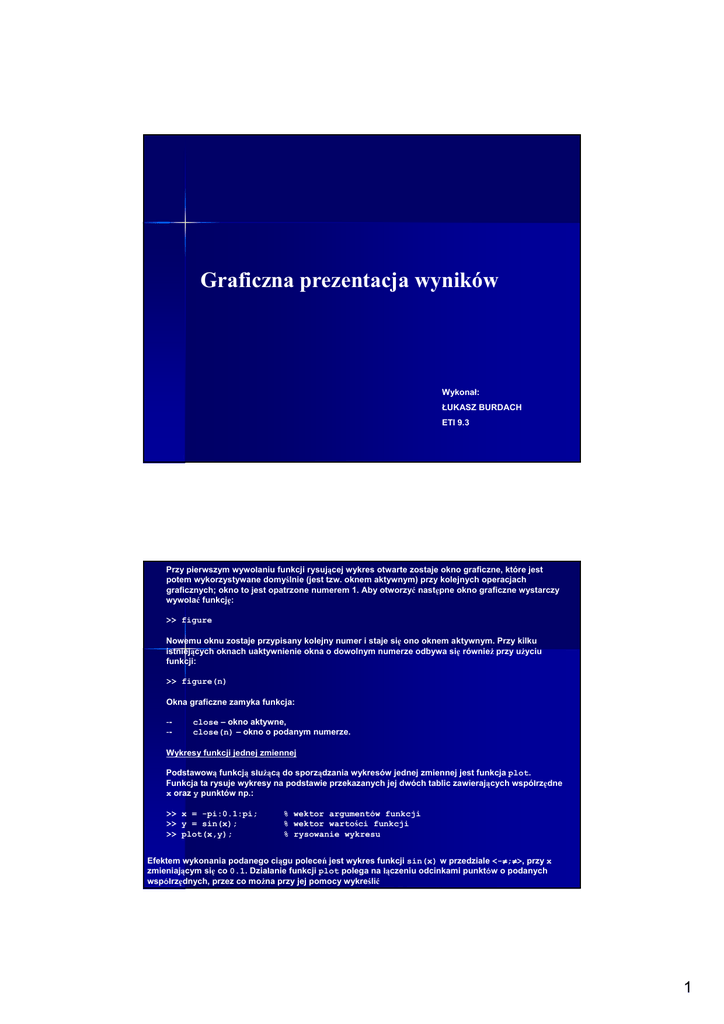 Graficzna prezentacja wyników Wykonał: ŁUKASZ BURDACH ETI 9.3 Przy pierwszym wywołaniu funkcji rysującej wykres otwarte zostaje okno graficzne, które jest potem wykorzystywane domyślnie (jest tzw. oknem aktywnym) przy kolejnych operacjach graficznych; okno to jest opatrzone numerem 1. Aby otworzyć następne okno graficzne wystarczy wywołać funkcję: >> figure Nowemu oknu zostaje przypisany kolejny numer i staje się ono oknem aktywnym. Przy kilku istniejących oknach uaktywnienie okna o dowolnym numerze odbywa się równieŜ przy uŜyciu funkcji: >> figure(n) Okna graficzne zamyka funkcja: --- close – okno aktywne, close(n) – okno o podanym numerze. Wykresy funkcji jednej zmiennej Podstawową funkcją słuŜącą do sporządzania wykresów jednej zmiennej jest funkcja plot. Funkcja ta rysuje wykresy na podstawie przekazanych jej dwóch tablic zawierających współrzędne x oraz y punktów np.: >> x = -pi:0.1:pi; >> y = sin(x); >> plot(x,y); % wektor argumentów funkcji % wektor wartości funkcji % rysowanie wykresu Efektem wykonania podanego ciągu poleceń jest wykres funkcji sin(x) w przedziale <-π π;π π>, przy x zmieniającym się co 0.1. Działanie funkcji plot polega na łączeniu odcinkami punktów o podanych współrzędnych, przez co moŜna przy jej pomocy wykreślić 1 Efektem wykonania podanego ciągu poleceń jest wykres funkcji sin(x) w przedziale <-π π;π π>, przy x zmieniającym się co 0.1. Działanie funkcji plot polega na łączeniu odcinkami punktów o podanych współrzędnych, przez co moŜna przy jej pomocy wykreślić dowolną krzywą. Z zasady działania funkcji wynika jeszcze jeden waŜny wniosek – im więcej współrzędnych podamy, tym wykres będzie dokładniejszy. Funkcja plot umoŜliwia takŜe rysowanie wielu krzywych na jednym wykresie. W tym przypadku podać odpowiednią liczbę par tablic ze współrzędnymi punktów. Np. po wykonaniu poniŜszego ciągu poleceń: >> x = -pi:0.1:pi; >> plot(x,sin(x),x,cos(x)); w jednym układzie współrzędnych zostaną wyświetlone wykresy funkcji trygonometrycznych sin(x) oraz cos(x). 2 MoŜliwe jest takŜe określenie rodzaju i koloru linii, jaką mają być rysowane wykresy. W tym celu naleŜy za kaŜdą parą wektorów współrzędnych umieścić jedno-, dwu- lub trzyznakowy łańcuch zawierający: ---- kod koloru, oznaczenie typu linii, rodzaj znacznika umieszczanego w punktach danych. Zestawienie dopuszczalnych znaków łańcucha moŜna uzyskać przy uŜyciu polecenia help plot Przykłady takich łańcuchów: ’y: linia Ŝółta, kropkowana, znak + w + punktach danych ’ ’g- linia zielona, kreskowana ’ ’ko linia czarna, kółka w punktach ’ danych Rysowanie wykresów w skalach innych niŜ liniowa umoŜliwiają funkcje: ---- loglog – w skali logarytmicznej na obu osiach, semilogx – w skali logarytmicznej na osi odciętych, semilogy – w skali logarytmicznej na osi rzędnych. Przedstawione funkcje mogą słuŜyć do rysowania dowolnych krzywych, niekoniecznie wykresów funkcji. Dla wygodnego i precyzyjnego rysowania wykresów zaleŜności funkcyjnych stworzono funkcję fplot. Funkcja ta automatycznie dobiera punkty, w których naleŜy obliczyć wartość funkcji, w taki sposób, aby wykres był dokładny, uwzględniał dynamikę zmian wartości funkcji oraz nie wymagał nadmiernej ilości obliczeń. Oto kilka moŜliwych postaci jej wywołania: fplot(fun,lims) fplot(fun,lims,n) [x,y] = fplot(fun, ...) gdzie: fun – łańcuch znaków zawierający definicję funkcji lub nazwę pliku z funkcją, lims – dwuelementowy wektor zawierający granice przedziału argumentów funkcji. Dodatkowe, opcjonalne argumenty to np. n – liczba określająca minimalną liczbę punktów, uwzględnianych przy sporządzaniu wykresu (domyślnie n = 25). Funkcja wywołana w trzeciej z podanych postaci nie rysuje wykresu, ale zwraca dwa wektory, na podstawie których za pomocą funkcji plot tworzymy wykres funkcji. Uzupełnianie wykresów Wykresy moŜna uzupełniać odpowiednimi opisami, przy których podaje się: - nazwy zmiennych reprezentowanych na poszczególnych osiach układu współrzędnych, zaleŜność, jaka została na nim przedstawiona. 3 Do opisywania wykresów słuŜą funkcje: xlabel(’text’) xlabel(’text’, ’Property1’, PropertValue1, ...) wypisanie łańcucha text pod osią odciętych, druga postać wywołania umoŜliwia ustawienie parametrów tekstu: rozmiaru czcionki, stylu czcionki, kąta pisania ylabel(’text’) ylabel(’text’, ’Property1’, PropertyValue1, ...) j.w. dla osi rzędnych title(’text’) tytuł rysunku, dodany na górze text(x,y,’text’) wstawienie tekstu w współrzędne x, y legend(’text1’,’text2’, ..) umieszcza legendę na wykresie, uŜywając do tego podanych tekstów miejscu określonym przez Kolejny element, którym moŜna uzupełnić wykres jest pomocnicza siatka współrzędnych. Nanoszenie lub usuwanie siatki jest realizowane za pomocą funkcji grid: grid on wyświetlenie siatki grid off usunięcie siatki grid przełączenie wyświetlania siatki JeŜeli zajdzie potrzeba, aby do juŜ narysowanego wykresu dołoŜyć następny, naleŜy przed jego sporządzeniem uŜyć funkcji hold: hold on zapobiega usunięciu poprzednich narysowaniem nowego hold off przywraca standardowy tryb pracy tj. czyszczenie okna graficznego przed narysowaniem nowego wykresu hold zmiana aktualnego trybu na przeciwny wykresów przed 4 Zmiana skali Funkcja rysowania wykresu automatycznie ustala skalę, w jakiej wykres jest rysowany. Skalę moŜna zmienić za pomocą funkcji axis. Jej wywołanie w postaci: axis([xmin xmax ymin ymax]) określa zakres skal na poszczególnych osiach układu współrzędnych. Wywołana bez parametru zwraca aktualne wartości tych zakresów. Dalej, występuje teŜ grupa argumentów podawanych w postaci łańcucha, które zmieniają tryby skalowania rysunku. Np. funkcja axis wywołana w następujący sposób: axis(’square’) Matlab p