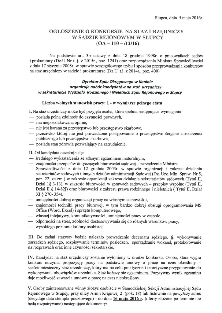 Słupca, dnia 5maja2016r. OGŁOSZENIE O KONKURSIE NA STAŻ URZĘDNICZY W SĄDZIE REJONOWYM W SŁUPCY ( O A - 110-/12/16) Na podstawie art. 3b ustawy z dnia 18 grudnia 1998r. o pracownikach sądów i prokuratury (Dz.U Nr t. j. z 2015r., poz. 1241) oraz rozporządzenia Ministra Sprawiedliwości z dnia 17 stycznia 2008r. w sprawie szczegółowego trybu i sposobu przeprowadzania konkursów na staż urzędniczy w sądzie i prokuraturze (Dz.U. t.j. z 2014r., poz. 400) Dyrektor Sądu Okręgowego w Koninie organizuje nabór kandydatów na staż urzędniczy w sekretariacie Wydziału Rodzinnego i Nieletnich Sądu Rejonowego w Słupcy Liczba wolnych stanowisk pracy: 1 - w wymiarze pełnego etatu I. Na staż urzędniczy może być przyjęta osoba, która spełnia następujące wymagania — posiada pełną zdolność do czynności prawnych, — ma nieposzlakowaną opinię, — nie jest karana za przestępstwo lub przestępstwo skarbowe, — przeciwko której nie jest prowadzone postępowanie o przestępstwo ścigane z oskarżenia publicznego lub przestępstwo skarbowe, — posiada stan zdrowia pozwalający na zatrudnienie. II. Od kandydata oczekuje się: — średniego wykształcenia ze zdanym egzaminem maturalnym, — znajomości przepisów dotyczących biurowości sądowej - zarządzenie Ministra Sprawiedliwości z dnia 12 grudnia 2003r. w sprawie organizacji i zakresu działania sekretariatów sądowych i innych działów administracji Sądowej (Dz. Urz. Min. Spraw. Nr 5, poz. 22, ze zm.) w zakresie organizacji zakresu działania sekretariatów sądowych (Tytuł II, Dział 1§ 3-13), w zakresie biurowości w sprawach sądowych - przepisy wspólne (Tytuł II, Dział II § 14-82j) oraz biurowości z zakresu prawa rodzinnego i nieletnich ( Tytuł II, Dział XI § 270-354), — umiejętności dobrej organizacji pracy na własnym stanowisku, — znajomości techniki pracy biurowej, w tym bardzo dobrej obsługi oprogramowania MS Office (Word, Excel) i sprzętu komputerowego, — własnej inicjatywy, komunikatywności, umiejętności pracy w zespole, — odporności na stres, zdolności dostosowywania się do różnych warunków pracy, — wysokiego poziomu kultury osobistej. III. Do zadań stażysty będzie należało prowadzenie decematu sędziego, tj: wykonywanie zarządzeń sędziego, rozpisywanie terminów posiedzeń, sporządzanie wokand, protokołowanie na rozprawach oraz inne czynności sekretarskie. IV. Kandydat na staż urzędniczy zostanie wyłoniony w drodze konkursu. Osoba, która wygra konkurs otrzyma propozycję pracy na podstawie umowy o pracę na czas określony sześciomiesięczny staż urzędniczy, który ma na celu praktyczne i teoretyczne przygotowanie do wykonywania obowiązków urzędnika. Staż kończy się egzaminem. Pozytywny wynik egzaminu daje możliwość zawarcia umowy o pracę na czas nieokreślony. V. Osoby zainteresowane winny złożyć osobiście w Samodzielnej Sekcji Administracyjnej Sądu Rejonowego w Słupcy, przy ulicy Armii Krajowej 2 (pok. 18) lub listownie na powyższy adres (decyduje data stempla pocztowego) - do dnia 16 maja 2016 r. (oferty złożone po terminie nie będą rozpatrywane) następujące dokumenty: — podanie o pracę, — życiorys zawierający informację o wykształceniu i przebiegu dotychczasowego zatrudnienia, — kwestionariusz osobowy - formularz dostępny w Samodzielnej Sekcji Administracyjnej Sądu oraz na stronie internetowej, — kserokopię świadectwa ukończenia szkoły średniej oraz egzaminu maturalnego, — oświadczenie o posiadaniu pełnej zdolności do czynności prawnych, — oświadczenie o niekaralności za przestępstwo lub przestępstwo skarbowe, — oświadczenie, że przeciwko kandydatowi nie jest prowadzone postępowanie o przestępstwo ścigane z oskarżenia publicznego lub przestępstwo skarbowe. Kandydat może również złożyć inne dokumenty potwierdzające posiadane kwalifikacje, umiejętności i doświadczenie zawodowe (świadectwa ukończenia innych szkół, zaświadczenia ukończenia kursów, itp.). VI. Komisja konkursowa w trakcie pierwszego etapu konkursu dokona selekcji zgłoszeń pod kątem spełnienia wymagań formalnych przystąpienia do konkursu i najpóźniej do dnia 20 maja 2016r. zamieści na tablicy ogłoszeń oraz na stronie internetowej Sądu informację 0 osobach zakwalifikowanych do drugiego etapu konkursu. VII. Drugim etapem konkursu jest praktyczny sprawdzian umiejętności, który polega na komputerowym pisaniu pod nadzorem członków komisji dyktowanego tekstu w czasie oznaczonym, wynoszącym 5 minut. Drugi etap konkursu odbędzie się w dniu 27 maja 2016 r. o godz. 10:00 w sali nr 6 Sądu Rejonowego w Słupcy. Nazwiska i imiona osób dopuszczonych do trzeciego etapu konkursu opublikowane zostaną na tablicy ogłoszeń oraz na stronie internetowej Sądu najpóźniej do 30 maja 2016r. VIII. W trakcie trzeciego etapu konkursu kandydat odpowiada na trzy pytania z zakresu znajomości przepisów dotyczących biurowości sądowej wskazanych w pkt II niniejszego ogłoszenia. Trzeci etap konkursu odbędzie się w dniu 07 czerwca 2016 r. godz. 10°° w sali nr 6 Sądu Rejonowego w Słupcy. Imię i nazwisko osoby wybranej na stanowisko stażysty oraz rezerwowa lista kandydatów opublikowane zostaną na tablicy ogłoszeń oraz na stronie internetowej Sądu najpóźniej w dniu 09 czerwca 2016r. VIII. Administratorem danych osobowych jest Sąd Rejonowy z siedzibą w Słupcy, ul. Armii Krajowej 2, 62-400 Słupca. Dane zbierane są w celu rekrutacji. Przystąpienie do rekrutacji jest dobrowolne. Obowiązek podania danych osobowych, o których mowa w punkcie V ogłoszenia wynika z art. 2 w zw. z art. 3a ustawy z dnia 18 grudnia 1998r. o pracownikach sądów 1prokuratury (Dz.U Nr t. j. z 2015r., poz. 1241); art. 221 ustawy z dnia 26 czerwca 1974 Kodeks pracy (Dz.U. t. j. z 2014r., poz. 1502); § 1 ust. 1 i ust. 2 rozporządzenia Ministra Pracy i Polityki Socjalnej z dnia 28 maja 1996r. w sprawie zakresu prow