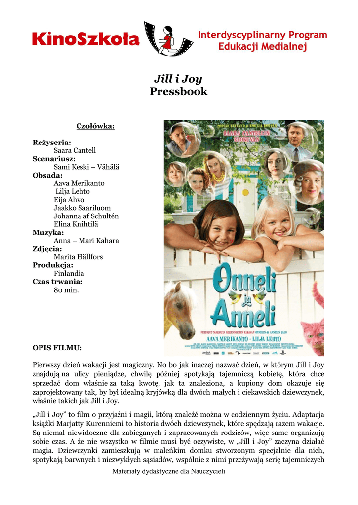 Jill i Joy Pressbook Czołówka: Reżyseria: Saara Cantell Scenariusz: Sami Keski – Vähälä Obsada: Aava Merikanto Lilja Lehto Eija Ahvo Jaakko Saariluom Johanna af Schultén Elina Knihtilä Muzyka: Anna – Mari Kahara Zdjęcia: Marita Hällfors Produkcja: Finlandia Czas trwania: 80 min. OPIS FILMU: Pierwszy dzień wakacji jest magiczny. No bo jak inaczej nazwać dzień, w którym Jill i Joy znajdują na ulicy pieniądze, chwilę później spotykają tajemniczą kobietę, która chce sprzedać dom właśnie za taką kwotę, jak ta znaleziona, a kupiony dom okazuje się zaprojektowany tak, by był idealną kryjówką dla dwóch małych i ciekawskich dziewczynek, właśnie takich jak Jill i Joy. „Jill i Joy” to film o przyjaźni i magii, którą znaleźć można w codziennym życiu. Adaptacja książki Marjatty Kurenniemi to historia dwóch dziewczynek, które spędzają razem wakacje. Są niemal niewidoczne dla zabieganych i zapracowanych rodziców, więc same organizują sobie czas. A że nie wszystko w filmie musi być oczywiste, w „Jill i Joy” zaczyna działać magia. Dziewczynki zamieszkują w maleńkim domku stworzonym specjalnie dla nich, spotykają barwnych i niezwykłych sąsiadów, wspólnie z nimi przeżywają serię tajemniczych Materiały dydaktyczne dla Nauczycieli przygód. Czy któreś z rodziców zorientuje się wreszcie, że dziewczynki się wyprowadziły? Czy dorośli odnajdą magiczną kryjówkę Jill i Joy i poświęcą dziewczynkom swoją uwagę i czas? REŻYSERKA O FILMIE: Najważniejszą rzeczą dla mnie jako reżyserki jest ciepłe i zabawne spojrzenie na świat. Rzeczy nie są wytłumaczalne. Widzowie mogą cieszyć się magią. Głównym tematem w Jill i Joy jest moc wyobraźni i poczucia wspólnoty. To dla mnie najważniejsza rzecz w filmie dla dzieci”. O TWÓRCACH: Saara Cantell (ur. 1968) – reżyserka i scenarzystka, pochodzi z Helsinek. Na początku kariery zajmowała się reżyserowaniem filmów krótkometrażowych oraz seriali. Obecnie tworzy filmy dla dzieci (Unna and Nook) i dla dorosłych (Heartbeats, Stars above). W 2014 roku jej dwa pełne metraże: produkcja dla dzieci Jill i Joy oraz komedia romantyczna The Two and Only okazały się sukcesem frekwencyjnym w Finlandii. http://muranow.gutekfilm.pl/film/jill-i-joy/ http://www.filmweb.pl/film/Jill+i+Joy-2014-691493 [dostęp 03.08.2016] Materiały dydaktyczne dla Nauczycieli