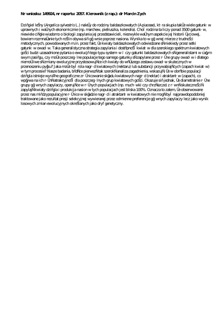 Nr wniosku: 149924, nr raportu: 2057. Kierownik (z rap.): dr Marcin Zych Dzięgiel leśny (Angelica sylvestris L.) należy do rodziny baldaszkowatych (Apiaceae), która skupia także wiele gatunków uprawnych i ważnych ekonomicznie (np. marchew, pietruszka, kolendra). Choć rodzina ta liczy ponad 3500 gatunków, niewiele ciągle wiadomo o biologii zapylania jej przedstawicieli, niezwykle ważnym aspekcie jej historii życiowej, bowiem rozmnażanie tych roślin obywa się głównie poprzez nasiona. Wynika to w głównej mierze z trudności metodycznych, powodowanych m.in. przez fakt, że kwiaty baldaszkowatych odwiedzane są niekiedy przez setki gatunków owadów. Taka generalistyczna strategia zapylania i dostępność kwiatów dla szerokiego spektrum kwiatowych gości budzi uzasadnione pytania o ewolucję tego typu systemów – czy gatunki baldaszkowatych są generalistami w całym swym zasięgu, czy może poszczególne populacje tego samego gatunku są zapylane przez różne grupy owadów i dlatego niemożliwe są zmiany ewolucyjne przystosowujące ich kwiaty do węższego zestawu owadów skutecznych w przenoszeniu pyłku? Jaka może być rola nagród kwiatowych (nektaru) lub substancji przywabiających (zapach kwiatów) w tym procesie? Nasze badania, będące pierwszą tak szeroką analiza zagadnienia, wskazują, że w obrębie populacji dzięgla istnieje wyraźne geograficzne zróżnicowanie składu kwiatowych nagród (nektar) i atraktantów (zapach), co wpływa na ich różną atrakcyjność dla poszczególnych grup kwiatowych gości. Okazuje się jednak, że diametralnie różne grupy głównych zapylaczy, operujące w różnych populacjach (np. muchówki czy chrząszcze) z równą skutecznością zapylają kwiaty dzięgla i produkcja nasion w tych populacjach jest bliska 100%. Oznacza to zatem, że obserwowane przez nas międzypopulacyjne różnice w składzie nagród i atraktantów kwiatowych nie mogą być najprawdopodobniej traktowane jako rezultat presji selekcyjnej wywieranej przez odmienne preferencje głównych zapylaczy lecz jako wynik losowych zmian ewolucyjnych określanych jako dryf genetyczny.