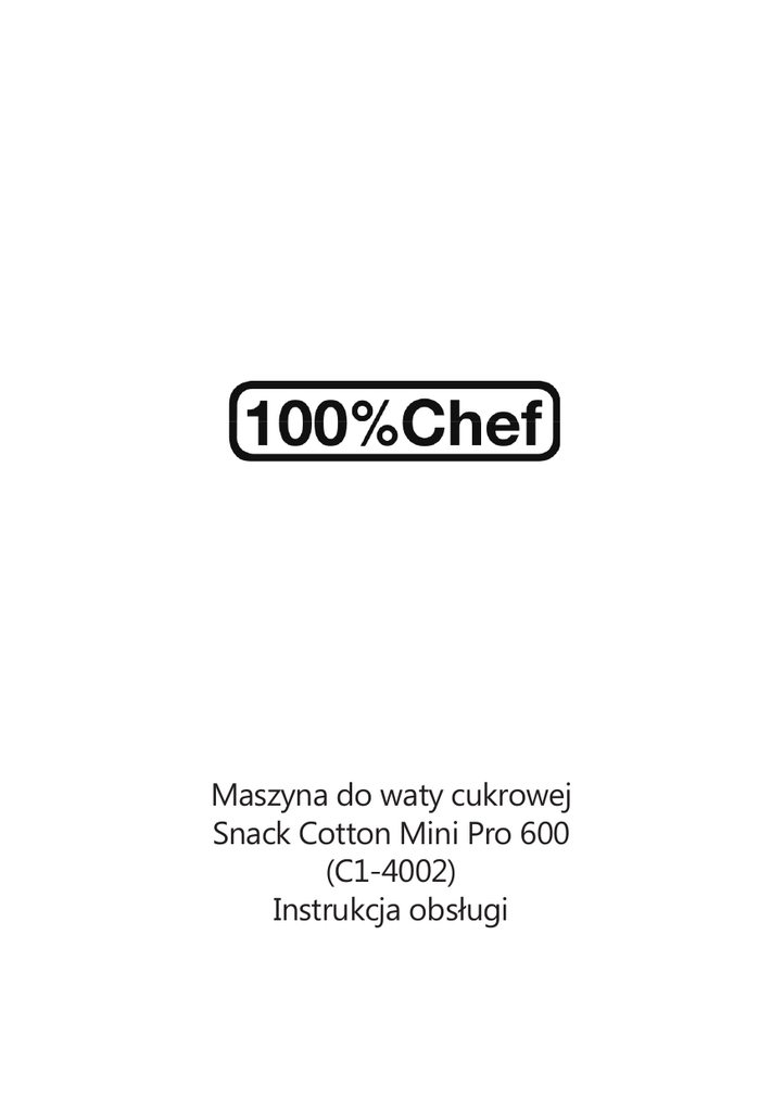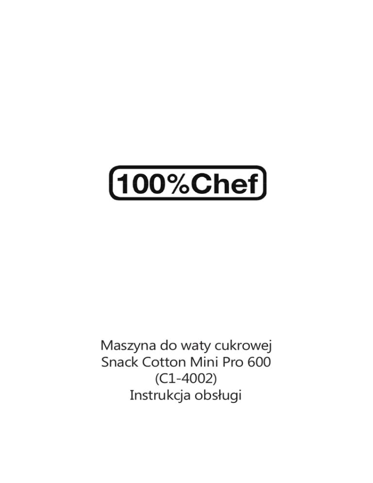 Maszyna do waty cukrowej Snack Cotton Mini Pro 600 (C1-4002) Instrukcja obsługi Ref 40/002-220V-50Hz ref 40/003- 110V-60Hz Snack Cotton Mini pro 600 ŚRODKI OSTROŻNOŚCI 1. Urządzanie musi być właściwie uziemione, aby zapobiec ryzyku porażenia prądem. Nie zanurzać urządzenia w wodzie. Nie używać nadmiernej ilości wody w celu umycia urządzenia. Odłączyć urządzenie od zasilania przed rozpoczęciem czyszczenia lub prac konserwacyjnych. 2. Niewłaściwa instalacja ,montaż, zmiany dokonane w urządzeniu, niewłaściwe serwisowanie i konserwacja mogą być powodem zniszczeń, urazów lub nawet śmierci. .Przeczytać wszystkie informacje zawarte w niniejszej instrukcji obsługi przed rozpoczęciem obsługi lub konserwacji urządzenia . 3. Głowica obraca się z prędkością 3450RPM.Osoba obsługująca urządzenie musi trzymać ręce i głowę z dala od głowicy ,aby nie odnieść obrażeń. Osoby nie obsługujące urządzenia powinny stać w odpowiedniej od niego odległości. Używać osłony Floss Bubble w celu zwiększenia ochrony. 4. Urządzenie jest zaprojektowane i sprzedawane do komercyjnego użytku Nie wolno używać urządzenia w domu. Nie pozwalać na kontakt z urządzeniem osobom postronnym. Tylko przeszkolony i doświadczony pracownik może obsługiwać to urządzenie. Przeczytać uważnie instrukcję obsługi przed rozpoczęciem eksploatacji. 5. Osobom nieletnim nie wolno obsługiwać urządzenia . Za osoby nieletnie uważa się wszystkie osoby poniżej 18 roku życia. Uwaga Wszystkie informacje, dane techniczne, ilustracje zawarte w niniejszej instrukcji obsługi są najświeższymi danymi dostępnymi w momencie publikacji. Cocina sin limites zastrzega sobie prawo do wprowadzenia zmian bez wcześniejszego ostrzeżenia WSTĘP SNACKCOTTON Mini-Pro 600 jest miniaturą urządzenia do produkcji waty cukrowej. Chociaż wyglądem przypomina zabawkę, jej funkcje, moc i wytrzymałość dorównują pełnowymiarowym, profesjonalnym urządzeniom. Poza tym W 100%chef skonstruowaliśmy takie urządzenie które może być używane z każdym rodzajem cukru(isomalt, biały) dzięki zmianie ustawienia poprzez zmianę ustawienia bębna. Można wyprodukować słoną watę z dodatkiem dowolnego smaku: sera, pomidora, różnego, ogórka no i oczywiście watę cukrowa o różnych kolorach i smakach. SNACKCOTTON Mini-Pro 600 jest wygodnym, szybkim, wytrzymałym i wydajnym urządzeniem UWAGA Warunki gwarancji urządzenia opisane są z tyłu niniejszej instrukcji. Gwarancja nie obejmuje pokrywy, nakładki wirnika, obręczy, łożysk silnika ponieważ mogą zostać one uszkodzone przez osobę obsługującą urządzenie WYMAGANIA ELEKTRYCZNE NIEBEZPIECZEŃSTWO Urządzenie do waty cukrowej musi być bezwzględnie uziemione! SNACKCOTTON Mini-Pro 600 musi być podłączone do sieci 50Hz, 220 wolt 600W lub 60 Hz 110 wolt 600W w przypadku urządzenia o numerze ref.40/0003 Przewód elektryczny jest uziemieniem zakończony wtyczką męska z bolcem uziemienia. Zawsze należy podłączyć urządzenie do uziemionego gniazda w którym sprawdzono poprawność polaryzacji w celu zapewnienia bezpieczeństwa PRZED PODŁĄCZENIEM URZĄDZENIA Wyjąć urządzenie z opakowania i usunąć materiały zabezpieczające. Po wypakowaniu, należy dokładnie sprawdzić czy urządzenie nie zostało uszkodzone podczas transportu. Wszelkie szkody należy zgłaszać firmie przewozowej. Gwarancja nie obejmuje również uszkodzeń powstałych podczas transportu lub szkód powstałych w wyniku niewłaściwego użytkowania lub szkód następczych spowodowanych użytkowaniem tego urządzenia ponieważ jest to poza nasza kontrolą. PRZEŁACZNIKI I FUNKCJE Przełącznik główny - włącza i wyłącza silnik i doprowadza prąd do przełącznika grzałki. INSTRUKCJE UŻYTKOWANIA Najłatwiejszym sposobem aby zagwarantować odpowiednią teksturę waty o odpowiednim smaku i kolorze jest korzystanie z cukru kryształu lub profesjonalnego cukru FLOSSUGAR. Dzięki FLOSSUGAR otrzymujemy dobrą watę bogatą w kolory i smaki i nigdy nie wyczerpiemy dostępnej kolorystyki. Cukier pakowany jest w zapieczętowane, pokryte plastikiem kartony. Do opakowania dołączona jest szyjka do wsypywania cukru. Jeżeli decydujemy się na używanie innych niż nasze smaki należy pamiętać aby nie były one na bazie gumy lub skrobi. przypalają się nitki Test kontrolny ustawień temperatury 1.Postepować zgodnie ze wskazówkami na stronie 1 dotyczącymi podłączenia urządzenia 2. Przełącznik ustawić w pozycji ON na 5 minut aż urządzenie się całkowicie nagrzeje Przełącznik ustawić w pozycji OFF i napełnić głowicę. NIE PRZEPEŁNIAĆ! W przypadku przepełnienia głowica wpada w nadmierne wibracje. Przed włączeniem urządzenia ręcznie obrócić głowicą, aby wyrównać poziom cukru. To wyeliminuje nadmierne wibracje głowicy WAŻNE Nie dodawać cukru kiedy silnik jest włączony 3. Główny przełącznik ustawić w pozycji ON 4.Urządzenie po kilku sekundach zacznie produkować watę 5. Po znalezieniu optymalnych stawień Kontroli Temperatury i ilości cukru należy za każdym razem korzystać z tych ustawień. PRODUKCJA WATY Upewnić się, że w pomieszczeniu nie panuje wysoka wilgotność bo produkt będzie „ciężki”. 1. Nitkę waty przykleić do patyczka 2. Obracać patyczkiem i nawijać watę starając się uformować małą kulę 3. Nawijać watę tak równomiernie jak to jest możliwe 4. Przechowywać w suchym miejscu do momentu podania 5. Dwa poziomy. Dostosuj wysokość wirnika do gatunku cukru jaki jest używany Górna pozycja cukier technologiczny Dolna pozycja cukier zwyczajny NIE WKŁADAĆ RĄK ANI PRZEDMIOTÓW W POBLIŻE WIRUJĄCEJ GŁOWICY NIE NAPEŁNIAĆ WIRUJĄCEJ GŁOWICY CUKREM OSOBA OBSŁUGUJĄCA URZĄDZENIE POWINNA ZAWSZE STOSOWAĆ OCHRONĘ OCZU DEMONTAŻ I CZYSZCZENIE URZĄDZENIA 1. Pozostawić urządzenie włączone, do momentu aż przestanie produkować watę. Zatrzymać urządzenie i odłączyć od zasi