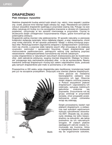 LIPIEC DRAPIEŻNIKI Ptak miesiąca: myszołów drapieżniki ptak miesiąca: myszołów Niektóre drapieżniki budzą wśród ludzi strach (np. rekin), inne respekt i podziw (np. orzeł), jeszcze inne niechęć bądź odrazę (np. wąż). Niezależnie od ludzkich odczuć wszystkie drapieżniki spełniają w przyrodzie ważną rolę. Polując na swe ofiary redukują ich liczbę (co ma szczególne znaczenie w okresie ich masowych pojawów), utrzymując w ten sposób równowagę w przyrodzie. Czynią to skutecznie dzięki umiejętności rozpoznawania miejsc, gdzie koncentruje się potencjalna zdobycz. Drapieżniki pełnią również rolę selekcjonerów. W sposób naturalny w pierwszej kolejności wyłapują zwierzęta, które najłatwiej złapać, a więc niesprawne, chore oraz mniej ostrożne. W ten sposób pośrednio "dbają" o dobrą kondycję populacji ofiar. Redukują bowiem zagrożenia związane z występowaniem i przenoszeniem się chorób, a poprzez stałe nękanie swych ofiar zmuszają je do większej czujności, zwinności i sprawności fizycznej. Część drapieżników jest równocześnie padlinożercami, pełniącymi ważną rolę sanitarną poprzez redukowanie niebezpieczeństwa roznoszenia się chorób zakaźnych. Liczba drapieżników w naturalnych warunkach dostosowana jest do liczebności ofiar. Jeśli zabraknie zdobyczy, wyginą również drapieżniki. Dlatego "w interesie" polującego leży zachowanie populacji ofiar, a nie jej wyniszczenie. Rewiry łowieckie zwierząt drapieżnych muszą być zatem odpowiednio duże, podczas gdy samych drapieżników jest mało w porównaniu z ich ofiarami. Powszechna w XIX wieku wizja drapieżnika jako bezlitosnej, krwiożerczej bestii jest już na szczęście przeżytkiem. Dotyczyła ona również ptaków drapieżnych, które jeszcze do niedawna bezwzględnie zabijano oraz niszczono ich lęgi. Obecnie dzięki objęciu ochroną prawną w Polsce wszystkich ptaków drapieżnych i zaprzestaniu ich odstrzału, sytuacja niektórych gatunków znacznie się poprawiła. Zrozumienie roli tej grupy zwierząt w przyrodzie wzrasta, choć przypadki prześladowania przez człowieka wciąż się zdarzają. Bielik 70 Dzięki prowadzeniu badań nad ptakami drapieżnymi, a zwłaszcza nad sokołem wędrownym wykryto szkodliwość stosowania DDT. Okazało się, że pestycydy działają nie tylko bezpośrednio na szkodniki, ale także pośrednio na ich naturalnych wrogów. W ciałach ptaków zjadających zatrute owady kumulowała się trucizna, która w największej dawce dostawała się do organizmów sokołów, LIPIEC zjadających drobniejsze ptaki. To spowodowało, iż grubość skorupy jaj, znoszonych przez sokoły, była za cienka i nie wytrzymywała ciężaru wysiadującej samicy, która zgniatała je własnym ciałem. Po dalszych badaniach wykryto szkodliwy wpływ DDT na ludzi i wycofano ten środek oraz jego pochodne z produkcji i stosowania w rolnictwie. Jednak w niektórych krajach trzeciego świata nadal stosuje się te trucizny, nie zważając na groźne następstwa dla ludzi i przyrody. W naszym kraju żyje około 20 gatunków dziennych ptaków drapieżnych i 9 gatunków sów. To, że wszystkie znajdują dla siebie pokarm, możliwe jest dzięki ich silnej specjalizacji. Ofiara wymusza na swoim prześladowcy określony sposób zachowania i użycia odpowiedniej techniki polowania. Dla jednych ptaków drapieżnych zdobyczą są głównie gryzonie, inne chwytają płazy i gady, jeszcze inne specjalizują się w chwytaniu ptaków. Sokół wędrowny ściga swe ofiary w powietrzu, polując zwykle na ptaki wielkości gołębia, pustułka poluje na wróble wśród bloków, kobuz potrafi złapać w locie jaskółkę, ale zjada również duże owady. Bieliki i rybołowy potrafią wyciągnąć ryby spod powierzchni wody. Myszołów lubi polować z tak zwanej "zasiadki" i czekać, aż gryzoń wyjdzie z ukrycia. Krogulec natomiast atakuje znienacka wśród drzew i krzewów. Jastrząb i orlik krzykliwy potrafią gonić swą naziemną zdobycz na piechotę, a trzmielojad wykopywać z ziemi larwy os i trzmieli. Drapieżniki nocne i dzienne odróżnia pora polowania. Choć niektóre sowy potrafią zdobywać pokarm również w ciągu dnia, są one doskonale przystosowane do polowań w mroku nocy. Mają znacznie większe od ptaków dziennych oczy, a w czasie wykrywania ofiary głównie kierują się doskonałym słuchem. Dodatkowym ich atutem jest specjalna budowa piór, która umożliwia całkowicie bezszelestny lot. drapieżnik nocny Dzienne ptaki drapieżne posiadają fenomenalny wzrok, który jest ich głównym zmysłem, wykorzystywanym podczas polowania. Rozwinęły ponadto zdolności bardzo szybkiego lotu podczas ataku. Dotyczy to zwłaszcza sokołów i jastrzębi. Cechy wspólne charakterystyczne dla wszystkich ptaków drapieżnych to ostre zakrzywione pazury i dzioby, które służą do przytrzymywania i rozdrabniania ofiar. Bardzo różne są miejsca wybierane przez ptaki drapieżne do budowy gniazda. 71 drapieżniki ptak miesiąca: myszołów drapieżnik dzienny LIPIEC drapieżniki ptak miesiąca: myszołów Myszołów to drapieżnik najczęściej widywany w naszym kraju, nie tylko dlatego, że jest najliczniejszy ze wszystkich ptaków drapieżnych, ale również ze względu na charakterystyczny sposób zachowania. W południe lubi krążyć nad polami, wykorzystując wstępujące prądy ciepłego powietrza, pozwalające mu spiralnie wznosić się ku górze z lekko uniesionymi skrzydłami. Poluje na terenach otwartych, polach i łąkach, gdzie wypatrując ofiary przesiaduje na drzewach, stogach lub palikach ogrodzeniowych. Charakterystyczny jest też jego głos. Dość często wydaje miauczący okrzyk "kiije". Ponieważ jego łowiskami są głównie pola, część osobników zakłada gniazda poza lasami w zadrzewieniach śródpolnych, na skraju których znajdują się miejsca dogodne do czatowania. Niekiedy w czasie polowania myszołów lata nad polem i 