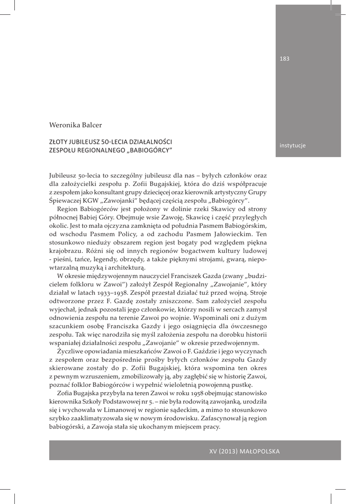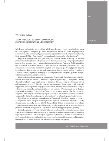 Złoty jubileusz 50-lecia Zespołu Regionalnego „Babiogórcy” 183 Weronika Balcer Złoty Jubileusz 50-lecia działalności Zespołu Regionalnego „Babiogórcy” instytucje Jubileusz 50-lecia to szczególny jubileusz dla nas – byłych członków oraz dla założycielki zespołu p. Zofii Bugajskiej, która do dziś współpracuje z zespołem jako konsultant grupy dziecięcej oraz kierownik artystyczny Grupy Śpiewaczej KGW „Zawojanki” będącej częścią zespołu „Babiogórcy”. Region Babiogórców jest położony w dolinie rzeki Skawicy od strony północnej Babiej Góry. Obejmuje wsie Zawoję, Skawicę i część przyległych okolic. Jest to mała ojczyzna zamknięta od południa Pasmem Babiogórskim, od wschodu Pasmem Policy, a od zachodu Pasmem Jałowieckim. Ten stosunkowo nieduży obszarem region jest bogaty pod względem piękna krajobrazu. Różni się od innych regionów bogactwem kultury ludowej ‑ pieśni, tańce, legendy, obrzędy, a także pięknymi strojami, gwarą, niepowtarzalną muzyką i architekturą. W okresie międzywojennym nauczyciel Franciszek Gazda (zwany „budzicielem folkloru w Zawoi”) założył Zespół Regionalny „Zawojanie”, który działał w latach 1933–1938. Zespół przestał działać tuż przed wojną. Stroje odtworzone przez F. Gazdę zostały zniszczone. Sam założyciel zespołu wyjechał, jednak pozostali jego członkowie, którzy nosili w sercach zamysł odnowienia zespołu na terenie Zawoi po wojnie. Wspominali oni z dużym szacunkiem osobę Franciszka Gazdy i jego osiągnięcia dla ówczesnego zespołu. Tak więc narodziła się myśl założenia zespołu na dorobku historii wspaniałej działalności zespołu „Zawojanie” w okresie przedwojennym. Życzliwe opowiadania mieszkańców Zawoi o F. Gaździe i jego wyczynach z zespołem oraz bezpośrednie prośby byłych członków zespołu Gazdy skierowane zostały do p. Zofii Bugajskiej, która wspomina ten okres z pewnym wzruszeniem, zmobilizowały ją, aby zagłębić się w historię Zawoi, poznać folklor Babiogórców i wypełnić wieloletnią powojenną pustkę. Zofia Bugajska przybyła na teren Zawoi w roku 1958 obejmując stanowisko kierownika Szkoły Podstawowej nr 5. – nie była rodowitą zawojanką, urodziła się i wychowała w Limanowej w regionie sądeckim, a mimo to stosunkowo szybko zaaklimatyzowała się w nowym środowisku. Zafascynował ją region babiogórski, a Zawoja stała się ukochanym miejscem pracy. XV (2013) maŁopolska 184 Weronika Balcer W niedługim czasie doszła do wniosku, że bogactwo pieśni, tańców, legend, obrzędów jeszcze w naturalnym wydaniu wśród mieszkańców Zawoi, może stanowić bazę do założenia zespołu. Na poznanie regionu potrzeba było jednak trochę czasu, aby „rozeznać” gwarę, muzykę, taniec, obrzędy, ubiór oraz poznać architekturę miejscowego regionu. Z uwagi na to, iż literatura dotycząca regionu babiogórskiego była znikoma i trudno dostępna, zbierała pieśni, legendy, obrzędy, tańce w formie zapisów i nagrań. Chodziła niemal wszędzie: na zabawy, wesela, dożynki, chrzciny, zebrania. Przysiadała się do starszych mieszkańców Zawoi przeprowadzając z nimi wiele wywiadów. Pytała o to, jak wyglądało ich codzienne życie kiedy byli młodymi ludźmi, co śpiewali i tańczyli, co robili pełniąc rolę drużbów czy gości weselnych, jak wyglądały inne obrzędy i zwyczaje. Prosiła ich, by opowiadali jej również legendy i opowiadania tzw. „gotki”, słowem – interesowała się i notowała wszystko, co dotyczyło dawnego życia Babiogórców. Ponieważ Zawoja jest wsią rozległą, musiała bardzo się starać, aby zdobyć informacje, a niejednokrotnie przetańczyć ze starymi góralami na weselach i zabawach całe noce, by nauczyć się autentycznych tańców. Zebrany materiał mógł służyć do założenia zespołu folklorystycznego po długiej przerwie od 1938 roku, a był to już początek lat sześćdziesiątych XX wieku. Regionalny Zespół „Babiogórcy” został założony w marcu 1963 roku przez Zofię Bugajską – kierownika Szkoły Podstawowej nr 5 w Zawoi-Gołyni i jej męża Władysława Bugajskiego – zastępcę nadleśniczego w Zawoi. Jak czytamy w protokole założycielskim z dnia 27 marca 1963 roku, komitet organizacyjny zespołu składał się z 30 osób – wszystkich kierowników różnych instytucji na terenie Zawoi. Tak postanowiły i zatwierdziły ówczesne władze polityczne gminy. Protokół pisała Teresa Pawłowska – pracownik naukowy Babiogórskiego Parku Narodowego, którą wybrano na sekretarza zarządu zespołu. Nie ustalono formy finansowania działalności zespołu. Początkowo zespół miał się nazywać „Zawojanie” – jak w okresie międzywojennym, jednak członkowie już istniejącego zespołu w głosowaniu wybrali nazwę „Babiogórcy”. Miał on za zadanie kontynuowanie tradycji; było to nawiązanie do Zespołu Regionalnego „Zawojanie” Franciszka Gazdy z lat 1933–1938. Próby zespołu rozpoczęły się zaraz po jego założeniu. Bardzo szybko okazało się, że pani Zofia sama musiała pełnić rolę choreografa, etnografa, muzyka i kierownika zespołu. W pracy tej pomagał jej mąż, który zwoływał próby, wyszukiwał w terenie „grajków” (znał teren z racji pełnionej służby). Organizował on też dla członków zespołu pracę przy zalesieniach, aby zarobić na instrumenty i stroje. Zespół nie był i nadal nie jest finansowany przez żadną instytucję. Początkowo próby zespołu odbywały się w Centrum Zawoi w remizie OSP, na które przychodziło dużo chętnych osób, jednak na każdą próbę przychodziły inne osoby przez co trudno było skompletować XV (2013) maŁopolska Złoty jubileusz 50-lecia Zespołu Regionalnego „Babiogórcy” 185 i dobrać pary, nie wspominając o nauce śpiewu i tańca. Pani Zofia często chodziła na próby pieszo 5 km z Zawoi Dolnej, gdzie mieszkała i pracowała. 