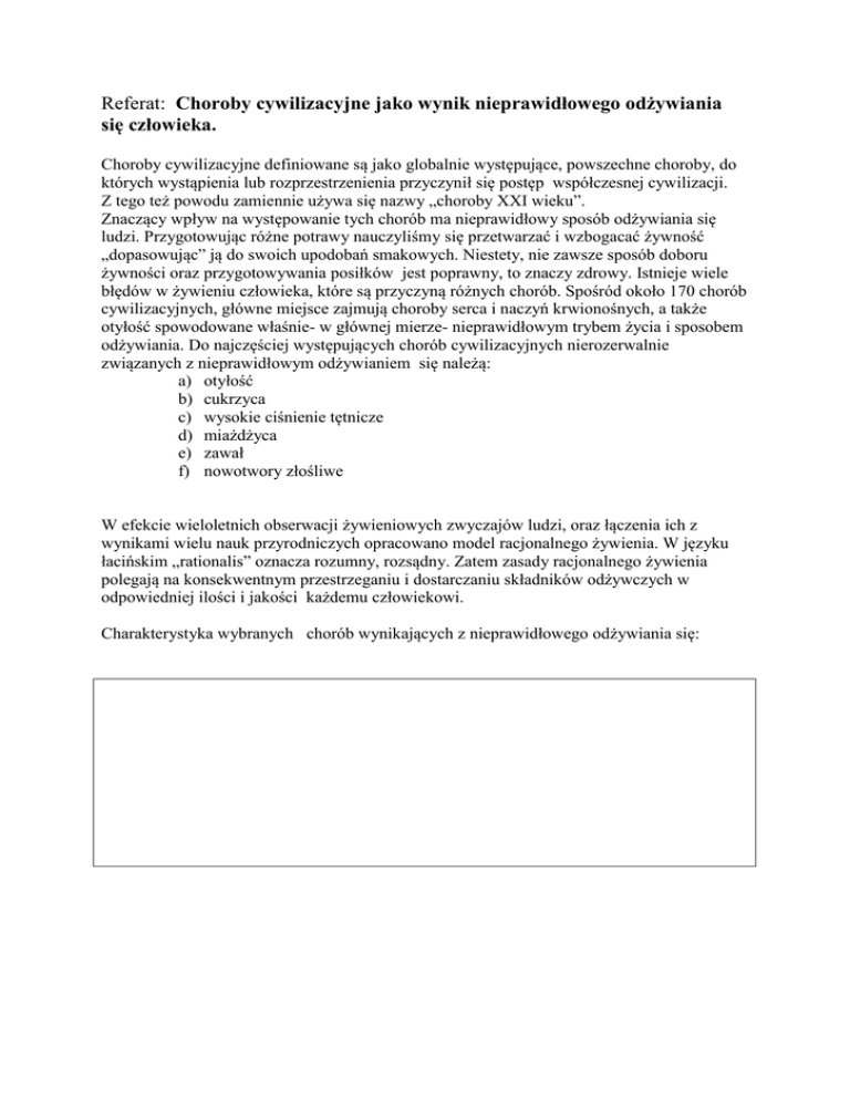 Referat: Choroby cywilizacyjne jako wynik nieprawidłowego odżywiania się człowieka. Choroby cywilizacyjne definiowane są jako globalnie występujące, powszechne choroby, do których wystąpienia lub rozprzestrzenienia przyczynił się postęp współczesnej cywilizacji. Z tego też powodu zamiennie używa się nazwy „choroby XXI wieku”. Znaczący wpływ na występowanie tych chorób ma nieprawidłowy sposób odżywiania się ludzi. Przygotowując różne potrawy nauczyliśmy się przetwarzać i wzbogacać żywność „dopasowując” ją do swoich upodobań smakowych. Niestety, nie zawsze sposób doboru żywności oraz przygotowywania posiłków jest poprawny, to znaczy zdrowy. Istnieje wiele błędów w żywieniu człowieka, które są przyczyną różnych chorób. Spośród około 170 chorób cywilizacyjnych, główne miejsce zajmują choroby serca i naczyń krwionośnych, a także otyłość spowodowane właśnie- w głównej mierze- nieprawidłowym trybem życia i sposobem odżywiania. Do najczęściej występujących chorób cywilizacyjnych nierozerwalnie związanych z nieprawidłowym odżywianiem się należą: a) otyłość b) cukrzyca c) wysokie ciśnienie tętnicze d) miażdżyca e) zawał f) nowotwory złośliwe W efekcie wieloletnich obserwacji żywieniowych zwyczajów ludzi, oraz łączenia ich z wynikami wielu nauk przyrodniczych opracowano model racjonalnego żywienia. W języku łacińskim „rationalis” oznacza rozumny, rozsądny. Zatem zasady racjonalnego żywienia polegają na konsekwentnym przestrzeganiu i dostarczaniu składników odżywczych w odpowiedniej ilości i jakości każdemu człowiekowi. Charakterystyka wybranych chorób wynikających z nieprawidłowego odżywiania się: Otyłość Termin kliniczny określający 15% nadwagę lub ciężar ciała przekraczający niezależny ciężar ciała. Otyłość związana jest ze zwiększoną zawartością tkanki tłuszczowej. Diabetes mellitus- cukrzyca. Choroba wynikająca z niedoboru insuliny, w której dochodzi do głębokich zaburzeń przemiany węglowodanów, tłuszczów i białek. Insulina wytwarzana jest przez trzustkę, gruczoł znajdujący się za żołądkiem. Insulina reguluje poziom cukru we krwi jak i zużytkowanie glukozy w tkankach. Jej niedobór prowadzi do wzrostu poziomu cukru we krwi oraz do pojawienia się cukru w moczu. Uważa się, że do wystąpienia cukrzycy przyczynia się zarówno czynnik genetyczny jak i środowiskowy. Jednym z głównych czynników środowiskowych jest otyłość. Ryzyko zachorowania na cukrzycę wzrasta ośmiokrotnie przy nadwadze rzędu 25%. Są dwa rodzaje cukrzycy: cukrzyca insulinozależna i cukrzyca prosta. Cukrzyca insulinozależna często spotykana jest u dzieci i młodzieży. Jest leczona za pomocą insuliny i diety. Cukrzyca prosta spotykana jest u ludzi dorosłych. Leczona jest dieta i lekami doustnymi. Główna różnica polega na tym, że trzustka osoby cierpiącej na insulinozależną cukrzycę nie wytwarza prawie wcale insuliny. U osób z cukrzycą prosta jest „rozleniwiona” i produkuje zbyt mało insuliny, zdarza się również, że wyprodukowana insulina nie jest skutecznie spożytkowana przez nasz organizm. Pompa insulinowa Miażdżyca naczyń Jest to stwardnienie ścianek tętnic i ma miejsce wtedy, gdy pewna ilość substancji tłuszczowych, które normalnie krążą w naszym ustroju, jest wtłoczona w ścianki tętnic. Płytki miażdżycowe, zbudowane z substancji tłuszczowych, osadzają się na ściankach naczyń, tak jak rdza osadza się na ściankach metalowej rury. Tłuszcze pochodzenia zwierzęcego zawierają nasycone kwasy tłuszczowe i szczególnie przyczyniają się do tworzenia tych płytek. Nadciśnienie tętnicze Ciśnienie krwi to siła z jaką krew płynąca w tętnicach oddziałuje na ścianki naczyń. Wyrzucona skurczem serca krew (około 60-70 uderzeń na minutę) płynie tętnicami. Tętnice oddalając się od serca stają się coraz węższe, przechodzą w drobne naczynia , zwane naczyniami włosowatymi. Docierają do wszystkich komórek ciała. Krew wraca do serca żyłami. Jeżeli naczynia włosowate SA obkurczone lub zwężone, w tętnicach wzrasta ciśnienie płynu na ścianki. Zwężenie lub skurcz naczyń powoduje wzrost ciśnienia krwi na ścianki. Ciśnienie krwi wzrasta w chwilach zdenerwowania, emocji, wzmożonego wysiłku fizycznego; obniża się w czasie snu, odpoczynku. Ciśnienie tętnicze krwi mierzymy za pomocą ciśnieniomierza. Zmienia się w zależności od wieku. Prawidłowe ciśnienie u osób dorosłych waha się od 100/60 mmHg do 135/80 mmHg, dla dziecka w wieku 11-18 lat około 100/75 mmHg Miażdżyca naczyń Jest to stwardnienie ścianek tętnic i ma miejsce wtedy, gdy pewna ilość substancji tłuszczowych, które normalnie krążą w naszym ustroju, jest wtłoczona w ścianki tętnic. Płytki miażdżycowe, zbudowane z substancji tłuszczowych, osadzają się na ściankach naczyń, tak jak rdza osadza się na ściankach metalowej rury. Tłuszcze pochodzenia zwierzęcego zawierają nasycone kwasy tłuszczowe i szczególnie przyczyniają się do tworzenia tych płytek ciśnieniomierz . Zawał serca Jeśli tętnice unaczyniające serce zostają zamknięte przez nawarstwiające się złogi tłuszczowe, pewne fragmenty serca zostają nieukrwione, bo nie płynie do nich krew. Te części serca ulegną martwicy. Mówimy wówczas o zawale serca. Zmniejszenie spożycia tłuszczów zwierzęcych może zapobiec tworzeniu się złogów tłuszczowych w tętnicach. Nowotwory złośliwe Powstają na skutek zaburzenia prawidłowej reprodukcji komórek. Komórki nowotworowe są zniekształcone i niezdolne do wykonywania swych prawidłowych funkcji. Jest wiele rodzajów nowotworów. Naukowcy wykazują prawdopodobieństwo występowania związku między zachorowalnością na raka a nieprawidłowymi nawykami żywieniowymi. Duża ilość tłuszczu i mała ilość błonnika w diecie powoduje wzrost ryzyka zachorowań
