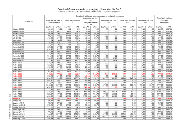 Cennik telefonów w ofercie promocyjnej „Nowa Idea dla Firm” Obowiązuje od 1.04.2005 r. do odwołania. Oferta ważna do wyczerpania zapasów. OP500/M_010405/Z2_1 strona 1 z 2 Typ telefonu Alcatel OT320 Alcatel OT332 Alcatel OT556 Alcatel OT735 LG C1100 Motorola C115 Motorola C200 Motorola C205 Motorola C350 Motorola C385 Motorola C550 Motorola E365 Motorola V220 Motorola V500 Motorola V547 Nokia 1100 Nokia 2600 Nokia 3100 Nokia 3410 Nokia 3510i Nokia 6020 Nokia 6100 Nokia 6230 Nokia 6310i Nokia 6510 Nokia 6600 Nokia 6610i Nokia 6610 Nokia 6820 Nokia 7250i Nokia 7650 Philips 162 Philips 355 Sagem MYX-1 Sagem MYX5-2 Sagem MYX-5m Samsung C100 Samsung C110 Samsung D410 Samsung E700 Samsung X450 Nowy Mix dla Firm 8 i bezterminalowe bez VAT 163,11 294,26 490,98 695,90 490,98 212,29 228,69 163,11 327,05 490,98 572,95 736,88 704,10 736,88 777,87 248,08 327,05 490,98 245,08 302,46 818,85 572,95 1638,52 695,90 531,97 2048,36 654,92 777,87 1228,69 1228,69 1638,52 245,08 490,99 195,90 572,95 327,05 490,98 490,98 1966,39 1638,52 490,98 z VAT 198,99 359,00 599,00 849,00 599,00 258,99 279,00 198,99 399,00 599,00 699,00 898,99 859,00 898,99 949,00 299,00 399,00 599,00 299,00 369,00 999,00 699,00 1998,99 849,00 649,00 2499,00 799,00 949,00 1499,00 1499,00 1998,99 299,00 599,00 239,00 699,00 399,00 599,00 599,00 2399,00 1998,99 599,00 Cena (w zł) telefonu w ofercie promocyjnej w planach taryfowych Nowa Idea dla Firm Nowa Idea dla Firm 50, Nowa Idea dla Firm Nowa Idea dla Firm Nowy Mix dla Firm 25 100 200 30 bez VAT z VAT bez VAT z VAT bez VAT z VAT bez VAT z VAT 1,00 1,22 1,00 1,22 1,00 1,22 1,00 1,22 49,00 59,78 1,00 1,22 1,00 1,22 1,00 1,22 349,00 425,78 49,00 59,78 1,00 1,22 1,00 1,22 399,00 486,78 149,00 181,78 1,00 1,22 1,00 1,22 299,00 364,78 49,00 59,78 1,00 1,22 1,00 1,22 29,00 35,38 1,00 1,22 1,00 1,22 1,00 1,22 1,00 1,22 1,00 1,22 1,00 1,22 1,00 1,22 1,00 1,22 1,00 1,22 1,00 1,22 1,00 1,22 149,00 181,78 1,00 1,22 1,00 1,22 1,00 1,22 199,00 242,78 19,00 23,18 1,00 1,22 1,00 1,22 299,00 364,78 99,00 120,78 1,00 1,22 1,00 1,22 499,00 608,78 299,00 364,78 1,00 1,22 1,00 1,22 499,00 608,78 199,00 242,78 1,00 1,22 1,00 1,22 549,00 669,78 349,00 425,78 49,00 59,78 1,00 1,22 599,00 730,78 399,00 486,78 99,00 120,78 1,00 1,22 99,00 120,78 1,00 1,22 1,00 1,22 1,00 1,22 199,00 242,78 1,00 1,22 1,00 1,22 1,00 1,22 249,00 303,78 29,00 35,38 1,00 1,22 1,00 1,22 69,00 84,18 1,00 1,22 1,00 1,22 1,00 1,22 99,00 120,78 19,00 23,18 1,00 1,22 1,00 1,22 699 852,78 449 547,78 199 242,78 1,00 1,22 399,00 486,78 49,00 59,78 1,00 1,22 1,00 1,22 1399,00 1706,78 999,00 1218,78 549,00 669,78 199,00 242,78 399,00 486,78 199,00 242,78 1,00 1,22 1,00 1,22 149,00 181,78 19,00 23,18 1,00 1,22 1,00 1,22 1299,00 1584,78 999,00 1218,78 699,00 852,78 249,00 303,78 499,00 608,78 149,00 181,78 1,00 1,22 1,00 1,22 399,00 486,78 199,00 242,78 1,00 1,22 1,00 1,22 899,00 1096,78 699,00 852,78 399,00 486,78 49,00 59,78 1099,00 1340,78 799,00 974,78 499,00 608,78 49,00 59,78 1499,00 1828,78 1199,00 1462,78 699,00 852,78 99,00 120,78 69,00 84,18 1,00 1,22 1,00 1,22 1,00 1,22 299,00 364,78 49,00 59,78 1,00 1,22 1,00 1,22 1,00 1,22 1,00 1,22 1,00 1,22 1,00 1,22 399,00 486,78 99,00 120,78 1,00 1,22 1,00 1,22 49,00 59,78 1,00 1,22 1,00 1,22 1,00 1,22 199,00 242,78 1,00 1,22 1,00 1,22 1,00 1,22 199,00 242,78 1,00 1,22 1,00 1,22 1,00 1,22 1399,00 1706,78 1099,00 1340,78 699,00 852,78 399,00 486,78 1099,00 1340,78 899,00 1096,78 649,00 791,78 149,00 181,78 299,00 364,78 1,00 1,22 1,00 1,22 1,00 1,22 Nowa Idea dla Firm 400 Cena (w zł) telefonu poza ofertą promocyjną bez VAT 1,00 1,00 1,00 1,00 1,00 1,00 1,00 1,00 1,00 1,00 1,00 1,00 1,00 1,00 1,00 1,00 1,00 1,00 1,00 1,00 1,00 1,00 19,00 1,00 1,00 99,00 1,00 1,00 1,00 1,00 1,00 1,00 1,00 1,00 1,00 1,00 1,00 1,00 1,00 1,00 1,00 bez VAT 850,00 850,00 1099,00 1199,00 1099,00 850,00 850,00 850,00 900,00 1099,00 1099,00 1299,00 1599,00 1599,00 1599,00 850,00 999,00 1199,00 850,00 850,00 1799,00 1499,00 2299,00 1599,00 1100,00 2999,00 1599,00 1499,00 2199,00 2299,00 2999,00 850,00 1199,00 850,00 1199,00 850,00 1099,00 1099,00 2999,00 2299,00 1299,00 z VAT 1,22 1,22 1,22 1,22 1,22 1,22 1,22 1,22 1,22 1,22 1,22 1,22 1,22 1,22 1,22 1,22 1,22 1,22 1,22 1,22 1,22 1,22 23,18 1,22 1,22 120,78 1,22 1,22 1,22 1,22 1,22 1,22 1,22 1,22 1,22 1,22 1,22 1,22 1,22 1,22 1,22 z VAT 1037,00 1037,00 1340,78 1462,78 1340,78 1037,00 1037,00 1037,00 1098,00 1340,78 1340,78 1584,78 1950,78 1950,78 1950,78 1037,00 1218,78 1462,78 1037,00 1037,00 2194,78 1828,78 2804,78 1950,78 1342,00 3658,78 1950,78 1828,78 2682,78 2804,78 3658,78 1037,00 1462,78 1037,00 1462,78 1037,00 1340,78 1340,78 3658,78 2804,78 1584,78 OP500/M_010405/Z2_1 strona 2 z 2 Samsung X600 Siemens A51 Siemens A52 Siemens A55 Siemens A65 Siemens C60 Siemens C65 Siemens CX65 Siemens S55 + aparat cyfrowy Siemens S65 Siemens SX1 Sony Ericsson K300i Sony Ericsson K700i Sony Ericsson P800 Sony Ericsson P900 Sony Ericsson T68i Sony Ericsson T68i + Bluetooth Sony Ericsson T105 Sony Ericsson T230 Sony Ericsson T230+ aparat cyfrowy Sony Ericsson T290i Sony Ericsson T610 Sony Ericsson T610 + zestaw samochodowy Sony Ericsson T630 982,79 163,11 245,08 245,08 286,06 327,05 531,97 572,95 695,90 1064,75 2048,36 327,05 1064,75 2704,10 2950,00 490,98 654,92 269,67 318,85 474,59 327,05 654,92 1199,00 198,99 299,00 299,00 348,99 399,00 649,00 699,00 849,00 1299,00 2499,00 399,00 1299,00 3299,00 3599,00 599,00 799,00 329,00 389,00 579,00 399,00 799,00 699,00 1,00 29,00 19,00 149,00 149,00 349,00 449,00 399,00 799,00 1599,00 99,00 799,00 1799,00 2199,00 299,00 499,00 49,00 69,00 199,00 99,00 449,00 852,78 1,22 35,38 23,18 181,78 181,78 425,78 547,78 486,78 974,78 1950,78 120,78 974,78 2194,78 2682,78 364,78 608,78 59,78 84,18 242,78 120,78 547,78 549,00 1,00 1,00 1,00 1,00 1,00 1,00 99,00 199,00 599,00 1299,00 1,00 599,00 1599,00 1999,00 149,00 299,00 1,00 1,00 49,00 1,00 199,00 669,78 1,22 1,22 1,22 1,22 1,22 1,22 120,78 242,78 730,78 1584,78 1,22 730,78 1950,78 2438,78 181