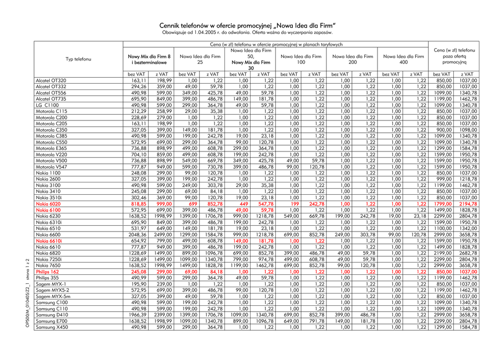 Cennik telefonów w ofercie promocyjnej „Nowa Idea dla Firm”
