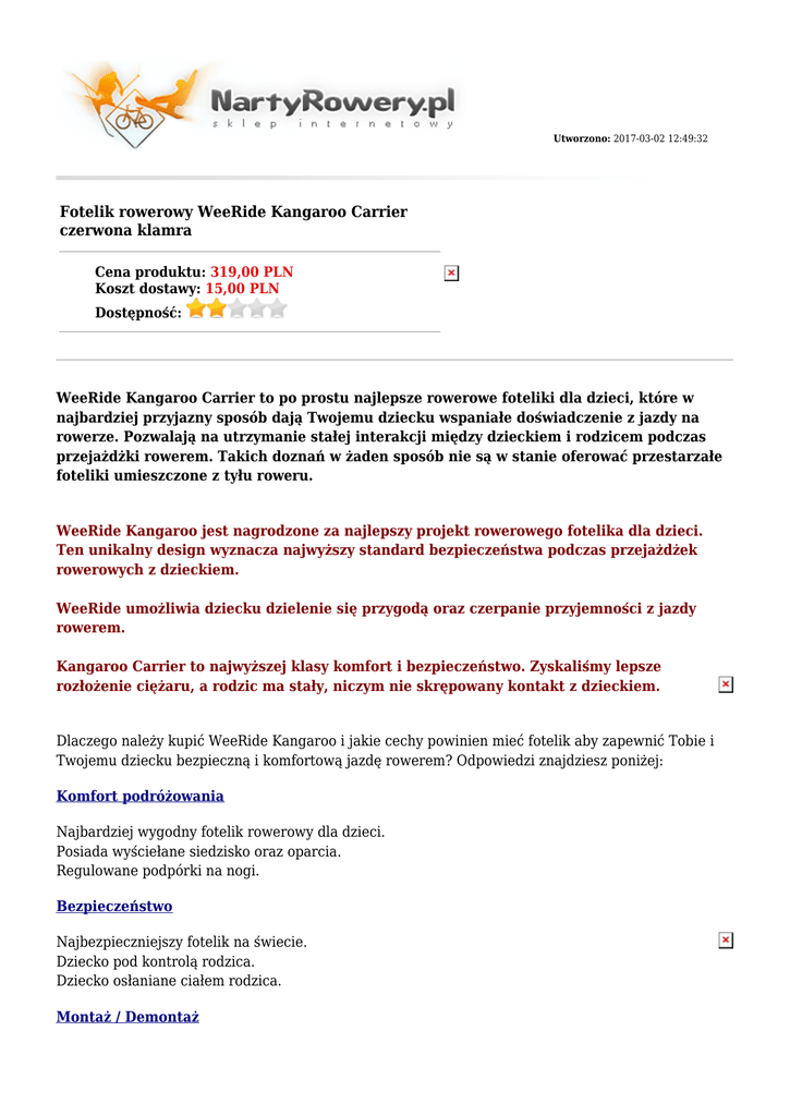 Utworzono: 2017-03-02 12:49:32 Fotelik rowerowy WeeRide Kangaroo Carrier czerwona klamra Cena produktu: 319,00 PLN Koszt dostawy: 15,00 PLN Dostępność: WeeRide Kangaroo Carrier to po prostu najlepsze rowerowe foteliki dla dzieci, które w najbardziej przyjazny sposób dają Twojemu dziecku wspaniałe doświadczenie z jazdy na rowerze. Pozwalają na utrzymanie stałej interakcji między dzieckiem i rodzicem podczas przejażdżki rowerem. Takich doznań w żaden sposób nie są w stanie oferować przestarzałe foteliki umieszczone z tyłu roweru. WeeRide Kangaroo jest nagrodzone za najlepszy projekt rowerowego fotelika dla dzieci. Ten unikalny design wyznacza najwyższy standard bezpieczeństwa podczas przejażdżek rowerowych z dzieckiem. WeeRide umożliwia dziecku dzielenie się przygodą oraz czerpanie przyjemności z jazdy rowerem. Kangaroo Carrier to najwyższej klasy komfort i bezpieczeństwo. Zyskaliśmy lepsze rozłożenie ciężaru, a rodzic ma stały, niczym nie skrępowany kontakt z dzieckiem. Dlaczego należy kupić WeeRide Kangaroo i jakie cechy powinien mieć fotelik aby zapewnić Tobie i Twojemu dziecku bezpieczną i komfortową jazdę rowerem? Odpowiedzi znajdziesz poniżej: Komfort podróżowania Najbardziej wygodny fotelik rowerowy dla dzieci. Posiada wyściełane siedzisko oraz oparcia. Regulowane podpórki na nogi. Bezpieczeństwo Najbezpieczniejszy fotelik na świecie. Dziecko pod kontrolą rodzica. Dziecko osłaniane ciałem rodzica. Montaż / Demontaż Łatwy w użyciu. Prosty i szybki sposób zakładania i zdejmowania fotelika z ramy. Balans Środek ciężkości we właściwym miejscu, pośrodku roweru. Pełna kontrola nad prowadzeniem roweru. Widoczność dziecka Pełna, niczym nieograniczona widoczność otoczenia. Świetna zabawa dla dziecka i rodziców. Kończyny dziecka Dziecko trzyma rączki na przednim oparciu. Nogi dziecka zabezpieczone podpórkami. Drzemka dziecka Podczas jazdy dziecko może się zdrzemnąć w naturalnej pozycji. To dzięki specjalnej podpórce, na której umieszczona jest miękka poduszka. Kontrola dziecka Dziecko umieszczone z przodu, przed rodzicem jest zawsze pod kontrolą. Komunikacja Dzięki WeeRide Kangaroo komunikacja między dzieckiem i rodzicem jest niczym nieskrępowana. Przewożenie rowerów Dzięki prostemu systemowi odpinania fotelika, można szybko go zdjąć i bez problemu przewieźć rower samochodem. Jazda rowerem bez dziecka Specjalny system szybkiego montażu pozwala zdjąć fotelik z roweru w ciągu sekundy. Opis produktu Dzięki zastosowaniu specjalnej konstrukcji fotelika pasuje od do każdego roweru! Nie ma tu znaczenia czy jest to rower damski czy męski, szosowy, crossowy, górski, turystyczny czy miejski, do każdego pasuje! Jest to możliwe poprzez zastosowanie innowacyjnego rozwiązania i umieszczenia fotelika na specjalnie zaprojektowanym stelażu. Stelaż montuje się tuż nad ramą roweru, z przodu pod główką kierownicy, z tyłu pod siodełkiem. Stelaż można regulować w każdej płaszczyźnie, długość, wysokość zamocowania aby uzyskać prawidłowy poziom. W zestawie są dodatkowe obręcze oraz dwa komplety śrub różnej długości aby dopasować do każdego rozmiaru grubości ramy roweru. Ważne – stelaż nie jest montowany bezpośrednio na ramie roweru, bo wzdłuż ramy biegną linki przerzutek i hamulców! Na metalowym stelażu umieszcza się fotelik za pomocą specjalnej zakrętki. Trwa to kilka sekund, tak więc jeśli rodzic chce pojeździć bez dziecka fotelik może odpiąć bardzo szybko. Fotelik jest odpowiednio zaprojektowany aby utrzymywać wygodną pozycję dziecka oraz nie krępować ruchów rodzica. Dzięki temu jest małych rozmiarów. Fotelik ma 5-punktowe pasy bezpieczeństwa, które dodatkowo są regulowane dla różnego wieku dziecka. Fotelik ma podpórki na nogi, również z regulowaną wysokością. Siedzisko fotelika jest miękko wyściełane, przez co dziecko ma komfort podróżowania. Z przodu fotelika umieszczona jest specjalna innowacyjna podpórka,również wyściełana, dzięki temu dziecko może położyć główkę i się bezpiecznie zdrzemnąć. Podpórka ta też zwykle służy dzieciom do zabawy. Zalety WeeRide Kangaroo: * Najbezpieczniejszy sposób podróżowania z dzieckiem * Dziecko jest widziane przez rodzica przez cały czas jazdy rowerem * Potrzeby dziecka mogą być wysłuchane i zobaczone * Dziecko może aktywnie uczestniczyć w podróży * Dziecko widzi otoczenie, a nie tylko plecy rodzica * Waga dziecka nie osłabia stabilności w prowadzeniu roweru * Fotelik WeeRide nie przenosi środka ciężkości na tył roweru * Lepsza komunikacja między rodzicem i dzieckiem * Bardzo komfortowe i przyjemne doznanie z jazdy dla dzieci * Poprawa balansu ze względu na centralne położenie fotelika * Większe bezpieczeństwo ze względu na otaczające ramiona rodzica * Szybki system zdejmowania fotelika, gdy chcemy jechać samodzielnie * Podpórki na ręce i nogi dziecka * Tył roweru jest wolny do przewozu dodatkowych rzeczy * Dziecko może się zdrzemnąć dzięki podpórce * Niesamowita frajda dla dziecka i rodziców * Przeznaczony dla dzieci do wagi 18kg - wg norm europejskich Porównanie fotelików Fotelik WeeRide Fotelik montowany z tyłu Dziecko pod stałą kontrolą, bo widzimy co robi Dziecko bez kontroli, bo nie widać co się dzieje z tyłu Dziecko bezpieczne między ramionami rodzica Dziecko poza jakąkolwiek kontrolą Dziecko widzi wszystko podczas jazdy Dziecko widzi tylko plecy rodzica Dziecko korzysta z przejażdżki, bierze w niej czynny udział Dziecko jest tylko przewożone, bez żadnych korzyści dla dziecka Dziecko uczy się, gdyż rodzic można z nim rozmawiać omawiając to co widzą podczas jazdy Dziecko nic nie wyniesie z jazdy Swobodna komunikacja rodzica z dzieckiem Brak możliwości rozmowy Niesamowita frajda i zabawa dla dziecka Brak korzyści dla dziecka Łatwość prowadzenia roweru, bo środek ciężkości jest w tym samym miejscu Pr