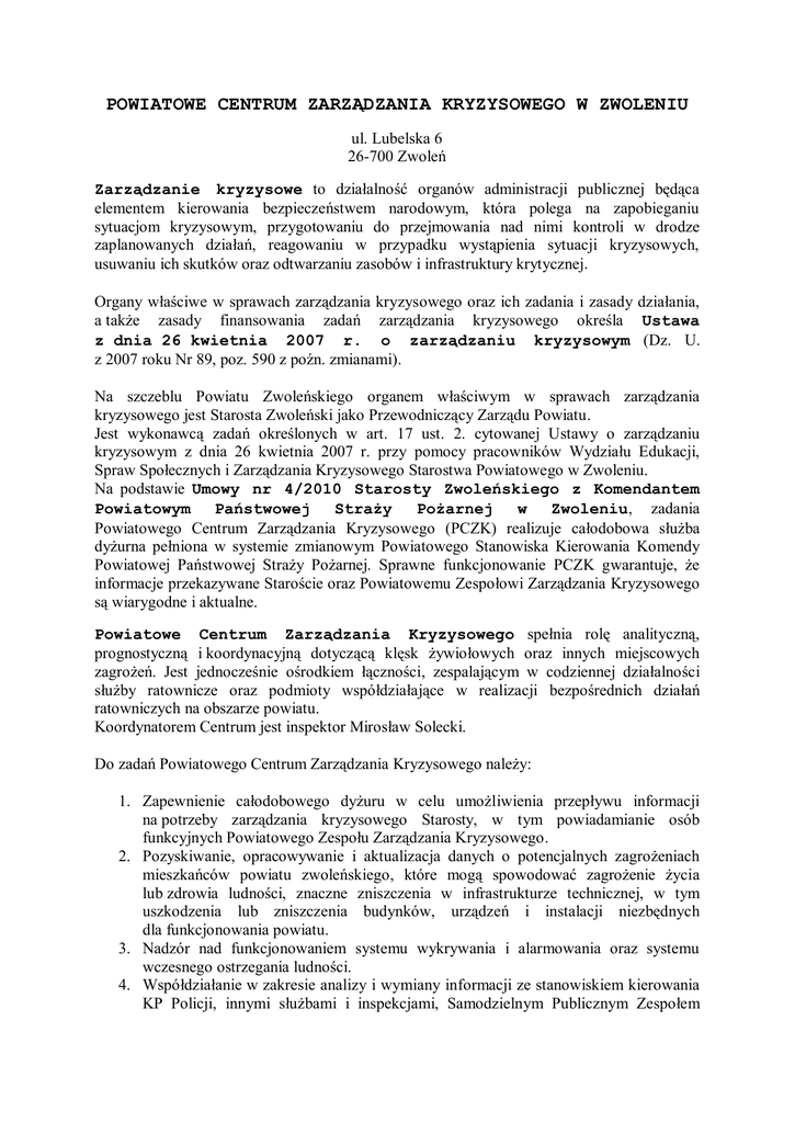 POWIATOWE CENTRUM ZARZĄDZANIA KRYZYSOWEGO W ZWOLENIU ul. Lubelska 6 26-700 Zwoleń Zarządzanie kryzysowe to działalność organów administracji publicznej będąca elementem kierowania bezpieczeństwem narodowym, która polega na zapobieganiu sytuacjom kryzysowym, przygotowaniu do przejmowania nad nimi kontroli w drodze zaplanowanych działań, reagowaniu w przypadku wystąpienia sytuacji kryzysowych, usuwaniu ich skutków oraz odtwarzaniu zasobów i infrastruktury krytycznej. Organy właściwe w sprawach zarządzania kryzysowego oraz ich zadania i zasady działania, a także zasady finansowania zadań zarządzania kryzysowego określa Ustawa z dnia 26 kwietnia 2007 r. o zarządzaniu kryzysowym (Dz. U. z 2007 roku Nr 89, poz. 590 z poźn. zmianami). Na szczeblu Powiatu Zwoleńskiego organem właściwym w sprawach zarządzania kryzysowego jest Starosta Zwoleński jako Przewodniczący Zarządu Powiatu. Jest wykonawcą zadań określonych w art. 17 ust. 2. cytowanej Ustawy o zarządzaniu kryzysowym z dnia 26 kwietnia 2007 r. przy pomocy pracowników Wydziału Edukacji, Spraw Społecznych i Zarządzania Kryzysowego Starostwa Powiatowego w Zwoleniu. Na podstawie Umowy nr 4/2010 Starosty Zwoleńskiego z Komendantem Powiatowym Państwowej Straży Pożarnej w Zwoleniu, zadania Powiatowego Centrum Zarządzania Kryzysowego (PCZK) realizuje całodobowa służba dyżurna pełniona w systemie zmianowym Powiatowego Stanowiska Kierowania Komendy Powiatowej Państwowej Straży Pożarnej. Sprawne funkcjonowanie PCZK gwarantuje, że informacje przekazywane Staroście oraz Powiatowemu Zespołowi Zarządzania Kryzysowego są wiarygodne i aktualne. Powiatowe Centrum Zarządzania Kryzysowego spełnia rolę analityczną, prognostyczną i koordynacyjną dotyczącą klęsk żywiołowych oraz innych miejscowych zagrożeń. Jest jednocześnie ośrodkiem łączności, zespalającym w codziennej działalności służby ratownicze oraz podmioty współdziałające w realizacji bezpośrednich działań ratowniczych na obszarze powiatu. Koordynatorem Centrum jest inspektor Mirosław Solecki. Do zadań Powiatowego Centrum Zarządzania Kryzysowego należy: 1. Zapewnienie całodobowego dyżuru w celu umożliwienia przepływu informacji na potrzeby zarządzania kryzysowego Starosty, w tym powiadamianie osób funkcyjnych Powiatowego Zespołu Zarządzania Kryzysowego. 2. Pozyskiwanie, opracowywanie i aktualizacja danych o potencjalnych zagrożeniach mieszkańców powiatu zwoleńskiego, które mogą spowodować zagrożenie życia lub zdrowia ludności, znaczne zniszczenia w infrastrukturze technicznej, w tym uszkodzenia lub zniszczenia budynków, urządzeń i instalacji niezbędnych dla funkcjonowania powiatu. 3. Nadzór nad funkcjonowaniem systemu wykrywania i alarmowania oraz systemu wczesnego ostrzegania ludności. 4. Współdziałanie w zakresie analizy i wymiany informacji ze stanowiskiem kierowania KP Policji, innymi służbami i inspekcjami, Samodzielnym Publicznym Zespołem 5. 6. 7. 8. 9. Zakładów Opieki Zdrowotnej oraz bieżące informowanie o zdarzeniach Wojewódzkie Centrum Zarządzania Kryzysowego. Gromadzenie, aktualizowanie baz danych i innych narzędzi dla potrzeb Centrum; współdziałanie w tym zakresie z wydziałami Starostwa, administracją samorządową, administracją zespoloną i niezespoloną oraz innymi służbami, inspekcjami i organizacjami pozarządowymi. Po otrzymaniu informacji o wystąpieniu zagrożenia, inicjowanie działań w zakresie zarządzania kryzysowego oraz niezwłoczne przekazanie informacji o zaistniałym zdarzeniu odpowiednim organom wyższego i niższego szczebla, przedstawiając jednocześnie swoją ocenę sytuacji oraz informację o zamierzonych działaniach. W przypadku otrzymania informacji, od jednostek organizacyjnych wchodzących w skład Krajowego Systemu Wykrywania i Alarmowania, o wykryciu zagrożenia skażeniami lub stwierdzenia wystąpienia skażeń przez podległe im systemy, niezwłoczne powiadomienie właściwego terytorialnie dla miejsca takiego zdarzenia organu administracji publicznej, który podejmuje decyzję o wprowadzeniu lub ogłoszeniu sygnału lub komunikatu ostrzegawczego, a także o ich odwołaniu. Wypracowanie i przygotowanie wstępnej analizy powstałego zdarzenia i przedstawienie wniosków do decyzji Starosty. Współdziałanie z organami prowadzącymi akcje ratownicze, poszukiwawcze i humanitarne w zakresie koordynacji działań oraz zapewnienie wzajemnego przepływu informacji poprzez: 1) powiadamianie zgodnie z obowiązującymi algorytmami właściwych organów oraz powiatowych służb, inspekcji, służb komunalnych i technicznych o zaistniałych zdarzeniach wraz z rejestracją i dokumentowaniem danych; 2) przy zdarzeniach śmiertelnych lub o dużym zagrożeniu powiadamianie Starosty oraz przygotowanie komunikatów ostrzegawczych o zagrożeniu i sposobach zachowania się ludności w zaistniałej sytuacji; 3) w sytuacjach nadzwyczajnych, nagłych i nie cierpiących zwłoki, podejmowanie decyzji o uruchomieniu systemu wykrywania i alarmowania oraz systemu wczesnego ostrzegania ludności w uzgodnieniu z Wojewódzkim Centrum Zarządzania Kryzysowego; 4) zbieranie danych o przebiegu akcji, użytych siłach i ich rodzajach, poniesionych stratach i zniszczeniach, kosztach oraz rejestrowanie tych danych. 10. Współpraca z podmiotami realizującymi monitoring środowiska. 11. Współdziałanie oraz wymiana informacji z Wojewódzkim Centrum Zarządzania Kryzysowego, centrami zarządzania kryzysowego sąsiednich powiatów, oraz gminnymi zespołami zarządzania kryzysowego. Katalog zagrożeń występujących lub mogących wystąpić na terenie powiatu zwoleńskiego: 1. Katastrofy naturalne Powodzie (opadowe, roztopowe, zatorowe), rozległe podtopienia Anomalie pogodowe (huragany, trąby powietrzne, burze, śnieżyce, ekstremalne temperatury, zawieje i zamiecie śnieżne, susze) Epidemie (zbiorowe zatrucia układu pokarmowego ) Epizootie (zwiększona iloś