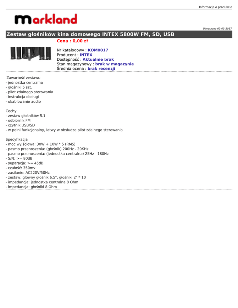 Informacje o produkcie Utworzono 02-03-2017 Zestaw głośników kina domowego INTEX 5800W FM, SD, USB Cena : 0,00 zł Nr katalogowy : KOM0017 Producent : INTEX Dostępność : Aktualnie brak Stan magazynowy : brak w magazynie Średnia ocena : brak recenzji Zawartość zestawu - jednostka centralna - głośniki 5 szt. - pilot zdalnego sterowania - instrukcja obsługi - okablowanie audio Cechy - zestaw głośników 5.1 - odbiornik FM - czytnik USB/SD - w pełni funkcjonalny, łatwy w obsłudze pilot zdalnego sterowania Specyfikacja - moc wyjściowa: 30W + 10W * 5 (RMS) - pasmo przenoszenia: (głośnik) 200Hz - 20KHz - pasmo przenoszenia: (jednostka centralna) 25Hz - 180Hz - S/N: >= 80dB - separacja: >= 45dB - czułość: 350mv - zasilanie: AC220V/50Hz - zestaw: główny głośnik 6.5", głośniki 2" * 10 - impedancja: jednostka centralna 8 Ohm - impedancja: głośniki 8 Ohm