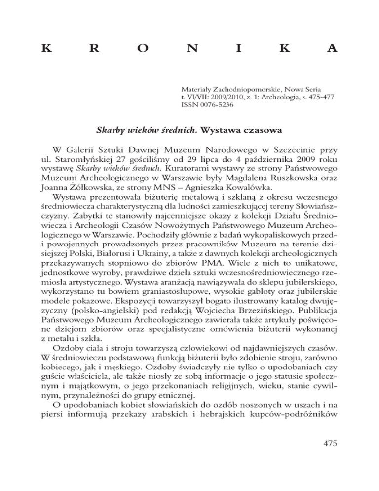 K R O N I K A Materiały Zachodniopomorskie, Nowa Seria t. VI/VII: 2009/2010, z. 1: Archeologia, s. 475-477 ISSN 0076-5236 Skarby wieków średnich. Wystawa czasowa W Galerii Sztuki Dawnej Muzeum Narodowego w Szczecinie przy ul. Staromłyńskiej 27 gościliśmy od 29 lipca do 4 października 2009 roku wystawę Skarby wieków średnich. Kuratorami wystawy ze strony Państwowego Muzeum Archeologicznego w Warszawie były Magdalena Ruszkowska oraz Joanna Żółkowska, ze strony MNS – Agnieszka Kowalówka. Wystawa prezentowała biżuterię metalową i szklaną z okresu wczesnego średniowiecza charakterystyczną dla ludności zamieszkującej tereny Słowiańszczyzny. Zabytki te stanowiły najcenniejsze okazy z kolekcji Działu Średniowiecza i Archeologii Czasów Nowożytnych Państwowego Muzeum Archeologicznego w Warszawie. Pochodziły głównie z badań wykopaliskowych przedi powojennych prowadzonych przez pracowników Muzeum na terenie dzisiejszej Polski, Białorusi i Ukrainy, a także z dawnych kolekcji archeologicznych przekazywanych stopniowo do zbiorów PMA. Wiele z nich to unikatowe, jednostkowe wyroby, prawdziwe dzieła sztuki wczesnośredniowiecznego rzemiosła artystycznego. Wystawa aranżacją nawiązywała do sklepu jubilerskiego, wykorzystano tu bowiem graniastosłupowe, wysokie gabloty oraz jubilerskie modele pokazowe. Ekspozycji towarzyszył bogato ilustrowany katalog dwujęzyczny (polsko-angielski) pod redakcją Wojciecha Brzezińskiego. Publikacja Państwowego Muzeum Archeologicznego zawierała także artykuły poświęcone dziejom zbiorów oraz specjalistyczne omówienia biżuterii wykonanej z metalu i szkła. Ozdoby ciała i stroju towarzyszą człowiekowi od najdawniejszych czasów. W średniowieczu podstawową funkcją biżuterii było zdobienie stroju, zarówno kobiecego, jak i męskiego. Ozdoby świadczyły nie tylko o upodobaniach czy guście właściciela, ale także niosły ze sobą informacje o jego statusie społecznym i majątkowym, o jego przekonaniach religijnych, wieku, stanie cywilnym, przynależności do grupy etnicznej. O upodobaniach kobiet słowiańskich do ozdób noszonych w uszach i na piersi informują przekazy arabskich i hebrajskich kupców-podróżników 475 przemierzających w średniowieczu obszary zachodniej i wschodniej Słowiańszczyzny. Powszechnie spotykaną ozdobą głów Słowianek były kabłączki skroniowe, noszone po obu stronach głowy na skórzanej, wełnianej lub płóciennej opasce. Były one wykonane najczęściej z brązowego, posrebrzanego lub srebrnego drutu wygiętego w otwarty pierścień zakończony esowatym uszkiem (na terenach polskich uszko to niekiedy dodatkowo zdobiono żłobkami). Zdecydowanie najbardziej wyjątkową i urozmaiconą pod względem formy i sposobu ornamentacji ozdobą skroni kobiecej była zausznica, czyli kolczyk-zawieszka mocowana, podobnie jak kabłączki, do opaski lub nakrycia głowy. Najprościej zdobione zausznice miały postać drucianego kabłąka oplecionego filigranem, ale najczęściej nakładano na niego od jednego do kilku paciorków wykonanych różnymi technikami jubilerskimi (paciorki malinowate, ażurowe, cylindryczne, trójkątne, puste, owalne, w kształcie koszyczka, gwiazdy czteroramiennej i inne). Do ozdób szyi noszonych przez ludność słowiańską należały zawieszki i paciorki komponowane w kolie oraz naszyjniki. W koliach łączono często paciory z różnych surowców – kamieni ozdobnych, szkła, bursztynu i metalu. Te ostatnie wykonywano głównie ze srebra, zdecydowanie rzadziej z brązu czy złota. Zawieszki wczesnośredniowieczne to m.in. lunule (zawieszki w kształcie półksiężyca o rogach skierowanych ku dołowi), krzyże (w tym enkolpiony – równoramienne krzyże, ukształtowane z podwójnej blachy, puste w środku i szczelnie zamknięte, z wyobrażeniem Chrystusa na przedniej stronie), kaptorgi (kapsułkowate zawieszki w kształcie prostokąta lub trapezu) oraz zawieszki dzwoneczkowate czy okrągłe. Naszyjniki i łańcuchy noszono bez względu na płeć. Sporządzano je poprzez uformowanie obręczy (z reguły o średnicy od 10 do 17 cm) z kilku par skręconych drutów lub zginanie w pół ogniwek ósemkowatych. Kolejną kategorię wyrobów jubilerskich doby wczesnego średniowiecza stanowiły ozdoby ręki, w tym pierścionki i bransolety, które noszone były przez Słowian, podobnie jak naszyjniki czy łańcuchy, niezależnie od płci i wieku. Sporządzane najczęściej z brązu lub srebra, kształtowane były na kilka sposobów z taśm lub drutów (np. ażurowy splot uzupełniany skręconym filigranem). Czasami pierścionek posiadał także półkoliste oczko ze szkła lub kamieni ozdobnych. Z kolei bransolety to najczęściej obręcze wite z drutów srebrnych czy brązowych lub formy taśmowate o niepołączonych końcach wykonane zazwyczaj z brązu. Powierzchnie tych bransolet ornamentowano rytymi liniami prostymi i zygzakowatymi, wybijanymi kółkami, żłobkami, łuczkami lub kratkami. Odmienną grupą biżuterii były zapinki i sprzączki do pasa, które pełniły funkcje nie tylko ozdobne, lecz także utylitarne. Zapinki przeznaczone do 476 spinania odzieży były najczęściej dość masywne, odlewane z brązu. Sprzączki do pasa, nieodłączny element stroju męskiego, przybierały rozmaite formy – od jednoczęściowych prostych, nieornamentowanych, do podwójnych, bogato zdobionych (sprzączki lirowate zdobione na kabłąku poprzecznymi i podłużnymi żłobkami lub motywami geometrycznymi uzupełnianymi emalią). Agnieszka Kowalówka 477