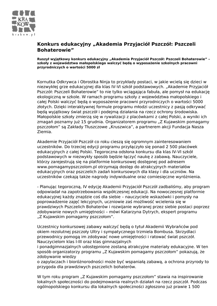 Konkurs edukacyjny „Akademia Przyjaciół Pszczół: Pszczeli Bohaterowie” Ruszył wyjątkowy konkurs edukacyjny „Akademia Przyjaciół Pszczół: Pszczeli Bohaterowie” – szkoły z województwa małopolskiego walczyć będą o wyposażenie szkolnych pracowni przyrodniczych o wartości 5000 zł Kornutka Odkrywca i Obrostka Ninja to przykłady postaci, w jakie wcielą się dzieci w niezwykłej grze edukacyjnej dla klas IV-VI szkół podstawowych. „Akademie Przyjaciół Pszczół: Pszczeli Bohaterowie” to nie tylko wciągająca fabuła, ale pomysł na edukację ekologiczną w szkole. W ramach programu szkoły z województwa małopolskiego i całej Polski walczyć będą o wyposażenie pracowni przyrodniczych o wartości 5000 złotych. Dzięki interaktywnej formule programu młodzi uczestnicy z pasją odkrywać będą wyjątkowy świat pszczół i podejmą działania na rzecz ochrony środowiska. Małopolskie szkoły zmierzą się w rywalizacji z placówkami z całej Polski, a wyniki ich zmagań poznamy już 15 grudnia. Organizatorem programu „Z Kujawskim pomagamy pszczołom” są Zakłady Tłuszczowe „Kruszwica”, a partnerem akcji Fundacja Nasza Ziemia. Akademie Przyjaciół Pszczół co roku cieszą się ogromnym zainteresowaniem uczestników. Do trzeciej edycji programu przyłączyło się ponad 2 500 placówek edukacyjnych z całej Polski. Tegoroczna odsłona konkursu dla klas IV-VI szkół podstawowych w niezwykły sposób będzie łączyć naukę z zabawą. Nauczyciele, którzy zarejestrują się na platformie konkursowej dostępnej pod adresem www.pomagamypszczolom.pl otrzymają dostęp do atrakcyjnych materiałów edukacyjnych oraz pszczelich zadań konkursowych dla klasy i dla uczniów. Na uczestników czekają także nagrody indywidualne oraz comiesięczne wyróżnienia. - Planując tegoroczną, IV edycję Akademii Przyjaciół Pszczół zadbaliśmy, aby program odpowiadał na zapotrzebowania współczesnej edukacji. Na nowoczesnej platformie edukacyjnej każdy znajdzie coś dla siebie – nauczyciele wskazówki i pomysły na poprowadzenie zajęć lekcyjnych, uczniowie zaś możliwość wcielenia się w prawdziwych Pszczelich Bohaterów i rozwijanie wybranej przez siebie postaci poprzez zdobywanie nowych umiejętności – mówi Katarzyna Dytrych, ekspert programu „Z Kujawskim pomagamy pszczołom”. Uczestnicy konkursowej zabawy walczyć będą o tytuł Akademii Wybrańców pod okiem rezolutnej pszczoły Ultry i sympatycznego trzmiela Bombusa. Skrzydlaci przewodnicy pomogą im zdobywać nowe umiejętności i ratować świat pszczół. Nauczycielom klas I-III oraz klas gimnazjalnych i ponadgimnazjalnych udostępnione zostaną atrakcyjne materiały edukacyjne. W ten sposób organizatorzy programu „Z Kujawskim pomagamy pszczołom” pokazują, że zdobywanie wiedzy o zapylaczach i bioróżnorodności może być wspaniałą zabawą, a ochrona przyrody to przygoda dla prawdziwych pszczelich bohaterów. W tym roku program „Z Kujawskim pomagamy pszczołom” stawia na inspirowanie lokalnych społeczności do podejmowania realnych działań na rzecz pszczół. Podczas ogólnopolskiego konkursu dla lokalnych społeczności zgłoszono już prawie 1 500 Miejsc Przyjaznych Pszczołom w całej Polsce. Osoby, które chcą jeszcze przyłączyć się do akcji, mogą do 30 września zgłaszać założone przez siebie Miejsca Przyjazne Pszczołom na stronie internetowej: www.konkurs.pomagamypszczolom.pl. Jesienią zwycięskie gminy odwiedzi mobilna, interaktywna wystawa edukacyjna o pszczołach. Więcej informacji o programie można znaleźć na stronie internetowej www.pomagamypszczolom.pl oraz na fanpage’ u akcji na Facebooku Z Kujawskim Pomagamy Pszczołom. Kontakt dla mediów Małgorzata Strzelec Junior Brand Manager, ZT „Kruszwica” S.A Tel. 22 335 67 27, e-mail: [email protected] Marianna Dworakowska Garden of Words, tel. 22 829 85 72 w. 44, e-mail: [email protected] Powered by TCPDF (www.tcpdf.org)