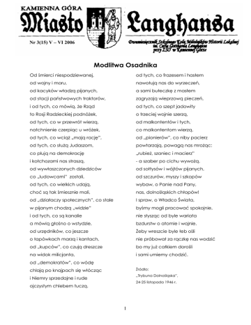 Nr 3(15) V – VI 2006 Modlitwa Osadnika Od śmierci niespodziewanej, od tych, co frazesem i hasłem od wojny i moru, nawołują nas do wyrzeczeń, od kacyków władzą pijanych, a sami bułeczkę z masłem od stacji państwowych traktorów, zagryzają wieprzową pieczeń, i od tych, co mówią, Ŝe Rząd od tych, co szept jadowity to Rosji Radzieckiej podnóŜek, o trzeciej wojnie szerzą, od tych, co w przewrót wierzą, od malkontentów i tych, natchnienie czerpiąc u wróŜek, co malkontentom wierzą, od tych, co wciąŜ „mają rację”, od „pionierów”, co niby pacierz od tych, co słuŜą Judaszom, powtarzają, powagą nas mroŜąc: co plują na demokrację „rubieŜ, szaniec i macierz” i kołchozami nas straszą, - a szaber po cichu wywoŜą, od wywłaszczonych dziedziców od sołtysów i wójtów pijanych, co „ludowcami” zostali, od szczurów, myszy i szkopów od tych, co wielkich udają, wybaw, o Panie nad Pany, choć są tak śmiesznie mali, nas, dolnośląskich chłopów! od „działaczy społecznych”, co stale I spraw, o Władco Świata, w pijanym chodzą „widzie” byśmy mogli pracować spokojnie, i od tych, co są kanalie nie słysząc od byle wariata a mówią głośno o wstydzie, bzdurstw o atomie i wojnie. od urzędników, co jeszcze śeby wreszcie byle łeb ośli o łapówkach marzą i kantach, nie próbował za rączkę nas wodzić od „kupców”, co czują dreszcze bo my juŜ całkiem dorośli na widok milicjanta, i sami umiemy chodzić. od „demokratów”, co wódę Źródło: chlają po knajpach się włócząc „Trybuna Dolnośląska”, i Niemry sprzedajne i rude 24-25 listopada 1946 r. ojczystym chlebem tuczą, 1 Wspomnienia pionierów Kamiennej Góry z lat 1945-1946 Augustyn Sz., ur. 06.06.1922 r. w Jaworznie. „W okresie II wojny światowej przebywałem w okolicy Kamiennej Góry [do 1945 r. Landeshut - red.]. Przywieźli mnie tutaj Niemcy na roboty przymusowe. Pracowałem u jednego gospodarza - Niemca. Po zakończeniu wojny pozostałem na tym terenie. 18 maja 1945 r. postanowiłem wyruszyć w rodzinne strony. Przyjechałem do Kamiennej Góry, aby pociągiem udać się w dalszą drogę. Chodząc po ulicach miasta zauwaŜyłem męŜczyznę, który miał na sobie polski mundur, a na ręce biało-czerwoną opaskę z napisem MO. Pełnił on słuŜbę przy budynku, gdzie obecnie znajduje się Urząd Gminy [ul. Wojska Polskiego - red.]. PoniewaŜ nie wiedziałem wtedy jeszcze co oznacza skrót MO, zapytałem tego człowieka kim on jest i co oznacza ten napis na opasce. Odpowiedział mi, Ŝe jest milicjantem. Potem jeszcze dodał, Ŝe obecna milicja to przedwojenna policja. Teraz dopiero wszystko zrozumiałem. Następnie spytałem, ilu jest milicjantów na terenie całego powiatu. Otrzymałem odpowiedź, Ŝe 10. Gdy to usłyszałem, to stwierdziłem, Ŝe powiat jest duŜy, cała masa Niemców, a milicjantów jest mało i... postanowiłem wstąpić w szeregi MO. Oczywiście do rodzinnych stron juŜ nie pojechałem. Pozostałem w Kamiennej Górze. Takie to były czasy. W milicji pracowałem od 19 maja 1945 r. do 1948 r. Z powodu choroby Ŝony wystąpiłem z szeregów MO i postanowiłem wyjechać. Ale... pozostałem. Podjąłem pracę w zakładach odzieŜy [ZPO „Intermoda” obecnie „Kamodex” - red.], a następnie w fabryce obuwia [DZPS „Odra” - obecnie zlikwidowana - red.], aŜ do przejścia na emeryturę. Zaraz po wyzwoleniu Kamiennej Góry było bardzo mało Polaków, a bardzo duŜo ludności niemieckiej. W mieście nie było jeszcze Wojska Polskiego, tylko oddziały Armii Czerwonej. Przez 2 lata słuŜyłem w plutonie operacyjnym MO. Roboty mieliśmy mnóstwo. Wszędzie włóczyły się niedobitki z formacji SS i Wehrmachtu. Naszym zadaniem było likwidowanie tych włóczęgów. Bardzo niebezpiecznie było wtedy poruszać się po drogach w nocy, czy teŜ po lasach. Zapamiętałem, Ŝe na pograniczu powiatów kamiennogórskiego i jeleniogórskiego wykryliśmy członka niemieckiej organizacji podziemnej „Wehrwolf” (wilkołak), który miał za zadanie zorganizowanie na terenie naszego powiatu niemieckiej partyzantki do walki z władzą ludową, przeprowadzenia akcji propagandowych, dywersyjnych i sabotaŜowych. Nie udało się mu zbiec, poniewaŜ po wykryciu został przez nas ujęty i odwieziony do Komendy Wojewódzkiej MO we Wrocławiu. Tam teŜ otrzymaliśmy trochę broni, bo na samym początku i tego brakowało w MO. Mundury przerabialiśmy z niemieckich, bo były podobne do naszych. CięŜkie to były czasy. Wszystkiego brakowało, ale z czasem sytuacja zaczęła się polepszać. Zaraz po wojnie zaczęli napływać do Kamiennej Góry Polacy z Centralnej Polski. W zakładach pracowali jeszcze Niemcy. Polacy otrzymywali mieszkania i skierowania do pracy, której nie brakowało. Nie wszystkie zakłady zaraz po wojnie rozpoczęły produkcję. Na przykład zakład odzieŜowy na samym początku nic nie wytwarzał, bo był przestawiony przez Niemców na produkcję dla wojska. Podobnie było w ZPL "Len" i DFMW "Dofama". W "Lnie" produkowano kadłuby, a w "Dofamie" silniki do samolotów i stąd były wywoŜone samochodami do Jeleniej Góry, gdzie montowano samoloty. 2 W Kamiennej Górze nie było prawie Ŝadnych zniszczeń wojennych. 8 maja 1945 r. wojska radzieckie okrąŜyły całe miasto, zajęły powiat. W dniu 9 maja o godzinie 5 rano Rosjanie wkroczyli do miasta. Walk prawie Ŝadnych nie było. W pobliŜu dawnego Domu Kultury przy ulicy Jeleniogórskiej oddano kilka strzałów, gdyŜ w TJ "Floreta" [obecnie zakład zlikwidowany - red.] wytwarzano aparaty podsłuchowe i tam była jeszcze niemiecka załoga wojskowa. Ponadto na jednym ze wzgórz [Widok - red.] stało kilka niemieckich dział przeciwlotniczych wraz z załogą, które zaczęły strzelać do Rosjan. Zostali jednak szybko zlikwidowani. Maszyny z kamiennogórskich fabryk były przez hitlerowców pochowane w róŜnych miejscach powiatu. Na przykład maszyny "Intermody" ukr