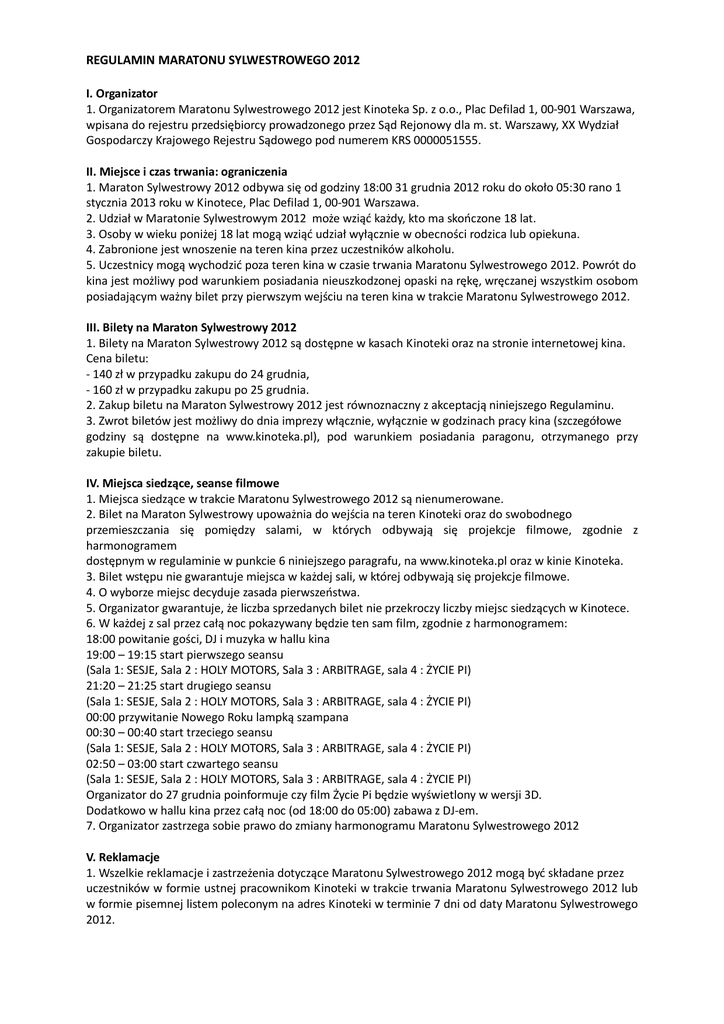 REGULAMIN MARATONU SYLWESTROWEGO 2012 I. Organizator 1. Organizatorem Maratonu Sylwestrowego 2012 jest Kinoteka Sp. z o.o., Plac Defilad 1, 00-901 Warszawa, wpisana do rejestru przedsiębiorcy prowadzonego przez Sąd Rejonowy dla m. st. Warszawy, XX Wydział Gospodarczy Krajowego Rejestru Sądowego pod numerem KRS 0000051555. II. Miejsce i czas trwania: ograniczenia 1. Maraton Sylwestrowy 2012 odbywa się od godziny 18:00 31 grudnia 2012 roku do około 05:30 rano 1 stycznia 2013 roku w Kinotece, Plac Defilad 1, 00-901 Warszawa. 2. Udział w Maratonie Sylwestrowym 2012 może wziąć każdy, kto ma skończone 18 lat. 3. Osoby w wieku poniżej 18 lat mogą wziąć udział wyłącznie w obecności rodzica lub opiekuna. 4. Zabronione jest wnoszenie na teren kina przez uczestników alkoholu. 5. Uczestnicy mogą wychodzić poza teren kina w czasie trwania Maratonu Sylwestrowego 2012. Powrót do kina jest możliwy pod warunkiem posiadania nieuszkodzonej opaski na rękę, wręczanej wszystkim osobom posiadającym ważny bilet przy pierwszym wejściu na teren kina w trakcie Maratonu Sylwestrowego 2012. III. Bilety na Maraton Sylwestrowy 2012 1. Bilety na Maraton Sylwestrowy 2012 są dostępne w kasach Kinoteki oraz na stronie internetowej kina. Cena biletu: - 140 zł w przypadku zakupu do 24 grudnia, - 160 zł w przypadku zakupu po 25 grudnia. 2. Zakup biletu na Maraton Sylwestrowy 2012 jest równoznaczny z akceptacją niniejszego Regulaminu. 3. Zwrot biletów jest możliwy do dnia imprezy włącznie, wyłącznie w godzinach pracy kina (szczegółowe godziny są dostępne na www.kinoteka.pl), pod warunkiem posiadania paragonu, otrzymanego przy zakupie biletu. IV. Miejsca siedzące, seanse filmowe 1. Miejsca siedzące w trakcie Maratonu Sylwestrowego 2012 są nienumerowane. 2. Bilet na Maraton Sylwestrowy upoważnia do wejścia na teren Kinoteki oraz do swobodnego przemieszczania się pomiędzy salami, w których odbywają się projekcje filmowe, zgodnie z harmonogramem dostępnym w regulaminie w punkcie 6 niniejszego paragrafu, na www.kinoteka.pl oraz w kinie Kinoteka. 3. Bilet wstępu nie gwarantuje miejsca w każdej sali, w której odbywają się projekcje filmowe. 4. O wyborze miejsc decyduje zasada pierwszeństwa. 5. Organizator gwarantuje, że liczba sprzedanych bilet nie przekroczy liczby miejsc siedzących w Kinotece. 6. W każdej z sal przez całą noc pokazywany będzie ten sam film, zgodnie z harmonogramem: 18:00 powitanie gości, DJ i muzyka w hallu kina 19:00 – 19:15 start pierwszego seansu (Sala 1: SESJE, Sala 2 : HOLY MOTORS, Sala 3 : ARBITRAGE, sala 4 : ŻYCIE PI) 21:20 – 21:25 start drugiego seansu (Sala 1: SESJE, Sala 2 : HOLY MOTORS, Sala 3 : ARBITRAGE, sala 4 : ŻYCIE PI) 00:00 przywitanie Nowego Roku lampką szampana 00:30 – 00:40 start trzeciego seansu (Sala 1: SESJE, Sala 2 : HOLY MOTORS, Sala 3 : ARBITRAGE, sala 4 : ŻYCIE PI) 02:50 – 03:00 start czwartego seansu (Sala 1: SESJE, Sala 2 : HOLY MOTORS, Sala 3 : ARBITRAGE, sala 4 : ŻYCIE PI) Organizator do 27 grudnia poinformuje czy film Życie Pi będzie wyświetlony w wersji 3D. Dodatkowo w hallu kina przez całą noc (od 18:00 do 05:00) zabawa z DJ-em. 7. Organizator zastrzega sobie prawo do zmiany harmonogramu Maratonu Sylwestrowego 2012 V. Reklamacje 1. Wszelkie reklamacje i zastrzeżenia dotyczące Maratonu Sylwestrowego 2012 mogą być składane przez uczestników w formie ustnej pracownikom Kinoteki w trakcie trwania Maratonu Sylwestrowego 2012 lub w formie pisemnej listem poleconym na adres Kinoteki w terminie 7 dni od daty Maratonu Sylwestrowego 2012.