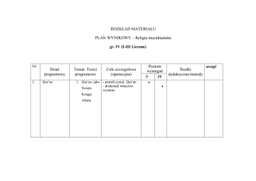 ROZKŁAD MATERIAŁU PLAN WYNIKOWY – Religia muzułmańska gr. IV (I-III Liceum) Lp. Dział programowy 1. Qur’an Temat. Treści programowe Cele szczegółowe (operacyjne) 1. Qur’an jako - potrafi czytać Qur’an - doskonali właściwe Święta czytanie Księga Allaha Poziom wymagań p pp Środki dydaktyczne/metody uwagi 2. Powtórzenie i - zna na pamięć sprawdzenie wymienione sury, znajomości sur z kl. I-III - zna ich znaczenie, 3-4. Nauka sury Al-Ghaszija 5-6. Nauka sury Al-‘Ala 7-8. Nauka sury At-Tarik 9-10. Nauka sury Al-Burudż - zna powód objawienia sury, - rozumie znaczenie sury, - zna surę na pamięć, - umie czytać surę z Our’anu, - doskonali recytację 7. Nauka sury Al-Insziqaq Nauka sur obejmuje naukę po 3 sury w każdej klasie (kl. 1, kl. 2 i kl. 3). Na każda surę przeznacz amy dwie jednostki lekcyjne - zna zasady tadżwidu 11-12. Nauka sury AlMutaffifin 13-14. Nauka sury At-Takwir 15-16. Nauka sury Abasa - rozumie przesłanie płynące z wersetów 2 Sira – historia życia proroka Muhammada 17. Wybrane przykłady życia proroka - wie, jak należy postępowac na podstawie przykładów z życia proroka - 3. Wiedza o Qur’anie 18. 19. 20. 21. 22. 23. 24. 25. 26. 4. Doktryna 27. Filary islamu. 28. 29. - zna filary islamu, - zna ich znaczenie - rozumie, co oznacza post, - wie, kiedy post jest obowiązkowy (w ramadanie), - wie, kiedy można pościć nadobowiązkowo, - rozumie, co oznacza sunna proroka - wie, które modlitwy są obowiązkowe, - zna pojęcie fard, - rozumie znaczenie modlitwy - zna pojęcie sunna, nafila - wie, kiedy można odprawiać modlitwy sunnowe, - rozumie znaczenie praktykowania sunny - wie, co oznacza sadaka, - wie, co to jest jałmuzna, - rozumie znaczenie tego filaru islamu - zna pojęcie hadżdż, umra, - zna zasady odbycia pielgrzymki, - na znaczenie obrzędu - wie, kiedy jest odprawiana modlitwa świąteczna, - zna zasady odprawiania modlitwy świątecznej, 5. Hadisy (sunna proroka) 30. Hadis nr 2. 31. Hadis quasi 24. - wie, jak jest rola imama, - wie, jakie zadania ma imam, - rozumie doniosłą rolę jaka spełnia imam - rozumie pojęcie sunny w islamie, - rozumie pojęcie fitna - rozumie, co oznacza fitna - rozumie znaczenie przesłania proroka (Hadis zamieszczony w czasopiśmie As-Salam, nr 6) Hadisy Quasi nr 24, s. 29 32. Hadis quasi nr 36. 33. Hadis quasi nr 40 - rozumie znaczenie przesłania proroka - rozumie znaczenie przesłania proroka - zna historię niektórych 34. Z historii życia proroków: Mojżes z Jezus (nazarejczycy, ebionici) Hadisy Quasi nr 36, s. 39. posłańców Boga - wie, jaką misją obdarzył ich Allah, - rozumie związek pomiędzy wszystkimi prorokami -rozumie różnice pomiędzy naśladowcami proroków, np. Hadisy Quasi nr 40, s. 45. 6. Nauka o hadisach. 35. 36. 37. 38. 39. 40. 41 42. 43. . Abraham Ismail Izaak nazarejczykami a ebonitami Cele szaria 44. 7. 45. 46. 8. Ekonomia muzułmańska 47. 48. 49. 9. Rodzina w islamie 50. 51. 52. 53. 10. Historia świata muzułmańskiego 54. 55. 56.