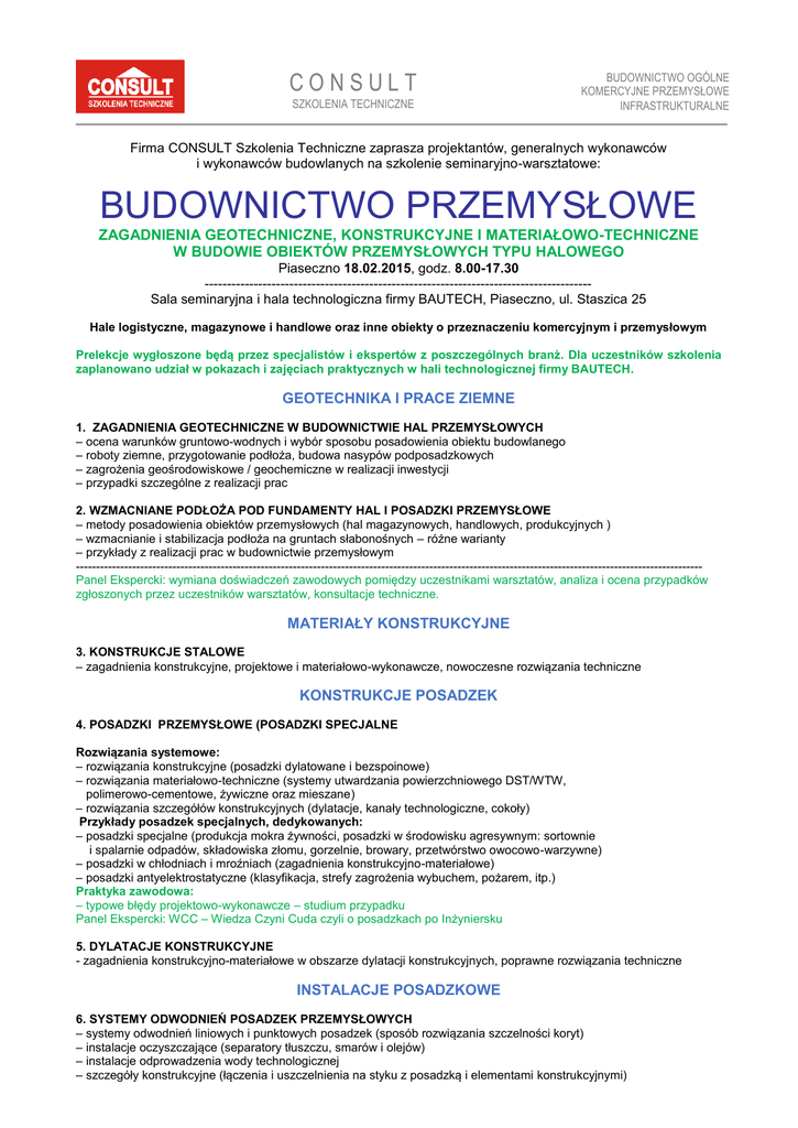CONSULT SZKOLENIA TECHNICZNE BUDOWNICTWO OGÓLNE KOMERCYJNE PRZEMYSŁOWE INFRASTRUKTURALNE Firma CONSULT Szkolenia Techniczne zaprasza projektantów, generalnych wykonawców i wykonawców budowlanych na szkolenie seminaryjno-warsztatowe: BUDOWNICTWO PRZEMYSŁOWE ZAGADNIENIA GEOTECHNICZNE, KONSTRUKCYJNE I MATERIAŁOWO-TECHNICZNE W BUDOWIE OBIEKTÓW PRZEMYSŁOWYCH TYPU HALOWEGO Piaseczno 18.02.2015, godz. 8.00-17.30 --------------------------------------------------------------------------------------Sala seminaryjna i hala technologiczna firmy BAUTECH, Piaseczno, ul. Staszica 25 Hale logistyczne, magazynowe i handlowe oraz inne obiekty o przeznaczeniu komercyjnym i przemysłowym Prelekcje wygłoszone będą przez specjalistów i ekspertów z poszczególnych branż. Dla uczestników szkolenia zaplanowano udział w pokazach i zajęciach praktycznych w hali technologicznej firmy BAUTECH. GEOTECHNIKA I PRACE ZIEMNE 1. ZAGADNIENIA GEOTECHNICZNE W BUDOWNICTWIE HAL PRZEMYSŁOWYCH – ocena warunków gruntowo-wodnych i wybór sposobu posadowienia obiektu budowlanego – roboty ziemne, przygotowanie podłoża, budowa nasypów podposadzkowych – zagrożenia geośrodowiskowe / geochemiczne w realizacji inwestycji – przypadki szczególne z realizacji prac 2. WZMACNIANE PODŁOŻA POD FUNDAMENTY HAL I POSADZKI PRZEMYSŁOWE – metody posadowienia obiektów przemysłowych (hal magazynowych, handlowych, produkcyjnych ) – wzmacnianie i stabilizacja podłoża na gruntach słabonośnych – różne warianty – przykłady z realizacji prac w budownictwie przemysłowym -----------------------------------------------------------------------------------------------------------------------------------------------------------Panel Ekspercki: wymiana doświadczeń zawodowych pomiędzy uczestnikami warsztatów, analiza i ocena przypadków zgłoszonych przez uczestników warsztatów, konsultacje techniczne. MATERIAŁY KONSTRUKCYJNE 3. KONSTRUKCJE STALOWE – zagadnienia konstrukcyjne, projektowe i materiałowo-wykonawcze, nowoczesne rozwiązania techniczne KONSTRUKCJE POSADZEK 4. POSADZKI PRZEMYSŁOWE (POSADZKI SPECJALNE Rozwiązania systemowe: – rozwiązania konstrukcyjne (posadzki dylatowane i bezspoinowe) – rozwiązania materiałowo-techniczne (systemy utwardzania powierzchniowego DST/WTW, polimerowo-cementowe, żywiczne oraz mieszane) – rozwiązania szczegółów konstrukcyjnych (dylatacje, kanały technologiczne, cokoły) Przykłady posadzek specjalnych, dedykowanych: – posadzki specjalne (produkcja mokra żywności, posadzki w środowisku agresywnym: sortownie i spalarnie odpadów, składowiska złomu, gorzelnie, browary, przetwórstwo owocowo-warzywne) – posadzki w chłodniach i mroźniach (zagadnienia konstrukcyjno-materiałowe) – posadzki antyelektrostatyczne (klasyfikacja, strefy zagrożenia wybuchem, pożarem, itp.) Praktyka zawodowa: – typowe błędy projektowo-wykonawcze – studium przypadku Panel Ekspercki: WCC – Wiedza Czyni Cuda czyli o posadzkach po Inżyniersku 5. DYLATACJE KONSTRUKCYJNE - zagadnienia konstrukcyjno-materiałowe w obszarze dylatacji konstrukcyjnych, poprawne rozwiązania techniczne INSTALACJE POSADZKOWE 6. SYSTEMY ODWODNIEŃ POSADZEK PRZEMYSŁOWYCH – systemy odwodnień liniowych i punktowych posadzek (sposób rozwiązania szczelności koryt) – instalacje oczyszczające (separatory tłuszczu, smarów i olejów) – instalacje odprowadzenia wody technologicznej – szczegóły konstrukcyjne (łączenia i uszczelnienia na styku z posadzką i elementami konstrukcyjnymi) CONSULT SZKOLENIA TECHNICZNE BUDOWNICTWO OGÓLNE KOMERCYJNE PRZEMYSŁOWE INFRASTRUKTURALNE 7. INSTALACJE GRZEWCZO-CHŁODZĄCE PODPOSADZKOWE – instalacje przeciwoblodzeniowe (rampy podjazdowe, drogi, rurociągi) – instalacje grzewcze (podgrzewane podłogi przemysłowe) – instalacje grzewczo-chłodzące (podgrzewane podłogi przemysłowe) – instalacje chłodnicze (chłodnie, mroźnie) 8. Dobór i montaż regałów w obiektach magazynowych i halowych – prawidłowe wykonanie montażu regałów na przykładach z realizacji/ nadzorów prac (obiekty referencyjne) – typowe błędy projektowo-wykonawcze doboru i montażu regałów w obiektach halowych 9. OCHRONA CIEPLNA W BUDOWNICTWIE HALOWYM W ŚWIETLE NOWYCH WYTYCZNYCH TECHNICZNYCH – MATERIAŁY IZOLACYJNE NOWEJ GENERACJI ----------------------------------------------------------------------------------------------------------------------PROBLEMY PROJEKTOWO WYKONAWCZE W HALOWYM BUDOWNICTWIE PRZEMYSŁOWYM Na rynku funkcjonuje szereg firm oferujących systemy konstrukcyjne i materiały dla budownictwa przemysłowego, różnego rodzaju hal produkcyjnych, magazynowych, handlowych i innych obiektów o przeznaczeniu komercyjnym i przemysłowym. Projektowaniem konstrukcji często połączonym również z jej wykonaniem i montażem zajmują się wyspecjalizowane firmy projektowo-wykonawcze. Jednakże w dalszym ciągu dużym problemem jest właściwe przygotowanie i przeprowadzenie inwestycji od strony geotechnicznej i prac ziemnych, również na gruntach trudnych i słabonośnych, związane z odpowiednim rozpoznaniem i przygotowaniem tych gruntów, wykonaniem fundamentowania pod konstrukcje hal i pod intensywnie eksploatowane posadzki/ podłogi przemysłowe, a także dobór i wykonanie odpowiednich posadzek/ podłóg przemysłowych wraz z infrastrukturą towarzyszącą. Ważnym zadaniem jest również proces kontroli budowy obiektów na każdym etapie ich wznoszenia oraz ścisła współpraca z doświadczonymi firmami. SŁUCHACZE SZKOLENIA: Kierownicza kadra inżynierska i projektowa firm z obszaru przygotowania i realizacji inwestycji budowlanych w lekkim budownictwie przemysłowym, a w szczególności osoby związane z pracami projektowymi, nadzorami i realizacją budów. W szczególności zapraszamy projektantów i architektów, specjalistów planowania i przygotowania inwestycji, kierowników kontraktów, projektów i budów i inspektorów na