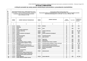 WYKAZ ZAWODÓW szkolnych i pozaszkolnych w których prowadzona jest nauka zawodu u pracodawców rzemieślników - Warszawa,2 lutego 2014 r. WYKAZ ZAWODÓW Nr standardu egzaminacyjnego ZRP w których prowadzi się naukę zawodu młodocianych pracowników u pracodawców rzemieślników 1. 2. 3. 4. 6 8 9 10 11 12 13 14 15 17 18 19 20 21 22 23 24 25 26 27 28 29 Rozporządzenie Ministra Pracy i Polityki Społecznej z dnia 7 sierpnia 2014r. w sprawie klasyfikacji zawodów i specjalności na potrzeby rynku pracy oraz zakresu jej stosowania (Dz.U.14.760 Dz.U.14.1145) Rozporządzenie Ministra Edukacji Narodowej Rozporządzenie Ministra Edukacji Narodowej z dnia 23 grudnia 2011r. w sprawie klasyfikacji zawodów szkolnictwa zawodowego (Dz. U. z 2011 poz. 7, zm. Dz.U. 2014 poz. 1140) Symbol cyfrowy ZAWODY SZKOLNE I POZASZKOLNE Symbol cyfrowy ZAWODY SZKOLNE Obszar kształcenia Typ szkoły Wyodrębnione kwalifikacje w zawodzie 1. 2. 3. 4. 5 6. 7. 721301 721101 blacharz brązownik 721301 - blacharz - M M ZSZ - (K1) - 722101 722102 721104 kowal kowal wyrobów zdobniczych modelarz odlewniczy 722101 721104 kowal modelarz odlewniczy M M M ZSZ ZSZ (K1) (K1, K2) 722204 722307 731101 ślusarz operator obrabiarek skrawających grawer 722204 722307 - ślusarz operator obrabiarek skrawających - M M S ZSZ ZSZ - (K1) (K1) - 731103 731104 mechanik precyzyjny optyk mechanik 731103 731104 mechanik precyzyjny optyk mechanik M M ZSZ ZSZ (K1) (K1) 731301 731106 731305 bursztyniarz zegarmistrz złotnik-jubiler 731106 731305 zegarmistrz złotnik-jubiler S M S ZSZ ZSZ (K1) (K1) 723310 723310 mechanik-monter maszyn i urządzeń M ZSZ (K1) 834103 mechanik-operator pojazdów i maszyn rolniczych M ZSZ (K1, K2) 723103 741203 mechanik-monter maszyn i urządzeń mechanik-operator pojazdów i maszyn rolniczych mechanik pojazdów samochodowych elektromechanik pojazdów samochodowych 723103 741203 mechanik pojazdów samochodowych elektromechanik pojazdów samochodowych M M ZSZ ZSZ (K1) (K1) 721306 713201 713203 blacharz samochodowy lakiernik lakiernik samochodowy 721306 713201 - blacharz samochodowy lakiernik - M M M ZSZ ZSZ - (K1) (K1) - 741201 741208 741205 elektromechanik elektromonter urządzeń dźwignicowych Elektromechanik urządzeń chłodniczych elektromechanik sprzętu gospodarstwa domowego monter elektronik monter elektronik urządzeń radiowo- 741201 - elektromechanik - E E E ZSZ - (K1) - - E - - monter elektronik - E E ZSZ - (K1, K2) - 834103 741204 742102 742112 742102 - 30 31 32 33 34 35 36 37 38 39 40 41 42 43 44 45 46 48 49 50 51 52 53 54 55 56 57 58 59 60 61 62 63 64 65 66 67 68 69 70 71 72 73 74 76 77 78 79 80 82 83 84 814104 711402 711401 711301 712302 731609 712503 731610 712505 731402 731702 752310 731606 752205 731705 711503 752208 753402 731701 732301 732201 731802 753301 731803 731809 753101 753103 753102 753107 753105 753602 753603 753501 753703 753104 753106 753108 753702 753601 753604 753502 751203 512002 512001 751201 751204 751103 751105 731207 731202 711601 711501 WYKAZ ZAWODÓW szkolnych i pozaszkolnych w których prowadzona jest nauka zawodu u pracodawców rzemieślników - Warszawa,2 lutego 2014 r. telewizyjnych wulkanizator M betoniarz zbrojarz 711402 betoniarz zbrojarz B ZSZ (K1) betoniarz B kamieniarz 711301 kamieniarz B ZSZ (K1) sztukator B zdobnik ceramiki M szklarz budowlany B zdobnik szkła M witrażownik S ceramik wyrobów użytkowych i ozdobnych S koszykarz plecionkarz 731702 koszykarz plecionkarz A ZSZ (K1) tokarz w drewnie A pozłotnik S stolarz 752205 stolarz A ZSZ (K1) rzeźbiarz w drewnie A stolarz budowlany B stolarz meblowy A tapicer 753402 tapicer A ZSZ (K1) fajkarz A introligator 732301 introligator A ZSZ (K1) drukarz 732201 drukarz A ZSZ (K1) dziewiarz A hafciarka A koronkarka A tkacz A bieliźniarz A kapelusznik-czapnik A gorseciarka A modystka A krawiec 753105 krawiec A ZSZ (K1) obuwnik 753602 obuwnik A ZSZ (K1) obuwnik miarowy A garbarz skór 753501 garbarz skór A ZSZ (K1) rymarz A kożusznik A kuśnierz 753106 kuśnierz A ZSZ (K1) rękawicznik A kaletnik 753702 kaletnik A ZSZ (K1) cholewkarz A obuwnik ortopedyczny Z garbarz skór bez włosa A karmelarz T kucharz małej gastronomii T kucharz 512001 kucharz T ZSZ (K1) cukiernik 751201 cukiernik T ZSZ (K1) piekarz 751204 piekarz T ZSZ (K1) przetwórca ryb T rzeźnik wędliniarz T organomistrz S monter fortepianów i pianin 311934 technik budowy fortepianów i pianin S T (K1, K2) brukarz B cieśla 711501 cieśla B ZSZ (K1) 85 86 87 88 89 90 91 92 93 94 95 96 97 98 99 104 105 712101 741103 712603 712604 712401 713101 711202 712204 712615 711203 712202 712203 343101 514101 713303 753505 106 107 108 109 112 113 114 116 120 123 124 712608 712610 712612 818116 712403 721303 722308 712903 731302 711204 125 126 127 712616 751107 723107 712904 712905 WYKAZ ZAWODÓW szkolnych i pozaszkolnych w których prowadzona jest nauka zawodu u pracodawców rzemieślników - Warszawa,2 lutego 2014 r. dekarz 712101 dekarz B ZSZ (K1) elektryk 741103 elektryk E ZSZ (K1, K2) monter instalacji gazowych B monter instalacji i urządzeń sanitarnych B monter izolacji budowlanych 712401 monter izolacji budowlanych B ZSZ (K1) malarz tapeciarz B murarz B posadzkarz B studniarz B zdun 711203 zdun B ZSZ (K1) glazurnik B parkieciarz B fotograf 343101 fotograf A ZSZ (K1) fryzjer 514101 fryzjer A ZSZ (K1 kominiarz 713303 kominiarz B ZSZ (K1) garbarz skór futerkowych technolog robót wykończeniowych w B budownictwie monter sieci cieplnych B monter sieci gazowych B monter sieci wodnych i kanalizacyjnych B operator urządzeń przemysłu szklarskiego 818116 operator urządzeń przemysłu szklarskiego A ZSZ (K1) monter izolacji przemysłowych 712403 monter izolacji przemysłowych B ZSZ (K1) blacharz izolacji przemysłowych 721303 blacharz izolacji przemysłowych B ZSZ (K1) operator obrabiarek sterowanych numerycznie M monter konstrukcji budowlanych B metaloplastyk S murarz-tynkarz 711204 murarz-tynkarz B ZSZ (K1) monter zabudowy i robót wykończeniowych w monter zabu