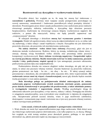 Bezstresowość czy dyscyplina w wychowywaniu dziecka Wszystkie dzieci, bez względu na to, ile mają lat, muszą być traktowane z szacunkiem i godnością. Powinny mieć wpajane zasady postępowania pozwalające na rozwój samooceny, samokontroli i budowanie prawidłowych relacji pomiędzy dziećmi i dorosłymi. Przestrzeganie przez dzieci zasady posłuszeństwa oraz zachowanie przez rodziców równowagi pomiędzy miłością rodzicielską a dyscypliną daje dzieciom poczucie bezpieczeństwa. Zachwianie tej równowagi oznacza kłopoty wychowawcze najpierw dla rodziców, a potem dla nauczycieli, którzy nie będą potrafili zapanować nad „rozpuszczonymi” dziećmi. W relacjach dorosłego z dzieckiem muszą być wyznaczane granice i stawiane wymagania. Dzięki ich egzekwowaniu, dzieci uczą się odpowiedzialności za to, co robią i jak się zachowują, a także relacji i zasad współżycia z innymi. Dyscyplina nie jest skierowana przeciwko dzieciom, ale przeciwko ich niewłaściwemu zachowaniu. Nie należy stosować wobec dzieci kary cielesnej (fizycznej), gdyż nie jest to skuteczna metoda wychowawcza. Rodzice, którzy ją stosują, rozładowują własne stresy i emocje, okazują swoją bezradność wobec dziecka oraz prezentują niskie poczucie kompetencji wychowawczych. Kary cielesne wywierają negatywny i bezpośredni wpływ na rozwój psychiczny dziecka. Skutki stosowania tych kar to niska samoocena, poczucie wstydu i winy, podwyższony stopień agresji (w tym autoagresja), poczucie odrzucenia, podwyższony poziom lęku oraz nadpobudliwość. Posłuszeństwo dziecka nie oznacza uległości wobec dorosłego, ale gdy tak już się stanie, to utraci ono poczucie własnej wartości. Zacznie buntować się przeciwko rodzicom, głośno protestować: nie będę – bo nie…, nie chcę – bo nie… W takiej sytuacji należy porozmawiać z dzieckiem, aby uświadomiło sobie znaczenie słów, które wypowiedziało. Złe zachowanie zawsze musi się wiązać z konsekwencjami, nawet gdy dziecko będzie musiało trochę pocierpieć i o tym należy pamiętać. Rola dorosłego polega na podejmowaniu działań zmierzających do zmiany zachowania poprzez werbalizowanie swoich oczekiwań, stawianie granic, ponoszenie przez dziecko konsekwencji w przypadku ich przekroczenia, a także udzielanie pomocy w wyciągnięciu wniosków i naprawieniu szkody. Według psychologów drogą do odnoszenia sukcesów jest dyscyplina, a więc umowy, nakazy i zakazy. Pomagają one dziecku w osiągnięciu samodyscypliny, uczą wytrwałości oraz cierpliwości w dążeniu do osiągnięcia celu. Akceptowanie potrzeb (uczuć) dziecka, wiara w jego możliwości (zdolności), dostrzeganie i wzmacnianie jego starań i mówienie mu o tym uczy poczucia własnej wartości, a także rozwiązywania problemów. Lista zasad, o których należy pamiętać w postępowaniu z dzieckiem 1. Wiek dziecka nie może być usprawiedliwieniem jego złego zachowania. Małe dzieci uczą się właściwego zachowania poprzez doświadczenie, a nie tylko poprzez to, co słyszą. Dlatego bez względu na wiek testują ustalone przez dorosłych granice, próbując w ten sposób dowiedzieć się, jakimi prawami rządzi się otaczająca je rzeczywistość. 2. Wszystkie dzieci próbują wymuszać na dorosłych różne rzeczy płaczem i krzykiem. Zwracając im uwagę na niewłaściwe zachowanie, zawsze należy mówić spokojnym, opanowanym głosem. Nie trzeba krzyczeć, bo dziecko w naturalny sposób będzie starało się dorosłego przekrzyczeć. Tylko spokojne mówienie pozwoli mu skupić się na tym, co dorosły mówi. 3. Zwracając uwagę dziecku, należy się posługiwać prostym komunikatem. 4. Należy dziecku ustalać granice!!! 5. Gdy dorosły popełni błąd, powinien się do niego przyznać i uznać rację dziecka. Wówczas nabierze ono przekonania, że dorosły jest sprawiedliwy. 6. Dorosły musi być konsekwentny w postępowaniu z dzieckiem wtedy, gdy: - nakłada na dziecko karę (nie należy jej zapowiadać ani odraczać, lecz wykonać); - składa obietnicę (zawsze należy dotrzymywać słowa). Konsekwentne postępowanie dorosłego daje dziecku poczucie bezpieczeństwa i przyczynia się do budowania jego autorytetu. 7. Dyscyplinę stosuje się głównie po to, aby nauczyć dziecko poprawnego zachowania, a nie po to, aby je ukarać. Jeżeli kara jest konieczna, to najlepiej, gdyby spośród zaproponowanych przez dorosłego kar dziecko wybrało ją sobie samo. Źródło informacji: - publikacje autora powiedzenia „ Bezstresowe wychowanie” - Benjamina Spock.
