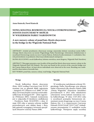 Przegląd Przyrodniczy XXVI, 1 (2015): 57-60 Anna Kmiecik, Paweł Kmiecik NOWA KOLONIA ROZRODCZA NOCKA ŁYDKOWŁOSEGO MYOTIS DASYCNEME W MOŚCIE W WIGIERSKIM PARKU NARODOWYM A new nursery colony of pond bats Myotis dasycneme in the bridge in the Wigierski National Park ABSTRAKT: Artykuł przedstawia obserwacje nowego stanowiska kolonii rozrodczej nocka łydkowłosego Myotis dasycneme na terenie Wigierskiego Parku Narodowego. Schronienie zlokalizowano w szczelinach betonowego mostu na rzece Czarna Hańcza. Kolonia liczyła minimum 11 osobników. Rozród potwierdzono na podstawie obserwacji młodocianych nietoperzy. SŁOWA KLUCZOWE: nocek łydkowłosy, kolonia rozrodcza, most drogowy, Wigierski Park Narodowy ABSTRACT: This paper presents a new locality of the pond bat Myotis dasycneme nursery colony in the Wigierski National Park (NE Poland). The roost was found in the crevices of the concrete bridge over the Czarna Hańcza River. At least eleven individuals were observed in the roost. Breeding was confirmed by observation of juvenile bats. KEY WORDS: pond bats, nursery colony, road bridge, Wigierski National Park Wstęp Nocek łydkowłosy Myotis dasycneme (Boie, 1825) według Czerwonej Listy IUCN uważany jest za gatunek bliski zagrożenia – kategoria NT (Hutson et al. 2008). W Polskiej czerwonej księdze zwierząt został zaklasyfikowany do kategorii EN – silnie zagrożony (Wołoszyn 2001). Gatunek wymieniony jest w załączniku II dyrektywy siedliskowej – Dyrektywy Rady 92/43/EWG z dnia 21 maja 1992 roku w sprawie ochrony siedlisk przyrodniczych oraz dzikiej fauny i flory, jako gatunek wymagający tworzenia specjalnych obszarów ochrony Natura 2000. Wyniki W wyniku prac nad planem ochrony Wigierskiego Parku Narodowego oraz planem zadań ochronnych dla obszaru Natura 2000 „Ostoja Wigierska” (Pojezierze Suwalskie) prowadzonych w 2012 roku odnaleziono schronienie nowej kolonii rozrodczej nocka łydkowłosego. W dniu 13.07.2012 roku w szczelinach pomiędzy betonowymi elementami mostu drogowego na rzece Czarna Hańcza (fot. 1) w miejscowości Czerwony Folwark (N54º4’10,48”, E23º7’2,62”) zlokalizowano przynajmniej 11 osobników nocka łydkowłosego. Nietoperze zajęły szczeliny 57 Przegląd Przyrodniczy XXVI, 1 (2015) w środkowej części mostu, w miejscu, gdzie rzeka była najgłębsza. Niewykluczone, że kolonia ta była liczniejsza, ponieważ nietoperze chowały się w niedostępnych dla badaczy szczelinach. Zwierzęta występowały pojedynczo oraz po 2 lub 3 osobniki. Po ubarwieniu futra można było odróżnić dorosłe nietoperze od szarych osobników młodocianych. Pięć z nich nie opuściło schronienia w trakcie nocy, w której przeprowadzono nieudaną próbę ich odłowienia. Mogły to być nielotne lub uczące się latać nocki. Wszystkie te obserwacje wskazują, że była to kolonia rozrodcza lub kolonia satelitarna, czyli część większej kolonii rozrodczej. Dyskusja i wnioski Nocek łydkowłosy wykazuje silny związek z dużymi jeziorami i rzekami, które są dla niego głównymi miejscami żerowania. Pokarm nocka łydkowłosego to owady chwytane najczęściej z powierzchni wody, głównie muchówki Diptera z rodziny ochotkowatych Chironomidae (Ciechanowski i Zapart 2012). Jezioro Wigry i rzeka Czarna Hańcza oraz ich otoczenie pod względem wymagań siedliskowych są dogodnym środowiskiem dla funkcjonowania tego wymagającego i rzadkiego gatunku. Na terenie Parku i jego otuliny w latach 2004-2007 prowadzono badania w okresie rozrodu i wychowywania młodych. Ich rezultatem było m.in. stwierdzenie rozrodu nocka łydkowłosego na podstawie odłowienia młodocianego samca na przesmyku między Jeziorami Wigry i Okrągłe. Ponadto na tym samym stanowisku odłowiono dorosłego samca, a na rzece Czarna Hańcza w Budzie Ruskiej dorosłą samicę (Kmiecik et al. 2010). Gatunek ten jest jednym z najrzadziej obserwowanych krajowych gatunków nietoperzy. Tylko na kilkunastu stanowiskach odnotowano jego rozród. Większość obserwacji rozrodu została oparta na odłowieniu bądź bezpośredniej obserwacji karmiących samic lub osobników młodocianych poza 58 schronieniami (Ciechanowski et al. 2007). Dotychczas znane były dwie kolonie rozrodcze nocków łydkowłosych: w kościele w Jeleniewie na Suwalszczyźnie oraz na poddaszu leśniczówki w Lubni na Pojezierzu Pomorskim (Wojciechowski et al. 1999, Ciechanowski et al. 2003). Dzięki badaniom radiotelemetrycznym kolonii w Lubni udało się zlokalizować jej nowe, satelitarne kolonie (Zapart et al. 2013, Zapart et al. 2014). Wykorzystywanie kryjówek satelitarnych (tworzenie subkolonii) to charakterystyczna cecha gatunku. Nocki łydkowłose mogą wykorzystywać kryjówki oddalone od głównej kolonii rozrodczej w odległości do 20 km (Haarsma i Tuitert 2009). Niewykluczone, że kolonia pod mostem w Wigierskim Parku Narodowym jest powiązana z inną kolonią rozrodczą w pobliżu Parku, w tym z oddaloną o ok. 20 km w linii prostej kolonią rozrodczą w kościele w Jeleniewie. Do niedawna schronienia nocków łydkowłosych pod mostami uważane były za typowe kryjówki samców, które często w okresie rozrodu przebywają z dala od kolonii rozrodczych (Ciechanowski i Kokurewicz 2004, Sachanowicz i Ciechanowski 2005, Ciechanowski et al. 2007). Podczas badań radiotelemetrycznych prowadzonych na Pojezierzu Pomorskim okazało się, że część karmiących samic z założonymi nadajnikami przeniosła się ze znanej kolonii rozrodczej pod oddalony o 3 km most (Zapart et al. 2014). Obserwacje z Pojezierza Pomorskiego i Wigierskiego PN są potwierdzeniem, że mosty mogą pełnić bardzo ważną rolę dla nocków łydkowłosych nie tylko jako kryjówki samców, ale także jako miejsca przebywania samic z młodymi. Jednym z działań zaproponowanym w ramach uzupełnienia wiedzy o nocku łydkowłosym (przedmiocie ochrony) w planie ochrony Wigierskiego PN są badania radiotelemetryczne, które mogą pozwolić na zlokalizow