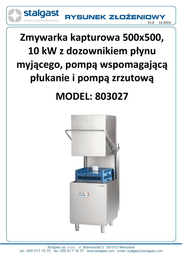 V1.0 12-2015r Zmywarka kapturowa 500x500, 10 kW z dozownikiem płynu myjącego, pompą wspomagającą płukanie i pompą zrzutową MODEL: 803027 LP. Numer katalogowy 1 V803027-01 2 V803027-02 3 V803027-03 4 V803027-04 5 V803027-05 6 V803027-06 7 V803027-07 8 V803027-08 9 V803027-09 10 V803027-10 11 V803027-11 12 V803027-12 13 V803027-13 14 V803027-14 15 V803027-15 16 V803027-16 17 V803027-17 18 V803027-18 19 V803027-19 20 V803027-20 21 V803027-21 22 V803027-22 23 V803027-23 24 V803027-24 25 V803027-25 26 V803027-26 27 V803027-27 28 V803027-28 29 V803027-29 30 V803027-30 31 V803027-31 32 V803027-32 33 V803027-33 34 V803027-34 Nazwa części Króciec do węża pompy Podkładka dystansowa Przewód (5Gx2.5mm2-3m) Stycznik (NC1-12 5,5kW 12A) Dławica Sonda (PT100 L=2000mm) Płyta wykonawcza Panel sterowania Stopka płytki Pompa nabłyszczacza Elektrozawór Opaska zaciskowa (25-40) Opaska zaciskowa (40-60) Nakrętka wirnika Ramię płuczące Przewodnik Kostka przyłączeniowa Kostka przyłączeniowa Łącznik Osprzęt dozownika nabłyszczacza Trójnik wody Wąż gumowy-niebieski (L=2500mm) Wąż gumowy-niebieski (L=300mm) Wąż gumowy (fi 12 L=100mm) Wąż gumowy (fi 12 L=1170mm) Wąż gumowy (fi 12 L=1400mm) Wąż gumowy (fi 12 L=1200mm) Wąż gumowy (fi 12 L=1210mm) Wąż gumowy (fi 12 L=450mm) Wąż gumowy (fi 12 L=600mm) Wąż silikonowy (fi 4 L=220mm) Zawór zwrotny Filtr Pompa perystaltyczna LP. Numer katalogowy 35 V803027-35 36 V803027-36 37 V803027-37 38 V803027-38 39 V803027-39 40 V803027-40 41 V803027-41 42 V803027-42 43 V803027-43 44 V803027-44 45 V803027-45 46 V803027-46 47 V803027-47 48 V803027-48 49 V803027-49 50 V803027-50 51 V803027-51 52 V803027-52 53 V803027-53 54 V803027-54 55 V803027-55 56 V803027-56 57 V803027-57 58 V803027-58 59 V803027-59 60 V803027-60 61 V803027-61 62 V803027-62 63 V803027-63 64 V803027-64 65 V803027-65 66 V803027-66 67 V803027-67 68 V803027-68 Nazwa części Pompa zrzutowa Pompa wspomagająca płukanie Rura Podkładka gumowa Uszczelka ramienia płukania Uszczelka Wąż gumowy (fi 35 L=280) Płytka mocująca Łącznik górny Grzałka komory (3000W 230V) Prowadnica kosza Syfon presostatu Wąż zasilający (L=2000mm) Pierścień osadczy (Z12) Osłona grzałki bojlera Sitko Docisk uszczelki odpływu Uszczelka odpływu Wąż gumowy (fi 50 L=140mm) Korpus wylotu wody Panel zmywarki podblatowej. Czujnik zbliżeniowy Magnes Podparcie rączki Korek spustowy (293mm) Bojler zmywarki (10kW) Wspornik górny Nakrętka Uszczelka odpływu Podkładka (fi21x13x1) Rura (fi45-55) Wąż gumowy (fi 35) Piasta wody do rzutnika Oś dolna wirnika LP. Numer katalogowy 69 V803027-69 70 V803027-70 71 V803027-71 72 V803027-72 73 V803027-73 74 V803027-74 75 V803027-75 76 V803027-76 77 V803027-77 78 V803027-78 79 V803027-79 80 V803027-80 81 V803027-81 82 V803027-82 83 V803027-83 84 V803027-84 85 V803027-85 86 V803027-86 87 V803027-87 88 V803027-88 89 V803027-89 90 V803027-90 91 V803027-91 92 V803027-92 93 V803027-93 Nazwa części Trzpień wirnika (32mm) Pompa wody (1,1kW 230/400V) Presostat Kolano węża przyłączeniowego Wąż przyłączeniowy pompy zrzutowej Stycznik (7,5 kW 18A) Transformator (230V/10V) Osłona gumowa Kabel wstążkowy ze złączami (L=1000mm) Nakrętka ramię myjące Ramię myjące Śruba ramię myjące Opaska zaciskowa (60-80 A2) Przelotka przewodu tworzywo (fi16) Przelotka przewodu (fi13 tw. szt.) Opaska zaciskowa (12-20) Opaska zaciskowa (32-50) Łącznik gumowy (fi 30 L=50mm) Okrągły wspornik gwintowany Wkładka perforowana Kaptur Przysłona kaptura Podstawa zmywarki Komora Rączka LP. Numer katalogowy 94 V803027-94 95 V803027-95 96 V803027-96 97 V803027-97 98 V803027-98 99 V803027-99 100 V803027-100 101 V803027-101 102 V803027-102 103 V803027-103 104 V803027-104 105 V803027-105 106 V803027-106 107 V803027-107 108 V803027-108 109 V803027-109 110 V803027-110 111 V803027-111 112 V803027-112 113 V803027-113 114 V803027-114 115 V803027-115 116 V803027-116 117 V803027-117 118 V803027-118 Nazwa części Ściana tylna Belka nośna lewa Belka nośna prawa Puszka elektryczna Sworzeń Tuleja Łącznik kaptura Pręt gwintowany (M10 L=400) Ślizg Sworzeń Panel przedni Ściana boczna prawa Ściana boczna lewa Osłona tylna Wspornik rolki Osłona górna Wspornik pompy Wspornik panela sterującego Wspornik Wspornik Wspornik prowadnicy Stopka okrągła Śruba pasowana (M8x15) Zawleczka zabezpieczająca (2.5-25) O-ring (10x2,5)