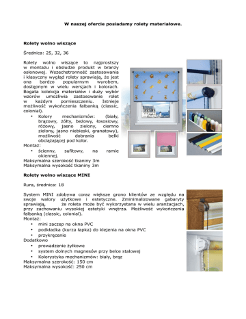 W naszej ofercie posiadamy rolety materiałowe. Rolety wolno wiszące Średnica: 25, 32, 36 Rolety wolno wiszące to najprostszy w montażu i obsłudze produkt w branży osłonowej. Wszechstronność zastosowania i klasyczny wygląd rolety sprawiają, że jest ona bardzo popularnym wyrobem, dostępnym w wielu wersjach i kolorach. Bogata kolekcja materiałów i duży wybór wzorów umożliwia zastosowanie rolet w każdym pomieszczeniu. Istnieje możliwość wykończenia falbanką (classic, colonial). • Kolory mechanizmów: (biały, brązowy, żółty, beżowy, łososiowy, różowy, jasno zielony, ciemno zielony, jasno niebieski, granatowy), możliwość dobrania belki obciążającej pod kolor. Montaż: • ścienny, sufitowy, na ramie okiennej. Maksymalna szerokość tkaniny 3m Maksymalna wysokość tkaniny 3m Rolety wolno wiszące MINI Rura, średnica: 18 System MINI zdobywa coraz większe grono klientów ze względu na swoje walory użytkowe i estetyczne. Zminimalizowane gabaryty sprawiają, że roleta może być wykorzystana w wielu aranżacjach, przy zachowaniu wysokiej estetyki wnętrza. Możliwość wykończenia falbanką (classic, colonial). Montaż: • mini zaczep na okna PVC • podkładka (kurza łapka) do klejenia na okna PVC • przykręcenie Dodatkowo • prowadzenie żyłkowe • system dolnych magnesów przy belce stalowej • Kolorystyka mechanizmów: biały, brąz Maksymalna szerokość: 150 cm Maksymalna wysokość: 250 cm Rozwiązania montażu dla okien z nawiewnikami! - system podkładki PVC tzw. kurzej łapki polegającej na przyklejeniu rolety do ramy okiennej. – system przedłużonego zaczepu PVC lub metalowego. NOWOŚĆ Rolety w kasecie z prowadnicami płaskimi! Wychodząc na przeciw Państwa potrzebie wprowadzamy nowe rozwiązanie: kaseta PVC z płaskimi prowadnicami(kolor biały). Roleta jest montowana na taśmach piankowych. Montaż polega na przyklejeniu do listw przyszybowych. UWAGA listwy muszą być płaskie – w naszych oknach jest to listwa o nazwie „standard” Rolety w kasetach Kaseta AL B-7 i B-17(wersja mini) kaseta, PVC B-9 i B-19 (wersja mini) Rolety w kasecie z prowadnicami AL i PVC Rolety w kasetach z prowadnicami Niezawodne działanie i bezinwazyjny montaż to jedne z wielu zalet systemu. W opcji z rurą nawojową o mniejszej średnicy pozwala na zwinięcie większej ilości materiału. Montowana bezpośrednio na skrzydle okiennym daje idealną osłonę przed silnym światłem słonecznym. • klejone • na uchwytach • do każdej listwy przyszybowej B-7 - AL (biały, brąz) B-9 - PVC (biały, brąz, drewnopodobne) • mahoń • orzech • jasny dąb • ciemny dąb B-17 - mini aluminium zgrabna, elastyczna B-19 - mini PVC - biała, mała