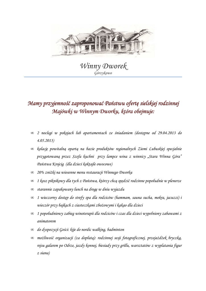 Winny Dworek Górzykowo Mamy przyjemność zaproponować Państwu ofertę sielskiej rodzinnej Majówki w Winnym Dworku, która obejmuje: • 2 noclegi w pokojach lub apartamentach ze śniadaniem (dostępne od 29.04.2013 do 4.05.2013) • kolację powitalną opartą na bazie produktów regionalnych Ziemi Lubuskiej specjalnie przygotowaną przez Szefa kuchni przy lampce wina z winnicy „Stara Winna Góra” Państwa Krojcig (dla dzieci koktajle owocowe) • 20% zniżki na wiosenne menu restauracji Winnego Dworku • 1 kosz piknikowy dla tych z Państwa, którzy chcą spędzić rodzinne popołudnie w plenerze • starannie zapakowany lunch na drogę w dniu wyjazdu • 1 wieczorny dostęp do strefy spa dla rodziców (hammam, sauna sucha, mokra, jacuzzi) i wieczór przy bajkach z ciasteczkami zbożowymi i kakao dla dzieci • 1 popołudniowy zabieg winoterapii dla rodziców i czas dla dzieci wypełniony zabawami z animatorem • do dyspozycji Gości: kije do nordic walking, badminton • możliwość organizacji (za dopłatą): rodzinnej sesji fotograficznej, przejażdżek bryczką, rejsu galarem po Odrze, jazdy konnej, biesiady przy grillu, warsztatów z wyplatania figur z siana) Ponadto zapewniamy: • parking • bezprzewodowy internet • 20 % zniżki na każdy kolejny nocleg w podanym wyżej terminie pakiet dla rodziców 990 zł/2 os. dzieci do lat 3 gratis dzieci od 3 – 13 lat (na dostawce) 249 zł/os W celu uzyskania dodatkowych informacji lub dokonania rezerwacji prosimy o kontakt mailowy lub telefoniczny z recepcją Winnego Dworku. [email protected] tel. 68 385 92 79 wew.10 kom. 694 266 679