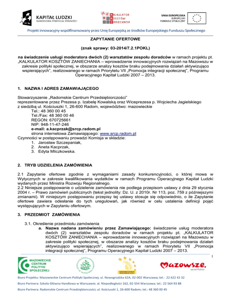 Projekt innowacyjny współfinansowany przez Unię Europejską ze środków Europejskiego Funduszu Społecznego ZAPYTANIE OFERTOWE (znak sprawy: 03-2014/7.2.1POKL) na świadczenie usługi moderatora dwóch (2) warsztatów zespołu doradców w ramach projektu pt. „KALKULATOR KOSZTÓW ZANIECHANIA – wprowadzenie innowacyjnych rozwiązań na Mazowszu w zakresie polityki społecznej, w obszarze analizy kosztów braku podejmowania działań aktywizująco wspierających”, realizowanego w ramach Priorytetu VII „Promocja integracji społecznej”, Programu Operacyjnego Kapitał Ludzki 2007 – 2013. 1. NAZWA I ADRES ZAMAWIAJĄCEGO Stowarzyszenie „Radomskie Centrum Przedsiębiorczości” reprezentowane przez Prezesa p. Izabelę Kowalską oraz Wiceprezesa p. Wojciecha Jagielskiego z siedzibą ul. Kościuszki 1, 26-600 Radom, województwo: mazowieckie Tel.: 48 360 00 45 Tel./Fax: 48 360 00 46 REGON: 670725661 NIP: 948-11-47-246 e-mail: [email protected] strona internetowa Zamawiającego: www.srcp.radom.pl Czynności w postępowaniu prowadzi Komisja w składzie: 1. Jarosław Szczepaniak, 2. Aneta Kacprzak, 3. Edyta Mliczkowska. 2. TRYB UDZIELENIA ZAMÓWIENIA 2.1 Zapytanie ofertowe zgodnie z wymaganiami zasady konkurencyjności, o której mowa w Wytycznych w zakresie kwalifikowania wydatków w ramach Programu Operacyjnego Kapitał Ludzki wydanych przez Ministra Rozwoju Regionalnego. 2.2 Niniejsze postępowanie o udzielenie zamówienia nie podlega przepisom ustawy z dnia 29 stycznia 2004 r. – Prawo zamówień publicznych (tekst jednolity: Dz. U. z 2010r. Nr 113, poz. 759 z późniejszymi zmianami). W niniejszym postępowaniu przepisy tej ustawy stosuje się odpowiednio, o ile Zapytanie ofertowe zawiera odesłanie do tych uregulowań, jak również w celu ustalenia definicji pojęć występujących w Zapytaniu ofertowym. 3. PRZEDMIOT ZAMÓWIENIA 3.1. Określenie przedmiotu zamówienia a. Nazwa nadana zamówieniu przez Zamawiającego: świadczenie usług moderatora dwóch (2) warsztatów zespołu doradców w ramach projektu pt. „KALKULATOR KOSZTÓW ZANIECHANIA – wprowadzenie innowacyjnych rozwiązań na Mazowszu w zakresie polityki społecznej, w obszarze analizy kosztów braku podejmowania działań aktywizująco wspierających”, realizowanego w ramach Priorytetu VII „Promocja integracji społecznej”, Programu Operacyjnego Kapitał Ludzki 2007 – 2013. 1 Biuro Projektu: Mazowieckie Centrum Polityki Społecznej; ul. Nowogrodzka 62A, 02-002 Warszawa; tel.: 22 622 42 32 Biuro Partnera: Szkoła Główna Handlowa w Warszawie; al. Niepodległości 162, 02-554 Warszawa; tel.: 22 564 93 88 Biuro Partnera: Radomskie Centrum Przedsiębiorczości; ul. Kościuszki 1, 26-600 Radom; tel.: 48 360 00 45 Projekt innowacyjny współfinansowany przez Unię Europejską ze środków Europejskiego Funduszu Społecznego b. Rodzaj zamówienia: usługi c. Wspólny Słownik Zamówień CPV: 80500000-9 d. Określenie przedmiotu zamówienia: Szczegółowy opis przedmiotu zamówienia określony został w załączniku nr 1 do niniejszego Zapytania. e. Wykonawca obowiązany jest wykonać zamówienie z zachowaniem najwyższej staranności. f. Wszelkie prace wynikające z przedmiotu zamówienia należy wykonać zgodnie z warunkami opisanymi w Zapytaniu ofertowym, w szczególności zgodnie z warunkami określonymi w projekcie Umowy stanowiącym załącznik nr 3 do Zapytania ofertowego. UWAGA! W przypadku wyboru Wykonawcy, który z uwagi na brak odpowiedniego potencjału odmówi zawarcia Umowy, nie wykona lub nienależycie wykonana zamówienie i w ten sposób spowoduje u Zamawiającego szkodę, Zamawiający będzie dochodził od takiego Wykonawcy odszkodowania. 3.2. Zamawiający nie dopuszcza składania ofert częściowych. 3.3. Zamawiający nie dopuszcza składania Ofert wariantowych. 4. TERMIN WYKONANIA ZAMÓWIENIA Rozpoczęcie realizacji przedmiotu zamówienia – od dnia zawarcia Umowy, Termin zakończenia realizacji przedmiotu zamówienia – do dnia 31 maja 2014 roku. 5. WARUNKI UDZIAŁU W POSTĘPOWANIU 5.1 O udzielenie niniejszego zamówienia mogą ubiegać się Wykonawcy spełniający poniższe kryteria: a. dysponują osobą zdolną do osobistej realizacji zamówienia, która przeprowadziła min. 100 godzin dydaktycznych szkoleń/ warsztatów/ seminariów dla pracowników jednostek samorządu terytorialnego i ich jednostek podległych w ciągu ostatnich 3 lat, b. dysponują odpowiednim potencjałem technicznym oraz zasobami umożliwiającymi wykonanie zamówienia, c. znajdują się w sytuacji finansowej i ekonomicznej, zapewniającej prawidłowe wykonanie zamówienia, d. nie zalegają z opłacaniem podatków, opłat oraz składek na ubezpieczenie zdrowotne i społeczne, e. nie podlegają wykluczeniu ze względu na podstawy, o których mowa w art. 24 ustawy z dnia 29 stycznia 2004 r. – Prawo zamówień publicznych (tekst jednolity: Dz.U. z 2010 r. Nr 113, poz. 759 z późniejszymi zmianami), f. nie są powiązani osobowo lub kapitałowo z Zamawiającym. Przez powiązania kapitałowe lub osobowe rozumie się wzajemne powiązania między Zamawiającym lub osobami upoważnionymi do zaciągania zobowiązań w imieniu Zamawiającego lub osobami wykonującymi w imieniu Zamawiającego czynności związane z przygotowaniem i przeprowadzeniem procedury wyboru Wykonawcy a Wykonawcą, polegające w szczególności na: uczestniczeniu w Spółce jako wspólnik spółki cywilnej lub osobowej; posiadaniu co najmniej 10% udziałów lub akcji; pełnieniu funkcji członka organu nadzorczego lub zarządzającego, pełnomocnika; prokurenta, 2 Biuro Projektu: Mazowieckie Centrum Polityki Społecznej; ul. Nowogrodzka 62A, 02-002 Warszawa; tel.: 22 622 42 32 Biuro Partnera: Szkoła Główna Handlowa w Warszawie; al. Niepodległości 162, 02-554 Warszawa; tel.: 22 564 93 88 Biuro Partnera: Radomskie Centrum Przedsiębiorczości; ul. Kościuszki 1, 26-600 Radom; tel.: 48 360 00 45 Projekt innowacyjny współfinansowany przez Unię