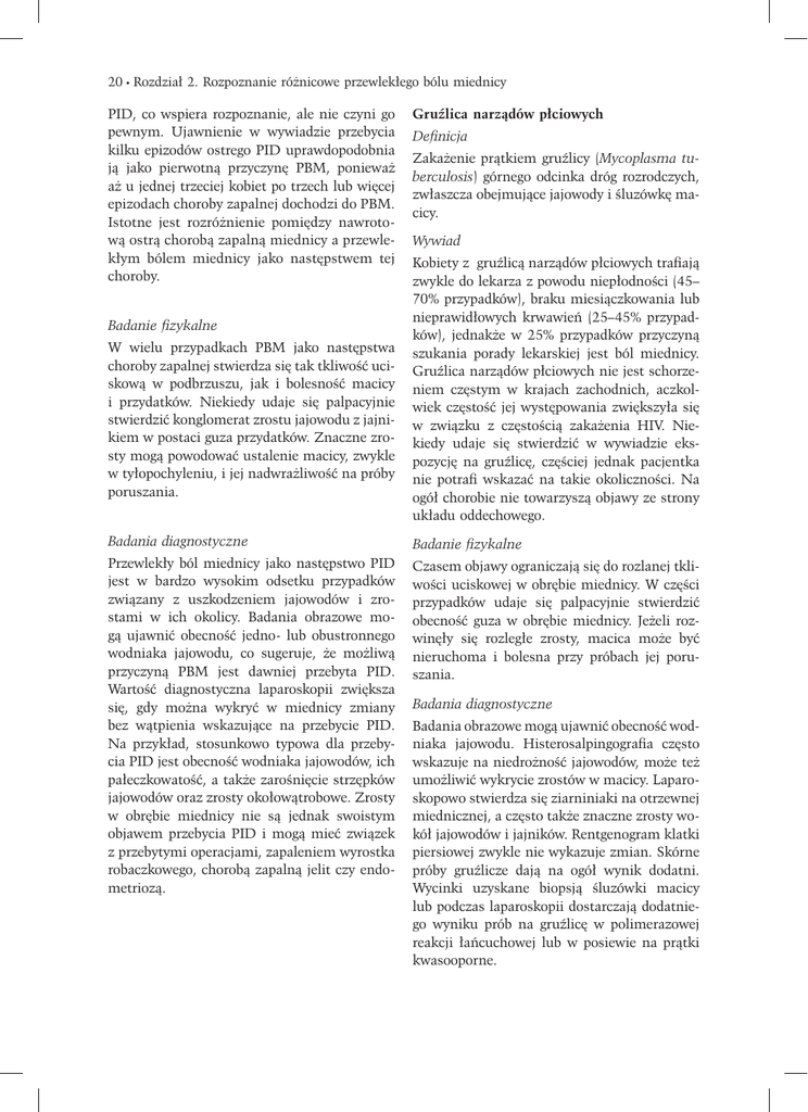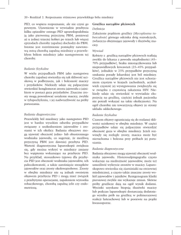 20 · Rozdział 2. Rozpoznanie różnicowe przewlekłego bólu miednicy PID, co wspiera rozpoznanie, ale nie czyni go pewnym. Ujawnienie w wywiadzie przebycia kilku epizodów ostrego PID uprawdopodobnia ją jako pierwotną przyczynę PBM, ponieważ aż u jednej trzeciej kobiet po trzech lub więcej epizodach choroby zapalnej dochodzi do PBM. Istotne jest rozróżnienie pomiędzy nawrotową ostrą chorobą zapalną miednicy a przewlekłym bólem miednicy jako następstwem tej choroby. Badanie fizykalne W wielu przypadkach PBM jako następstwa choroby zapalnej stwierdza się tak tkliwość uciskową w podbrzuszu, jak i bolesność macicy i przydatków. Niekiedy udaje się palpacyjnie stwierdzić konglomerat zrostu jajowodu z jajnikiem w postaci guza przydatków. Znaczne zrosty mogą powodować ustalenie macicy, zwykle w tyłopochyleniu, i jej nadwrażliwość na próby poruszania. Gruźlica narządów płciowych Definicja Zakażenie prątkiem gruźlicy (Mycoplasma tuberculosis) górnego odcinka dróg rozrodczych, zwłaszcza obejmujące jajowody i śluzówkę macicy. Wywiad Kobiety z gruźlicą narządów płciowych trafiają zwykle do lekarza z powodu niepłodności (45– 70% przypadków), braku miesiączkowania lub nieprawidłowych krwawień (25–45% przypadków), jednakże w 25% przypadków przyczyną szukania porady lekarskiej jest ból miednicy. Gruźlica narządów płciowych nie jest schorzeniem częstym w krajach zachodnich, aczkolwiek częstość jej występowania zwiększyła się w związku z częstością zakażenia HIV. Niekiedy udaje się stwierdzić w wywiadzie ekspozycję na gruźlicę, częściej jednak pacjentka nie potrafi wskazać na takie okoliczności. Na ogół chorobie nie towarzyszą objawy ze strony układu oddechowego. Badania diagnostyczne Badanie fizykalne Przewlekły ból miednicy jako następstwo PID jest w bardzo wysokim odsetku przypadków związany z uszkodzeniem jajowodów i zrostami w ich okolicy. Badania obrazowe mogą ujawnić obecność jedno- lub obustronnego wodniaka jajowodu, co sugeruje, że możliwą przyczyną PBM jest dawniej przebyta PID. Wartość diagnostyczna laparoskopii zwiększa się, gdy można wykryć w miednicy zmiany bez wątpienia wskazujące na przebycie PID. Na przykład, stosunkowo typowa dla przebycia PID jest obecność wodniaka jajowodów, ich pałeczkowatość, a także zarośnięcie strzępków jajowodów oraz zrosty okołowątrobowe. Zrosty w obrębie miednicy nie są jednak swoistym objawem przebycia PID i mogą mieć związek z przebytymi operacjami, zapaleniem wyrostka robaczkowego, chorobą zapalną jelit czy endometriozą. Czasem objawy ograniczają się do rozlanej tkliwości uciskowej w obrębie miednicy. W części przypadków udaje się palpacyjnie stwierdzić obecność guza w obrębie miednicy. Jeżeli rozwinęły się rozległe zrosty, macica może być nieruchoma i bolesna przy próbach jej poruszania. Badania diagnostyczne Badania obrazowe mogą ujawnić obecność wodniaka jajowodu. Histerosalpingografia często wskazuje na niedrożność jajowodów, może też umożliwić wykrycie zrostów w macicy. Laparoskopowo stwierdza się ziarniniaki na otrzewnej miednicznej, a często także znaczne zrosty wokół jajowodów i jajników. Rentgenogram klatki piersiowej zwykle nie wykazuje zmian. Skórne próby gruźlicze dają na ogół wynik dodatni. Wycinki uzyskane biopsją śluzówki macicy lub podczas laparoskopii dostarczają dodatniego wyniku prób na gruźlicę w polimerazowej reakcji łańcuchowej lub w posiewie na prątki kwasooporne.