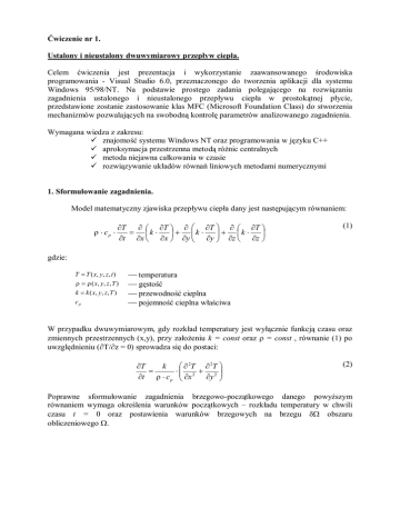 Ćwiczenie nr 1. Ustalony i nieustalony dwuwymiarowy przepływ ciepła. Celem ćwiczenia jest prezentacja i wykorzystanie zaawansowanego środowiska programowania - Visual Studio 6.0, przeznaczonego do tworzenia aplikacji dla systemu Windows 95/98/NT. Na podstawie prostego zadania polegającego na rozwiązaniu zagadnienia ustalonego i nieustalonego przepływu ciepła w prostokątnej płycie, przedstawione zostanie zastosowanie klas MFC (Microsoft Foundation Class) do stworzenia mechanizmów pozwalających na swobodną kontrolę parametrów analizowanego zagadnienia. Wymagana wiedza z zakresu: ü znajomość systemu Windows NT oraz programowania w języku C++ ü aproksymacja przestrzenna metodą różnic centralnych ü metoda niejawna całkowania w czasie ü rozwiązywanie układów równań liniowych metodami numerycznymi 1. Sformułowanie zagadnienia. Model matematyczny zjawiska przepływu ciepła dany jest następującym równaniem: ρ ⋅ cp ⋅ ∂ ∂T ∂ ∂T ∂ ∂T ∂T + k ⋅ = k ⋅ + k ⋅ ∂t ∂x ∂x ∂y ∂y ∂z ∂z (1) gdzie: T = T ( x, y, z , t ) ρ = ρ ( x, y, z , T ) k = k ( x, y , z , T ) cp temperatura gęstość przewodność cieplna pojemność cieplna właściwa W przypadku dwuwymiarowym, gdy rozkład temperatury jest wyłącznie funkcją czasu oraz zmiennych przestrzennych (x,y), przy założeniu k = const oraz ρ = const , równanie (1) po uwzględnieniu (∂T/∂z = 0) sprowadza się do postaci: ∂T k = ∂t ρ ⋅ c p ∂ 2T ∂ 2T ⋅ 2 + 2 ∂y ∂x (2) Poprawne sformułowanie zagadnienia brzegowo-początkowego danego powyższym równaniem wymaga określenia warunków początkowych – rozkładu temperatury w chwili czasu t = 0 oraz postawienia warunków brzegowych na brzegu δΩ obszaru obliczeniowego Ω. Pełny opis matematyczny rozważanego zagadnienia z warunkami brzegowymi typu Dirichleta dany jest następującymi związkami: ∂ 2T ∂ 2T ∂T k x , y ∈ Ω , t > 0 : = ⋅ + ∂t ρ ⋅ c p ∂x 2 ∂y 2 T ( x, y, t = 0) = T0 ( x, y ) x, y ∈ Ω , t = 0 : x, y ∈ δΩ , t > 0 : T ( x, y, t ) = Tbi , i = 1K 4 2. Metoda rozwiązania. Dyskretyzaja przestrzenna równania (2) metodą różnic centralnych II rzędu na siatce obliczeniowej (Rys.1) dla węzła (i,j) sprowadza je do następującej postaci: ∂T k = ∂t ρ ⋅ c p Ti +1, j − 2Ti , j + Ti −1, j Ti , j +1 − 2Ti , j + Ti , j −1 + ⋅ 2 2 ∆ ∆ x y Rys. 1. Siatka obliczeniowa (3) 2.1 Zagadnienie ustalone. W przypadku ustalonego przepływu ciepła (∂T/∂t = 0) równanie (3) sprowadza się do postaci: k ρ ⋅ cp Ti +1, j − 2Ti , j + Ti −1, j Ti , j +1 − 2Ti , j + Ti , j −1 = 0 ⋅ + ∆x 2 ∆y 2 (4) Sformułowanie analogicznych równań dla wszystkich wewnętrznych węzłów siatki obliczeniowej oraz uwzględnienie warunków brzegowych tworzy zamknięty liniowy układ równań, którego rozwiązaniem jest poszukiwany rozkład temperatury w płycie. Przykładowy układ równań dla siatki obliczeniowej przedstawionej na Rys.2 dany jest związkami (5). Rys.2 Siatka obliczeniowa. (5a) A⋅T = B ⇓ 2 2 + ∆x 2 ∆y 2 1 − ∆x 2 0 − − 0 2 2 + 2 2 ∆x ∆y 1 − ∆x 2 2 2 + 2 ∆x ∆y 2 0 0 1 ∆y 2 0 1 ∆y 2 0 1 ∆x 2 − − − 1 ∆x 2 1 ∆y 2 0 − 0 2 2 + ∆x 2 ∆y 2 1 − ∆x 2 0 0 1 − 2 ∆y 0 0 0 0 0 0 0 0 0 0 0 0 − 0 0 0 0 0 1 ∆y 2 0 0 0 0 1 ∆y 2 0 0 1 ∆y 2 0 0 − − 1 ∆x 2 0 2 2 + 2 ∆x ∆y 2 1 − ∆x 2 2 2 + ∆x 2 ∆y 2 0 0 1 ∆y 2 0 1 ∆y 2 − 0 − − 1 ∆x 2 1 ∆y 2 − 0 − 0 2 2 + 2 2 ∆x ∆y 1 − ∆x 2 0 1 ∆y 2 0 − 1 ∆x 2 2 2 + ∆x 2 ∆y 2 1 − ∆x 2 TA T + D2 2 ∆y ∆x TA ∆y 2 TA T + B2 2 ∆y ∆x TD ∆x 2 T2,2 T3,2 T4,2 0 T2,3 0 0 ⋅ T3,3 = T4,3 1 TB − 2 T2,4 ∆y ∆x 2 T3,4 TD T 0 + C2 2 T4,4 ∆x ∆y 1 TC − ∆x 2 ∆y 2 2 2 TC T + 2 + B2 2 2 ∆x ∆y ∆y ∆x 0 (5b)