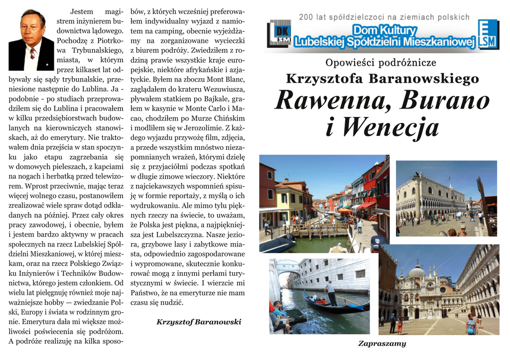 Jestem magi strem inżynierem bu downictwa lądowego. Pochodzę z Piotrko wa Trybunalskiego, miasta, w którym przez kilkaset lat od bywały się sądy trybunalskie, prze niesione następnie do Lublina. Ja podobnie po studiach przeprowa dziłem się do Lublina i pracowałem w kilku przedsiębiorstwach budow lanych na kierowniczych stanowi skach, aż do emerytury. Nie trakto wałem dnia przejścia w stan spoczyn ku jako etapu zagrzebania się w domowych pieleszach, z kapciami na nogach i herbatką przed telewizo rem. Wprost przeciwnie, mając teraz więcej wolnego czasu, postanowiłem zrealizować wiele spraw dotąd odkła danych na później. Przez cały okres pracy zawodowej, i obecnie, byłem i jestem bardzo aktywny w pracach społecznych na rzecz Lubelskiej Spół dzielni Mieszkaniowej, w której miesz kam, oraz na rzecz Polskiego Związ ku Inżynierów i Techników Budow nictwa, którego jestem członkiem. Od wielu lat pielęgnuję również moje naj ważniejsze hobby — zwiedzanie Pol ski, Europy i świata w rodzinnym gro nie. Emerytura dała mi większe moż liwości poświecenia się podróżom. A podróże realizuję na kilka sposo bów, z których wcześniej preferowa łem indywidualny wyjazd z namio tem na camping, obecnie wyjeżdża my na zorganizowane wycieczki z biurem podróży. Zwiedziłem z ro dziną prawie wszystkie kraje euro pejskie, niektóre afrykańskie i azja tyckie. Byłem na zboczu Mont Blanc, zaglądałem do krateru Wezuwiusza, pływałem statkiem po Bajkale, gra łem w kasynie w Monte Carlo i Ma cao, chodziłem po Murze Chińskim i modliłem się w Jerozolimie. Z każ dego wyjazdu przywożę film, zdjęcia, a przede wszystkim mnóstwo nieza pomnianych wrażeń, którymi dzielę się z przyjaciółmi podczas spotkań w długie zimowe wieczory. Niektóre z najciekawszych wspomnień spisu ję w formie reportaży, z myślą o ich wydrukowaniu. Ale mimo tylu pięk nych rzeczy na świecie, to uważam, że Polska jest piękna, a najpiękniej sza jest Lubelszczyzna. Nasze jezio ra, grzybowe lasy i zabytkowe mia sta, odpowiednio zagospodarowane i wypromowane, skutecznie konku rować mogą z innymi perłami tury stycznymi w świecie. I wierzcie mi Państwo, że na emeryturze nie mam czasu się nudzić. Opowieści podróżnicze Krzysztofa Baranowskiego Rawenna, Burano i Wenecja Krzysztof Baranowski Zapraszamy Rawenna, Burano i Wenecja Leżące na wybrzeżu Morza Adria tyckiego Rawenna i Wenecja należą do najczęściej i najliczniej odwiedzanych miast włoskich. Jadąc od strony Bolo nii nie mogłem sobie odmówić przyjem ności wstąpienia do Rawenny i zoba czenia słynnych na cały świat mozaik. Rawenna swoje lata największej świetności miała po roku 402 n.e., gdy stała się stolicą Cesarstwa Zachodnio rzymskiego. Kolejni cesarze rzymscy budowali kościoły, a w nich fundowali wspaniałe mozaiki, zachwycające swy mi kolorami i postaciami ludzkimi do dziś. Niepozorne z zewnątrz, ceglane mury nie zdradzają, że w środku kryją się olśniewające swym pięknem mozai ki. Dzięki tym mozaikom Rawenna na dal pozostaje centrum zachodniej sztu ki, mimo że dawno już straciła rangę stolicy zachodniego świata. Swoje zwiedzanie rozpocząłem od największej w mieście, bazyliki San Vi tale (Św. Witalisa, będącego patronem Rawenny). Bazylika została wzniesiona w VI w. Posiada kształt ośmiokąta, a naj piękniejsze mozaiki znajdują się w ab sydzie i w chórze. Mozaiki zachwycają kolorami i przedstawiają sceny z życia świętych ze Starego Testamentu. Wnę trze całe wyłożone jest marmurami po chodzącymi z różnych miejsc Włoch. Na dziedzińcu obok bazyliki stoi niepozorny budynek będący mauzoleum Galii Placydii. Galia była siostrą cesa rza Honoriusza, a jej syn został cesa rzem Walentynianem III. Mimo że w mauzoleum nie umieszczono szcząt ków Galii, to kaplica grobowa jest arcy dziełem sztuki. Złote mozaiki przedsta wiają Chrystusa jako dobrego pasterza otoczonego stadem owieczek, aposto łów oraz niebo pełne gwiazd. Niedaleko stamtąd znajdziemy nie wielki grobowiec, ale o wielkim znacze niu historycznym, mianowicie grobo wiec Dantego. Walka o szczątki autora „Boskiej komedii” między Florencją a Rawenną trwała ponad sto lat. Do dziś Florencja dostarcza oliwę do lampki pło nącej na grobie Dantego. W kościele Św. Apolinarego zobaczymy mozaiki przed stawiające męczenników i święte dzie wice. Do Burano, leżącego na wysep ce, na lagunie weneckiej, płyniemy stat kiem wycieczkowym. Burano słynie z produkcji koronek, a różnokolorowe domy stojące wzdłuż kanałów cieszą oczy swymi barwami. Przed domami jest wiele kramów i sklepów oferujących koronki. Płyniemy teraz do Wenecji, naj wspanialszego miastamuzeum w hi storii kultury. O Wenecji można by mó wić i pisać tomy. Tam prawie każdy dom ma swoją historię i jest zabytkiem. We necja inspirowała wiele pokoleń poetów, pisarzy i malarzy. Ja rozpoczynam zwie dzanie od Palazzo Ducale (Pałacu Do żów), który był oficjalną siedzibą dożów i rządu z czasów republiki. Przejdziemy od parteru aż do ostatniej kondygnacji, zwiedzając oszałamiające swym prze pychem sale z obrazami namalowany mi przez mistrzów, wiszące na ścianach i na suficie. Na Schodach Gigantów od bywały się kiedyś koronacje dożów. Z Pałacu przechodzimy Mostem Wes tchnień do więzienia, z którego niewie lu skazańców wychodziło na wolność. Do Pałacu przylega wspaniała Bazylika Św. Marka wybudowana w IX w. dla po mieszczenia relikwi ewangelisty. Bazy lika jest zdobiona z zewnątrz i wewnątrz pięknymi złocistymi mozaikami, co po woduje, że często nazywa się ją Bazyli ką Złotą. Na placu Św. Marka mamy jeszcze Campanillę, czyli wysoką na 100 m wieżę widokową, Wieżę Zegaro wą z ruchomymi figurami, oraz dwie XII wieczne kolumny – jedna ze skrzy dlatym lwem symbolem Wenecji, a dru ga z posągiem św. Teodora, patrona mia sta. Zapraszam Krzysztof Bar