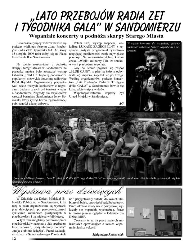 „Lato Przebojów Radia ZET i tygodnika GALA” w Sandomierzu Wspaniałe koncerty u podnóża skarpy Starego Miasta Kilkanaście tysięcy widzów bawiło się podczas wielkiego festynu „Lato Przebojów Radia ZET i tygodnika GALA”, który 15 sierpnia 2009 roku odbył się na Placu Jana Pawła II w Sandomierzu. Na scenie rozstawionej u podnóża skarpy Starego Miasta w Sandomierzu na początku można było zobaczyć występ kabaretu „CIACH”. Imprezę poprowadził popularny i niezwykle dowcipny radiowiec Rafał Bryndal. Organizatorzy przygotowali wiele rożnych konkursów z nagrodami. Jednym z nich był konkurs wiedzy o Sandomierzu. Nagrody dla zwycięzców wręczył burmistrz Sandomierza Jerzy Borowski, który życzył licznie zgromadzonej publiczności udanej zabawy. Potem swój występ rozpoczął wokalista ŁUKASZ ZAGROBELNY z zespołem. Artysta przypomniał żywiołowo reagującej publiczności swoje największe przeboje. Na miłośników dobrej kuchni czekał „Wielki kulinarny TIR” ze smakowitymi przebojami tego lata. Gdy na scenie pojawił się zespół „BLUE CAFE”, to plac na którym odbywała się impreza, zapełnił się po brzegi. Według organizatorów, podczas koncertów „Lata Przebojów Radia ZET i tygodnika GALA” w Sandomierzu bawiło się kilkanaście tysięcy widzów. Współorganizatorem imprezy był Urząd Miejski w Sandomierzu. W czasie koncertu do wspaniałej zabawy zachęcał wokalista Łukasz Zagrobelny z zespołem. AG Podczas wielkiego festynu „Lato Przebojów Radia ZET i tygodnika GALA” na placu u podnóża sandomierskiej Starówki zgromadziło się kilkanaście tysięcy widzów. Wystawa prac dziecięcych W Oddziale dla Dzieci Miejskiej Biblioteki Publicznej w Sandomierzu, kilka razy w roku organizowane są wystawki prac dziecięcych, po przeprowadzanych cyklicznie konkursach plastycznych w przedszkolach i na miejscu w bibliotece. W tym roku mogliśmy podziwiać prace przedszkolaków na temat : „jak spędzałem ferie zimowe”, „mój ulubiony bohater”, „moja ulubiona książka”. Przed wakacjami dzieci z Samorządowego Przedszkola 12 nr 3 przygotowały okładki do swoich ulubionych bajek, opowieści bądź bohaterów. Przedszkolaki miały wiele pomysłów, wykazały się wspaniałą wyobraźnią. Prace te można jeszcze oglądać w Oddziale dla Dzieci MBP. Czekamy teraz na prace naszych milusińskich opowiadające o swoich wspomnieniach z wakacji. Małgorzata Rzeszowiak Przygotowano: Urząd Miejski w Sandomierzu, Plac Poniatowskiego 3, 27-600 Sandomierz, tel. 015 644 01 00, e-mail: [email protected] www.sandomierz.pl 16 W 70. rocznicę wybuchu II wojny światowej Patriotyczne uroczystości na cmentarzu katedralnym Delegacje sandomierskiego samorządu miejskiego i powiatowego, przedstawiciele organizacji kombatanckich, szkół, zakładów pracy i instytucji, uczestniczyli w obchodach 70. rocznicy wybuchu II wojny światowej, które 1 września 2009 roku odbyły się w wojskowej części Cmentarza Katedralnego w Sandomierzu. Uroczystości patriotyczne już tradycyjnie zorganizowano przed pomnikiem 2. Pułku Piechoty Legionów i 4. Pułku Saperów w wojskowej części Cmentarza Katedralnego. W samo południe zawyły syreny alarmowe. Przy dźwiękach pieśni patriotycznych w wykonaniu Miejskiej Młodzieżowej Orkiestry Dętej, a także w asyście kompanii honorowej wojska polskiego z sandomierskiego garnizonu, rozpoczęła się oficjalna część uroczystości. - W dniu obchodów 70. rocznicy tragicznego dnia wybuchu II wojny światowej, uczcijmy minutą ciszy bohaterskich, polskich żołnierzy, W swoim wystąpieniu Burmistrz Sandomierza Jerzy Borowski przypomniał o wojenpoległych i walczących w obronie Ojczyzny nych losach, pełnych poświęcenia i heroizmu, żołnierzy z 2. Pułku Piechoty Legionów, w kampanii wrześniowej 1939 roku, a potem który w okresie międzywojennym stacjonował w Sandomierzu. na różnych frontach oraz wszystkie ofiary tej jeźdźców - zaapelował w swoim przemówieniu Burmistrz Sanwojny, pozbawione życia z rąk niemieckich i sowieckich na- domierza Jerzy Borowski. Gospodarz miasta przypomniał także o wojennych losach, pełnych poświęcenia i heroizmu żołnierzy z 2. Pułku Piechoty Legionów, stacjonującego w okresie międzywojennym w Sandomierzu. - Jego waleczni żołnierze w pełni zasłużyli na laur bohaterów oraz nieśmiertelną aureolę chwały - stwierdził Burmistrz Jerzy Borowski. Delegacje sandomierskiego samorządu miejskiego i powiatowego, przedstawiciele organizacji kombatanckich, szkół, zakładów pracy oraz instytucji, przed pomnikiem 2. Pułku Piechoty Legionów i 4. Pułku Saperów złożyli wieńce i kwiaty. Na zakończenie uroczystości Miejska Młodzieżowa Orkiestra Dęta zagrała wiązankę pieśni wojskowych i patriotycznych. *** Organizatorami uroczystości rocznicowych byli: Burmistrz Sandomierza Jerzy Borowski oraz Delegacja sandomierskich przedszkolaków przed pomnikiem na Cmentarzu Kate- Związek Kombatantów Rzeczypospolitej Polskiej i Byłych Więźniów Politycznych w Sandomierzu. dralnym zapaliła znicze. Zniżki za korzystanie z pływalni, bezpłatny wstęp do mu*** zeów, darmowe wejścia na koncerty, a także rabaty na zakupy Przywileje uczestników programu: w wybranych sklepach odzieżowych i kwiaciarniach - to przy- - bezpłatne wejścia na wystawy stałe i czasowe w zamku wileje, jakie otrzymają rodziny wielodzietne oraz zastępcze i ratuszu z Sandomierza, które przystąpiły do akcji „Nas troje i więcej”. - zniżki za korzystanie z pływalni MOSiR przy ulicy Zielnej Inauguracja programu „Nas troje i więcej” odbyła się 24 - nieodpłatne korzystanie z zajęć muzycznych w CKiR przy sierpnia 2009 roku w sandomierskim Urzędzie Miejskim. Burulicy Portowej mistrz Sandomierza Jerzy Borowski wraz z dyrektorem Ośrod- - bezpłatne zwiedzanie Zbrojowni Rycerskiej ka Pomocy Społecznej, Haliną Komendą, spotkali się z przed- - bezpłatne zwiedzanie 
